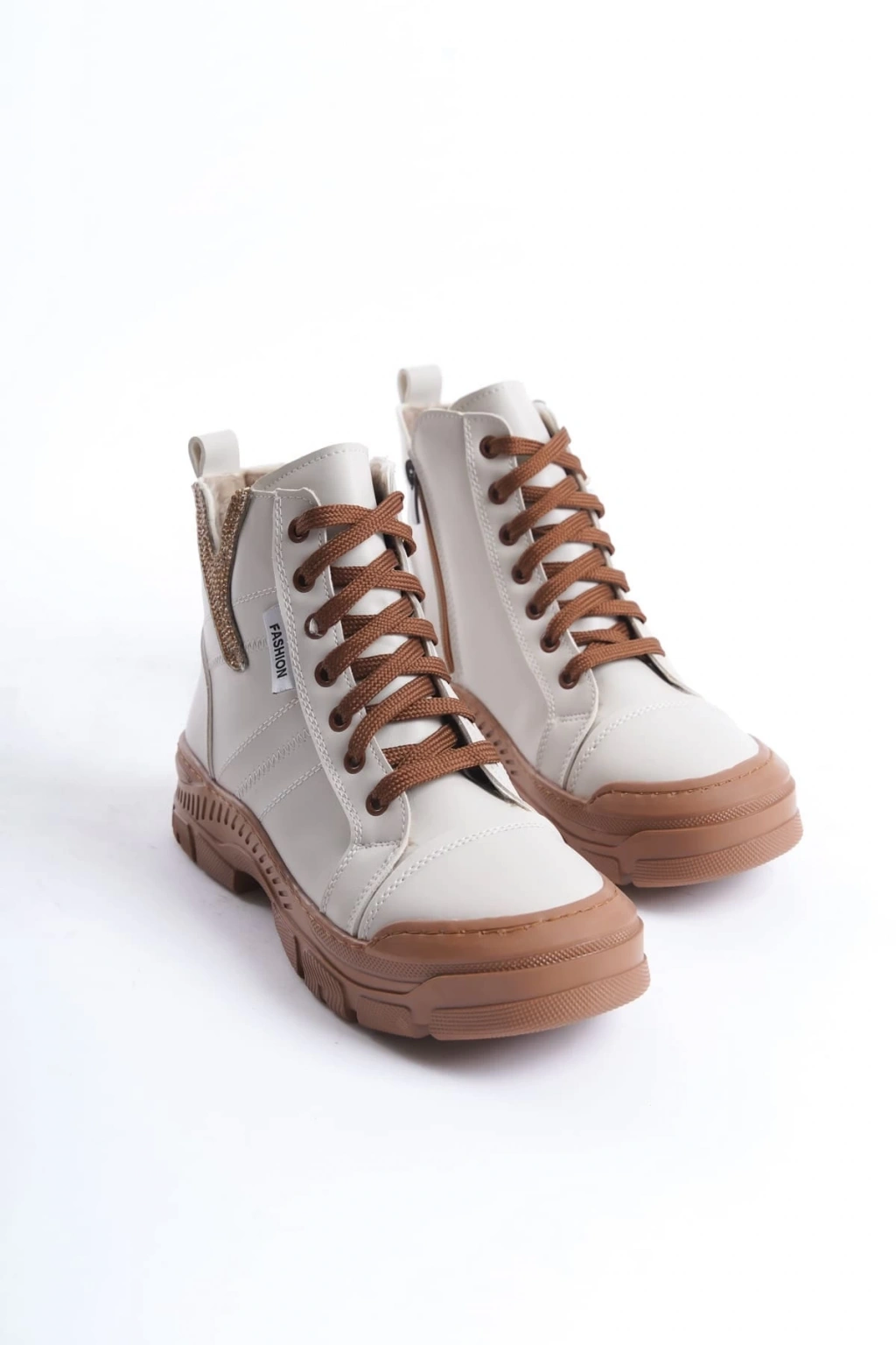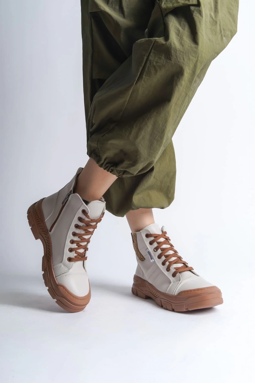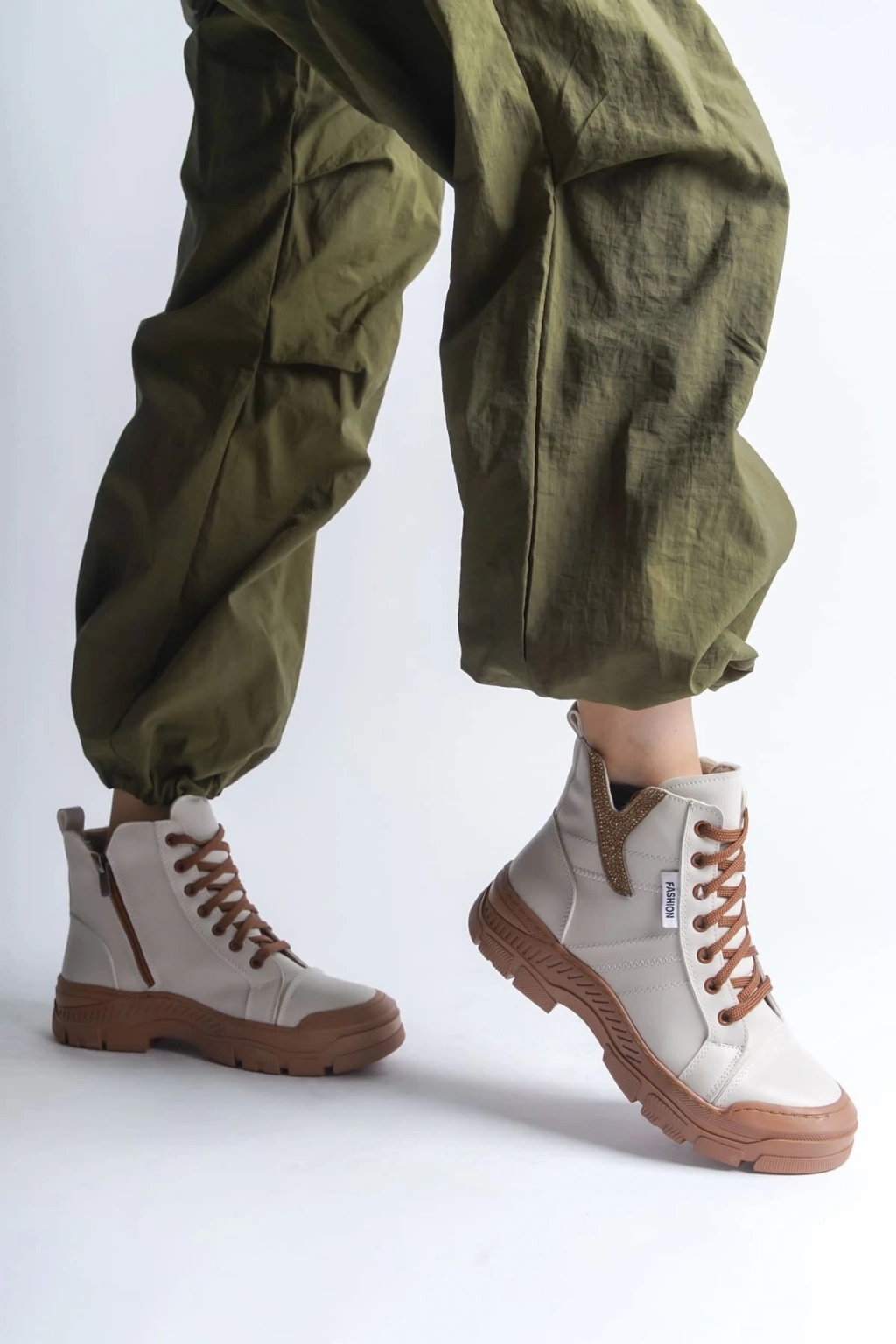 AMBER Bağcıklı Fermuarlı Ortopedik Taban Kadın Bot CTT - Krem