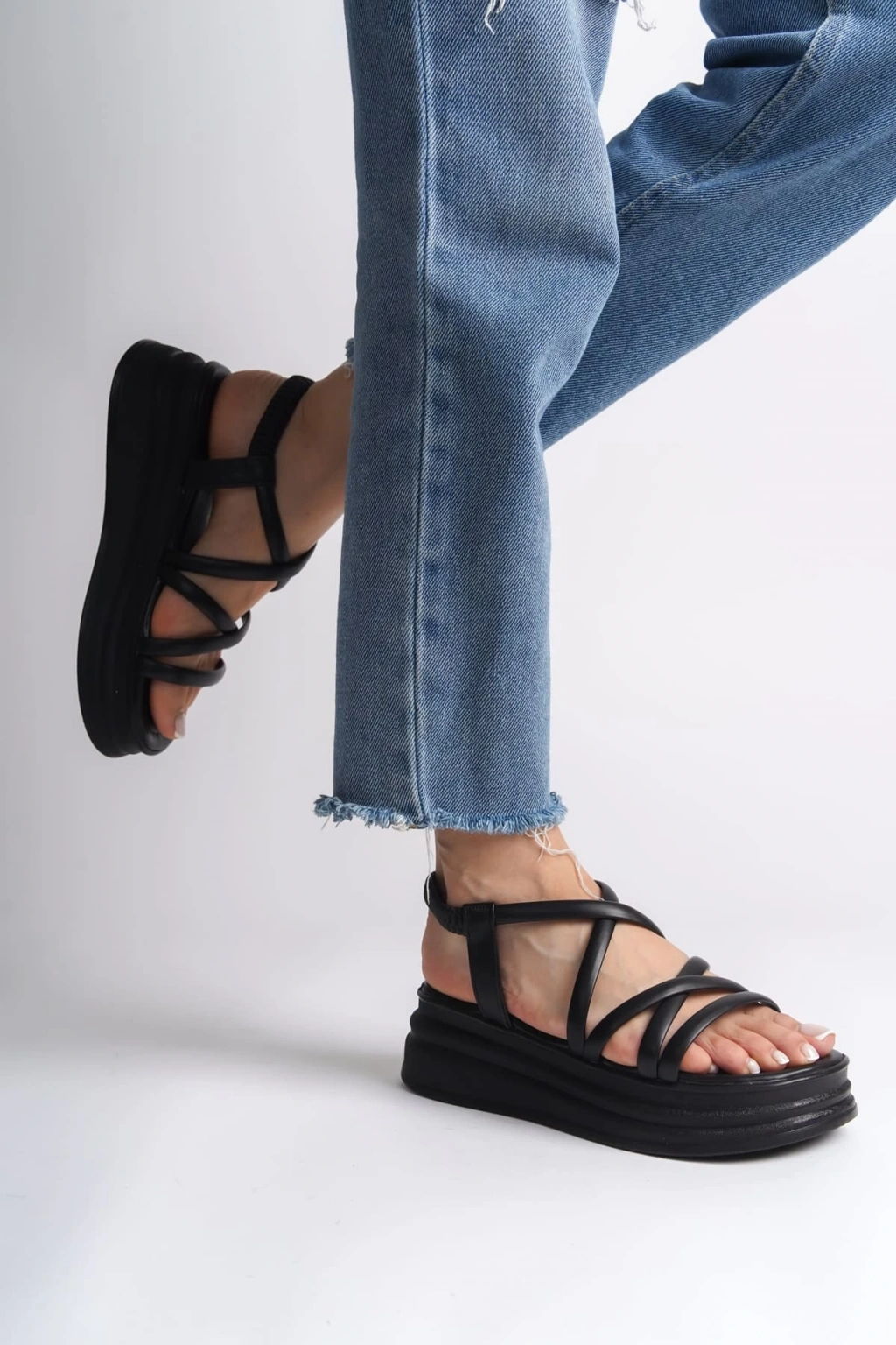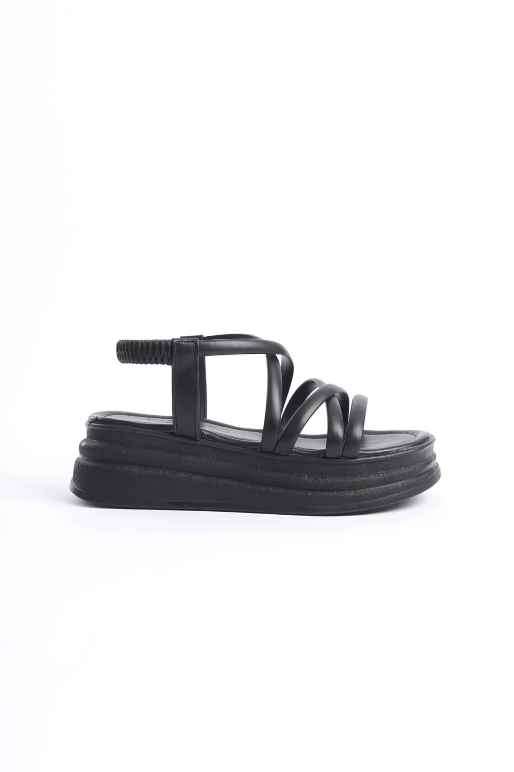 BELLA Lastikli Şerit Detaylı Ortopedik Taban Kadın Sandalet CST - Siyah