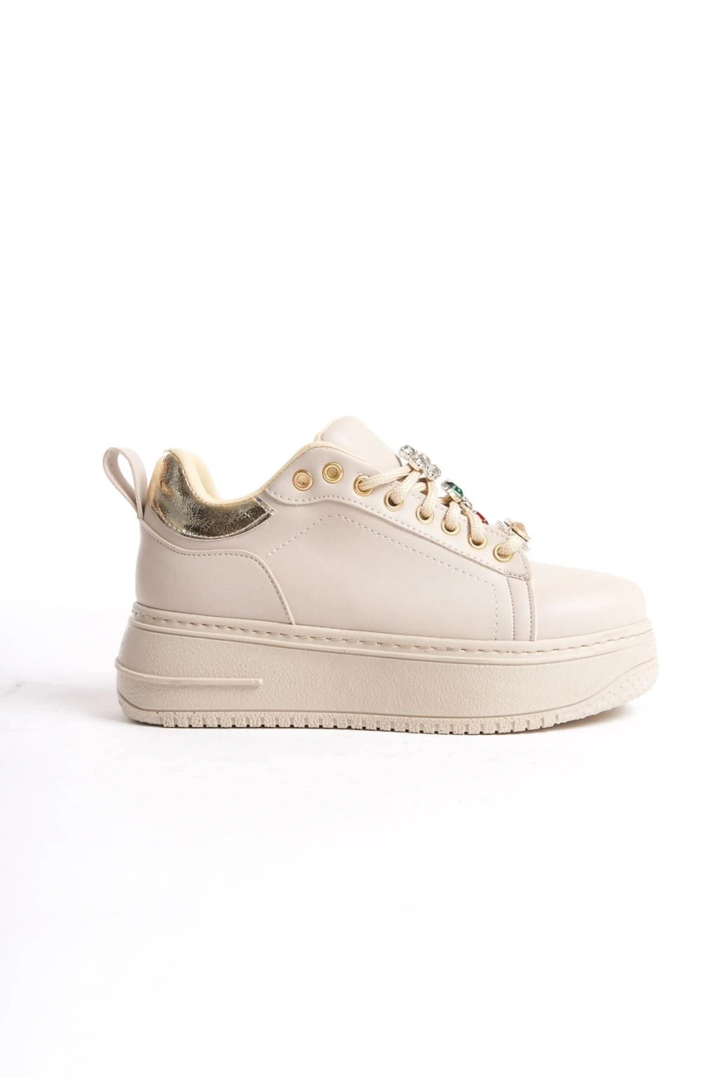 BRIANNA Bağcıklı Ortopedik Taban Renkli Taş Dekorlu Kadın Sneaker Spor Ayakkabı CKT - Krem/Altın