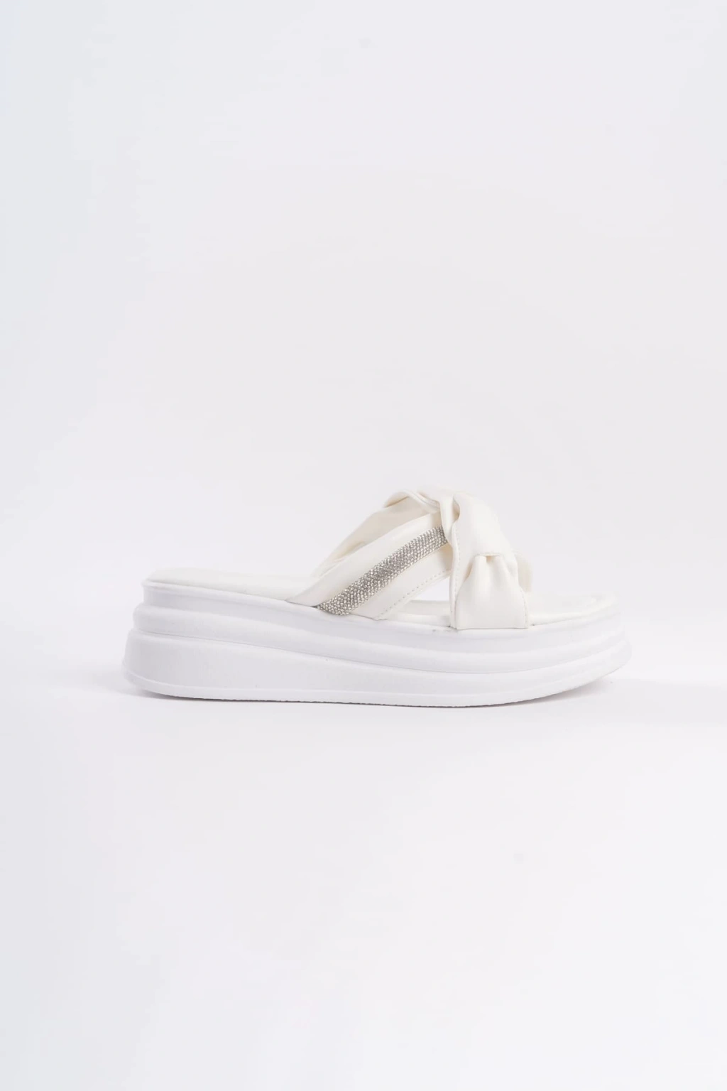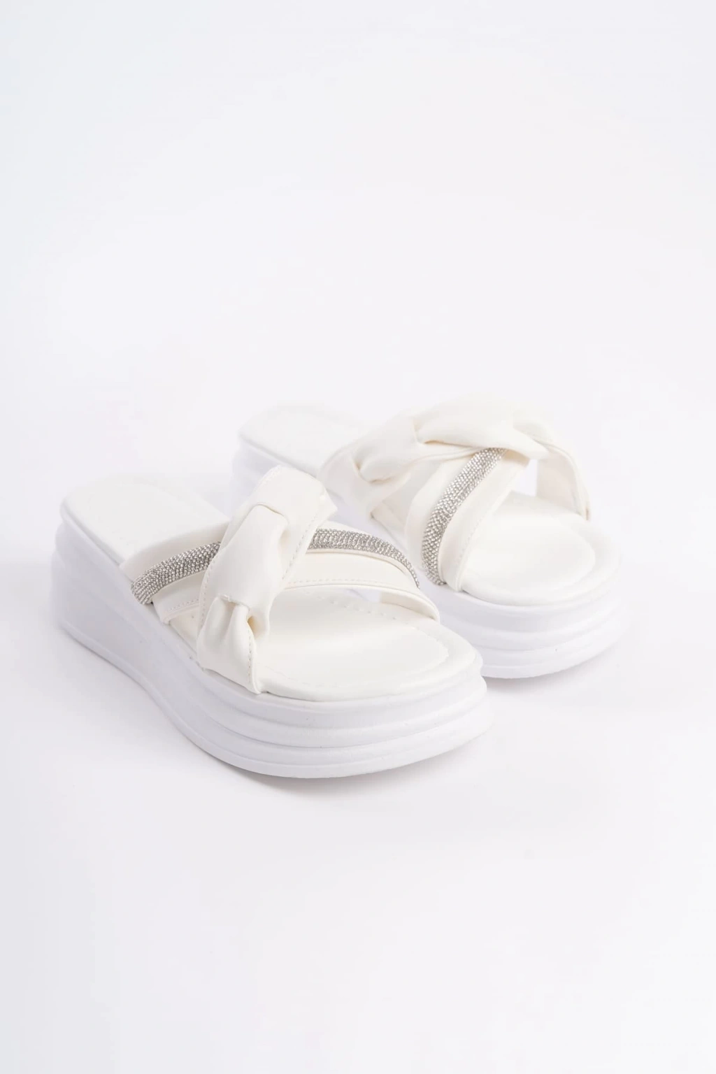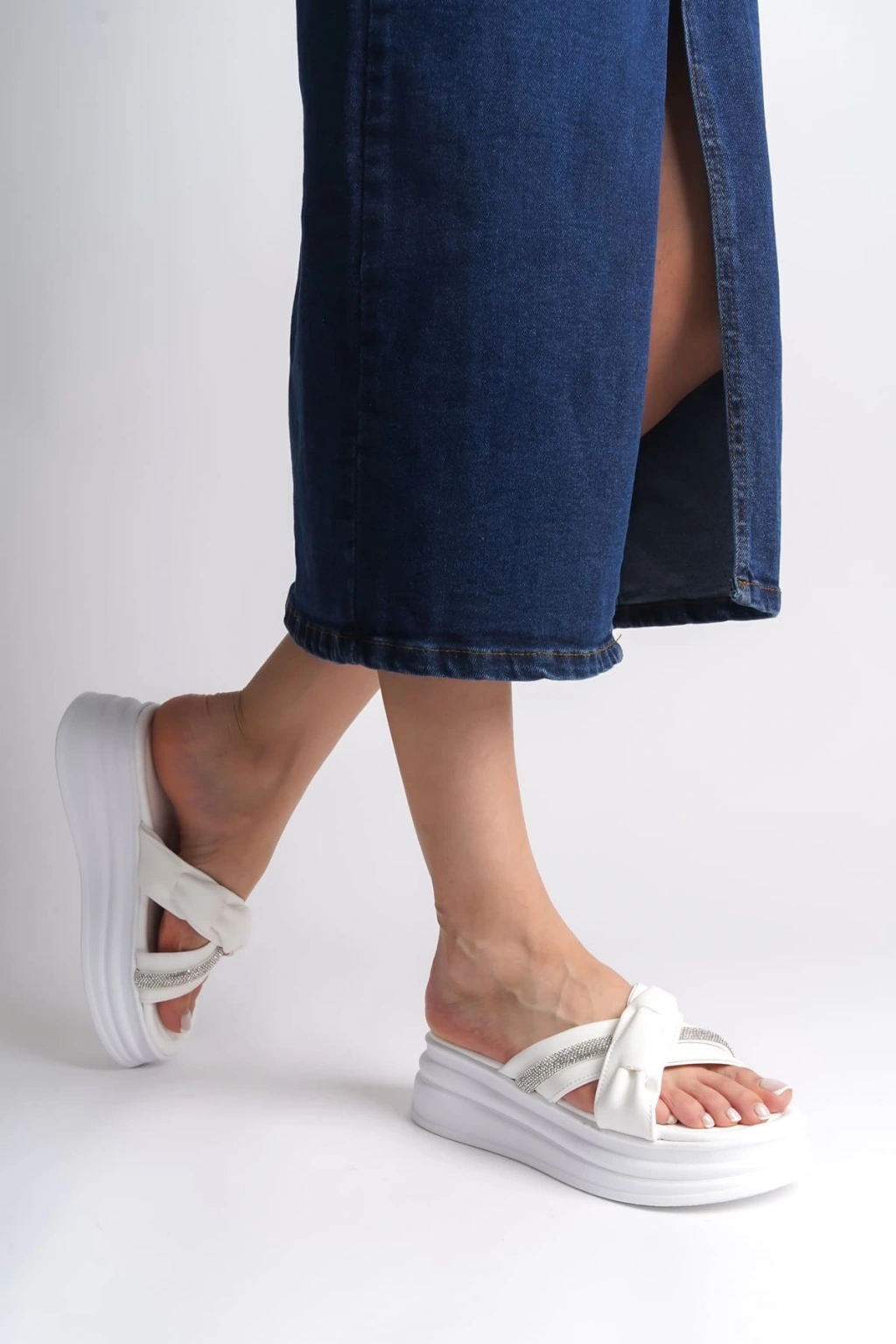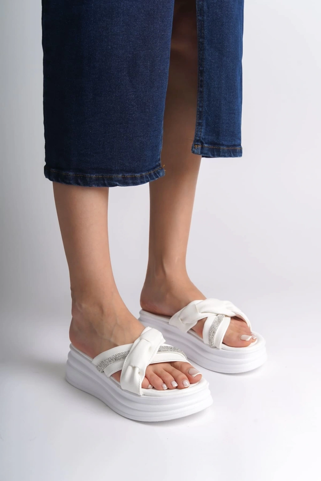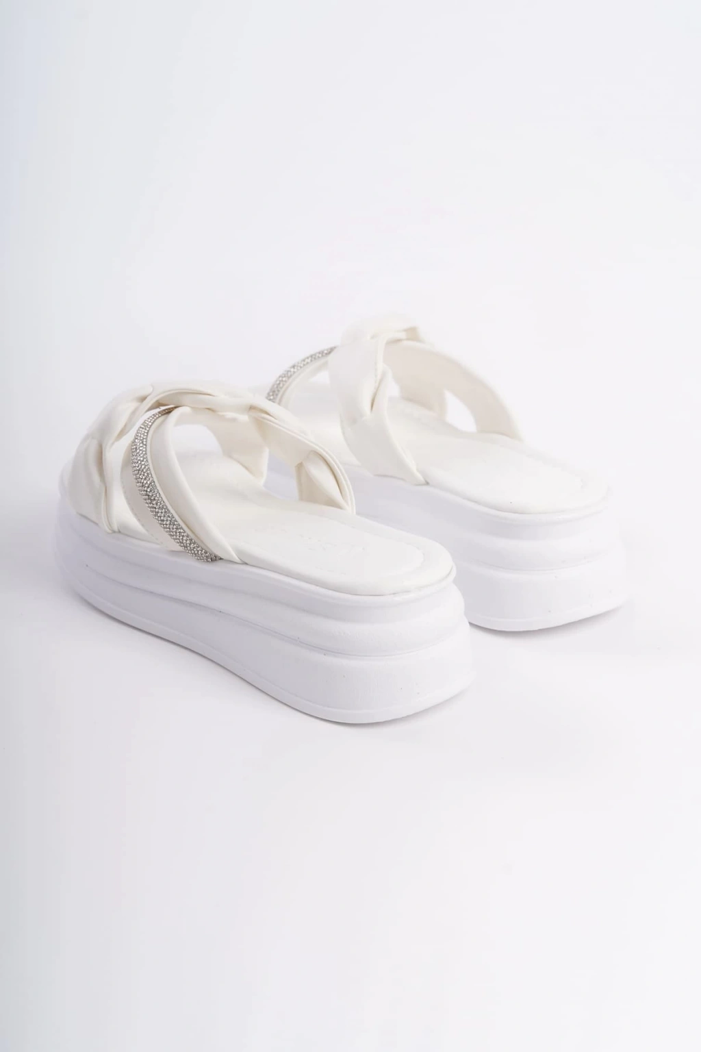 CLARA Düz Topuklu Kurdele Desenli Taşlı Kalın ve Ortopedik Taban Kadın Terlik CBT - Beyaz