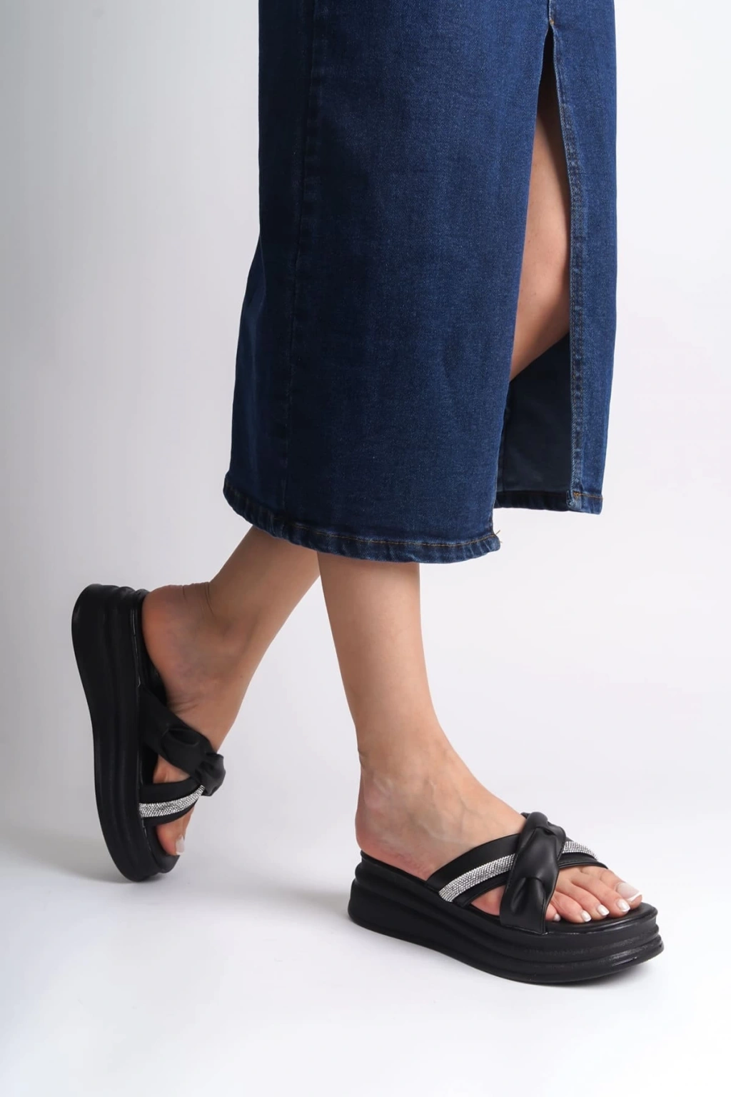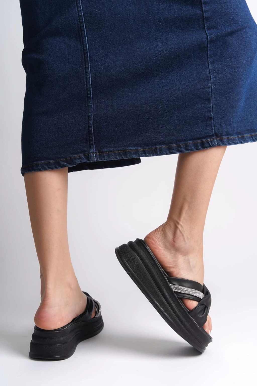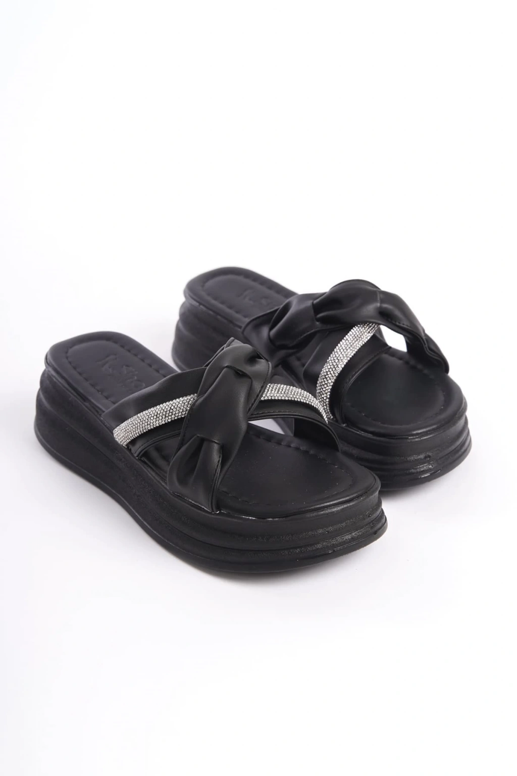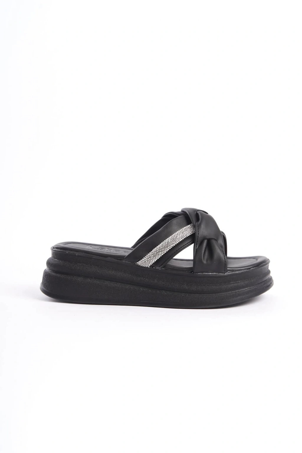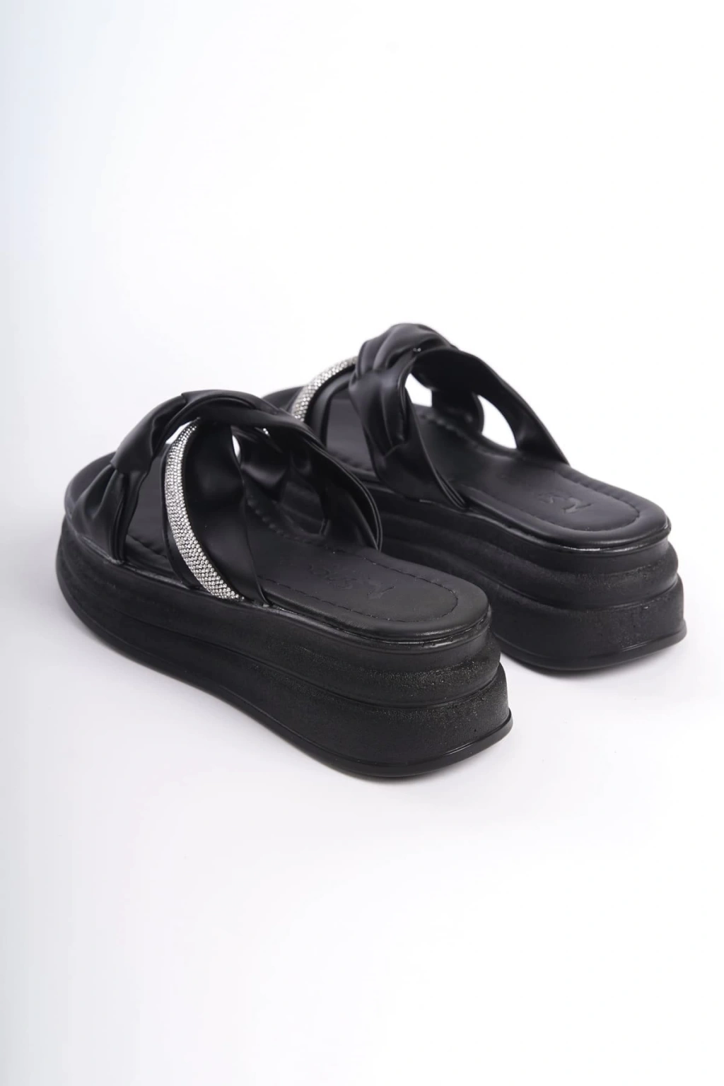 CLARA Düz Topuklu Kurdele Desenli Taşlı Kalın ve Ortopedik Taban Kadın Terlik CST - Siyah