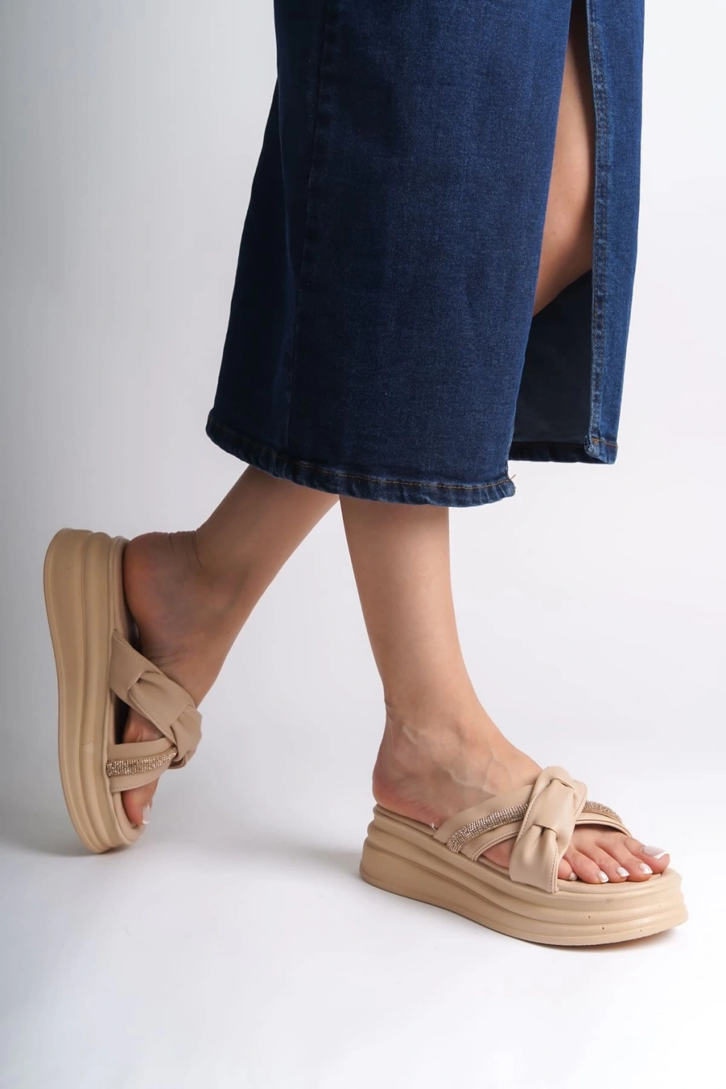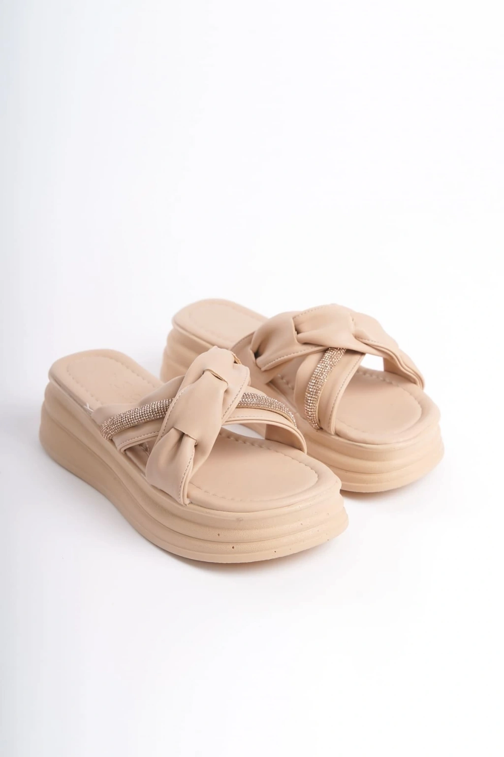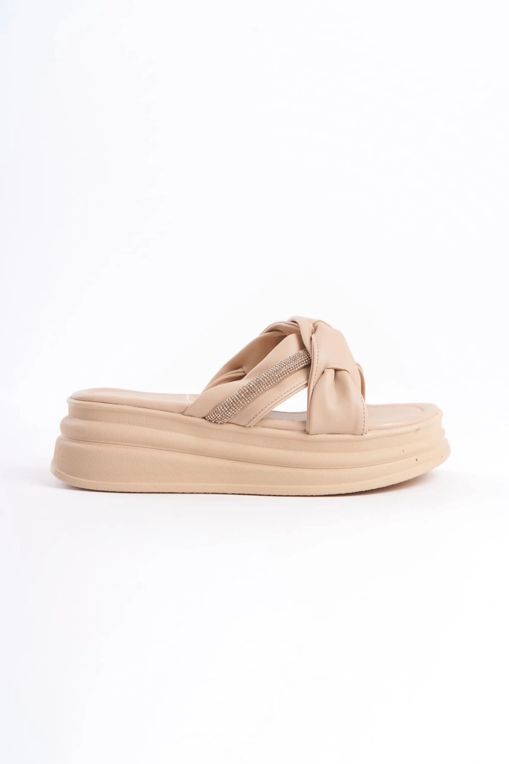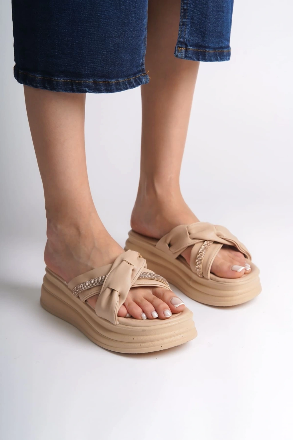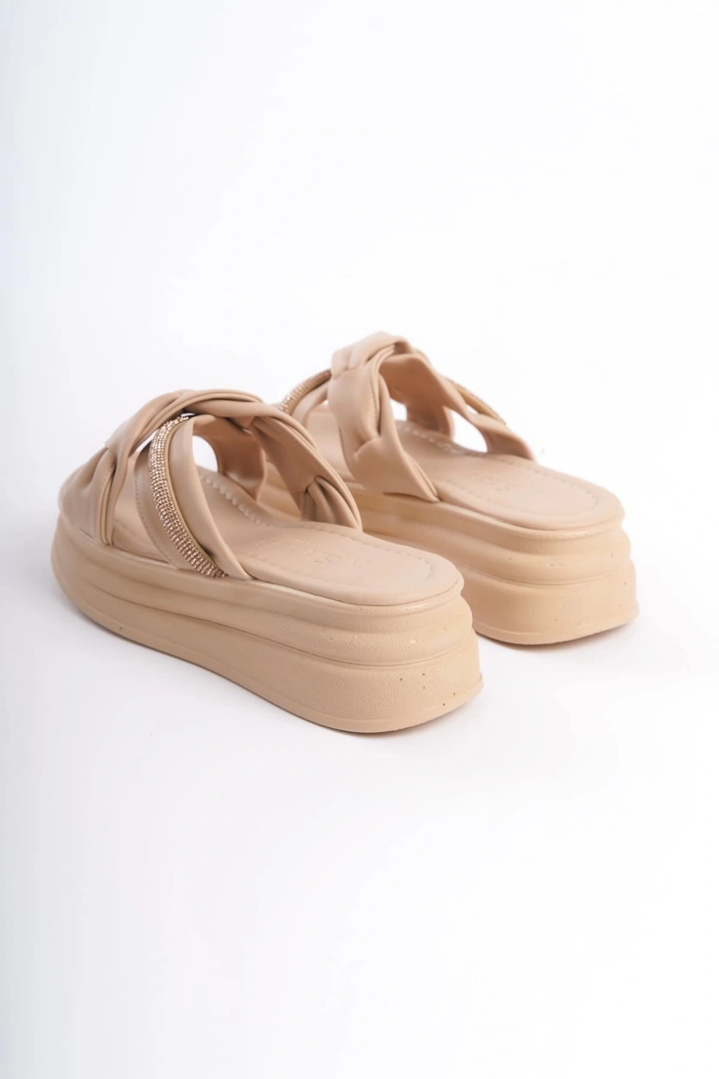 CLARA Düz Topuklu Kurdele Desenli Taşlı Kalın ve Ortopedik Taban Kadın Terlik CTT - Ten