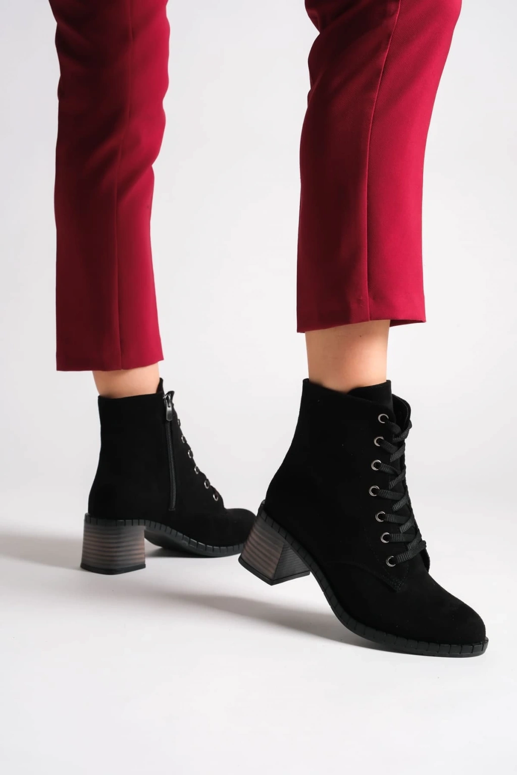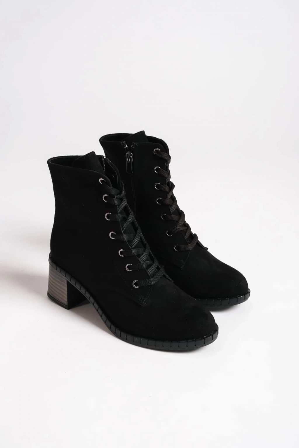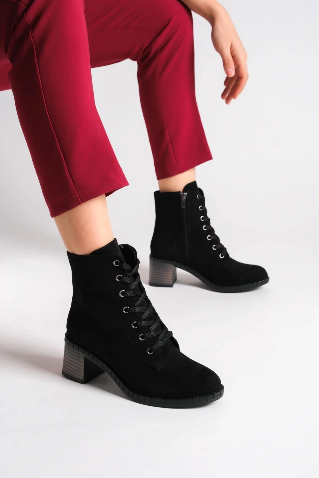 DIANA Bağcıklı Fermuarlı Ortopedik Taban Topuklu Süet Kadın Bot SST - Siyah