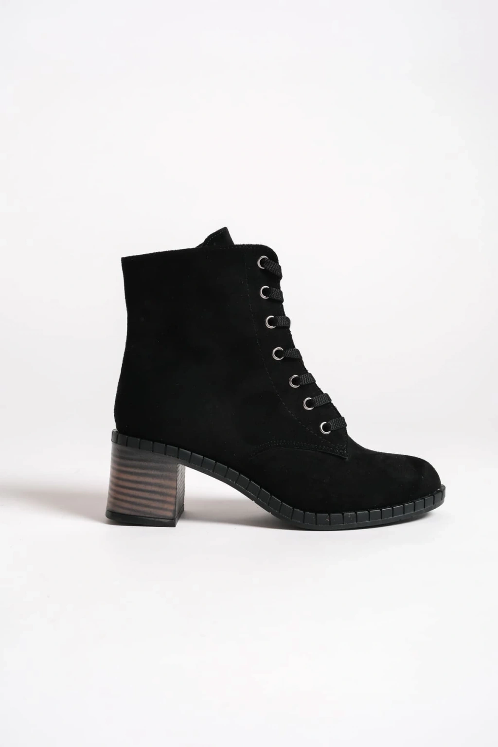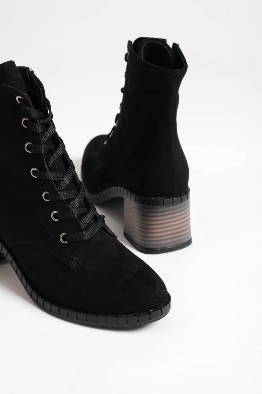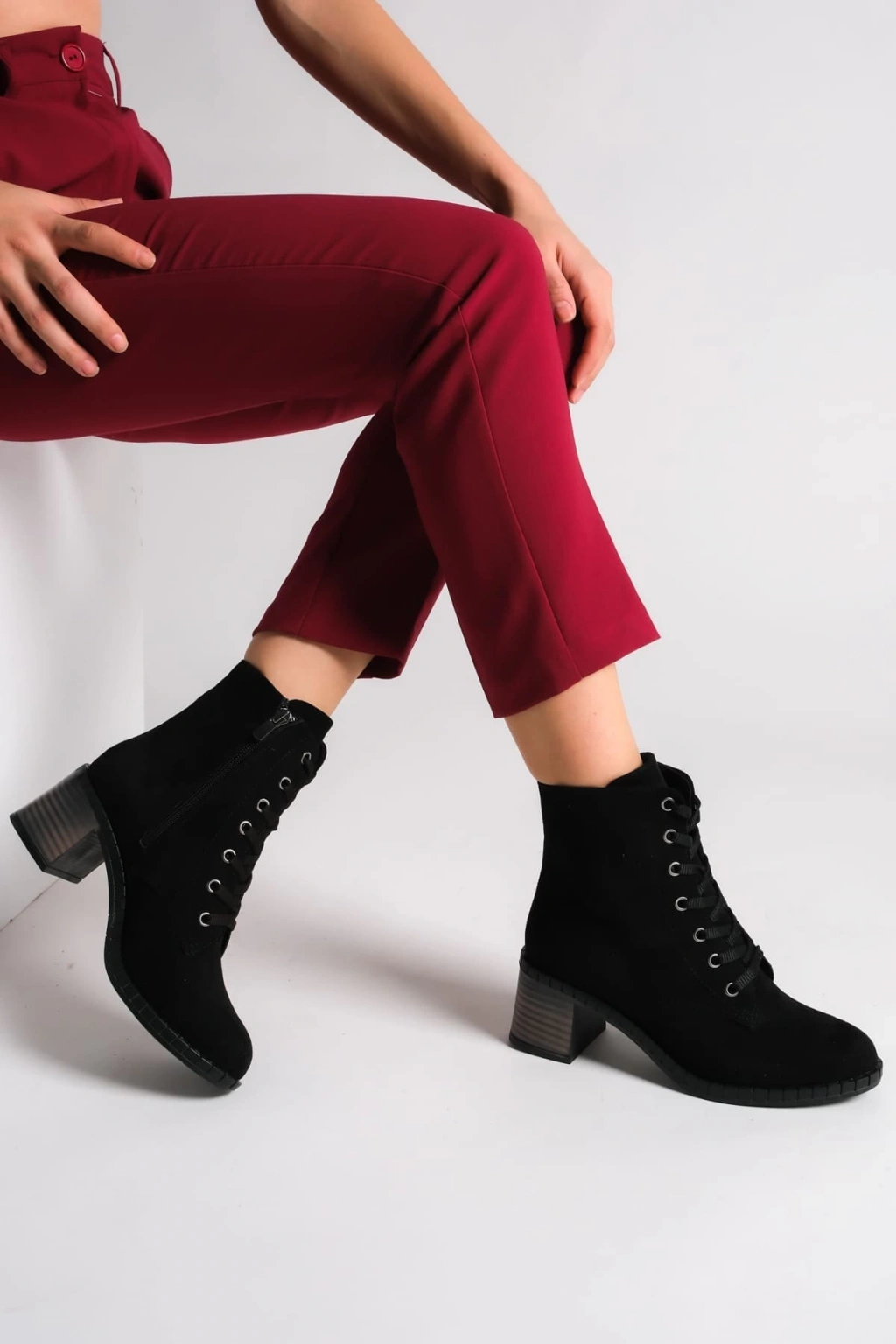 DIANA Bağcıklı Fermuarlı Ortopedik Taban Topuklu Süet Kadın Bot SST - Siyah