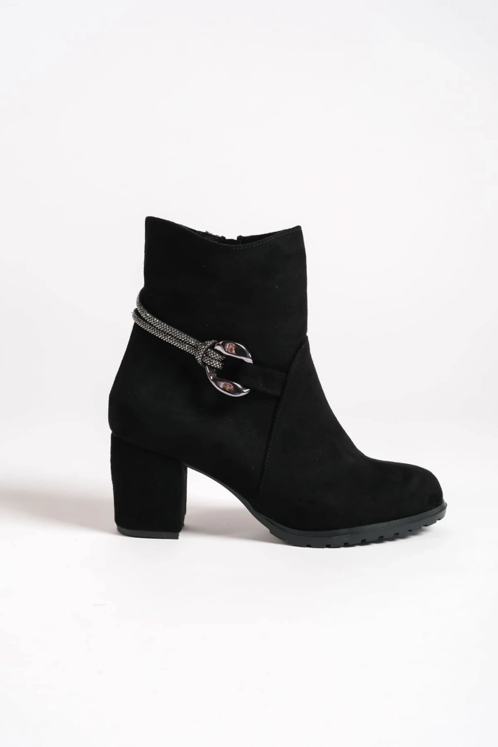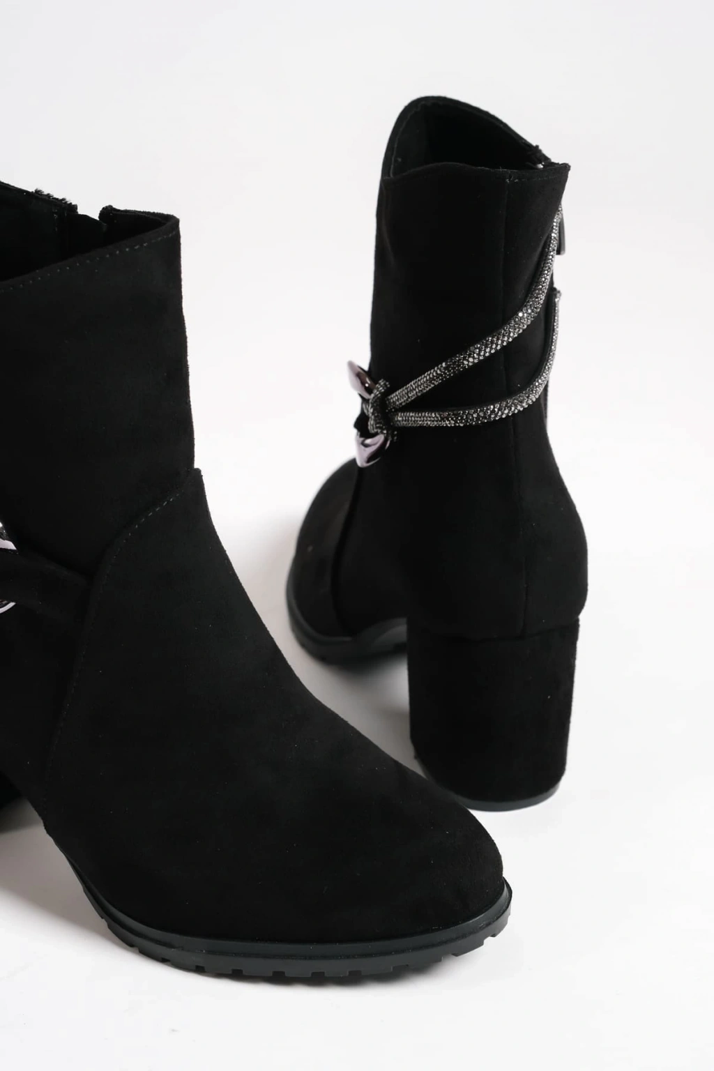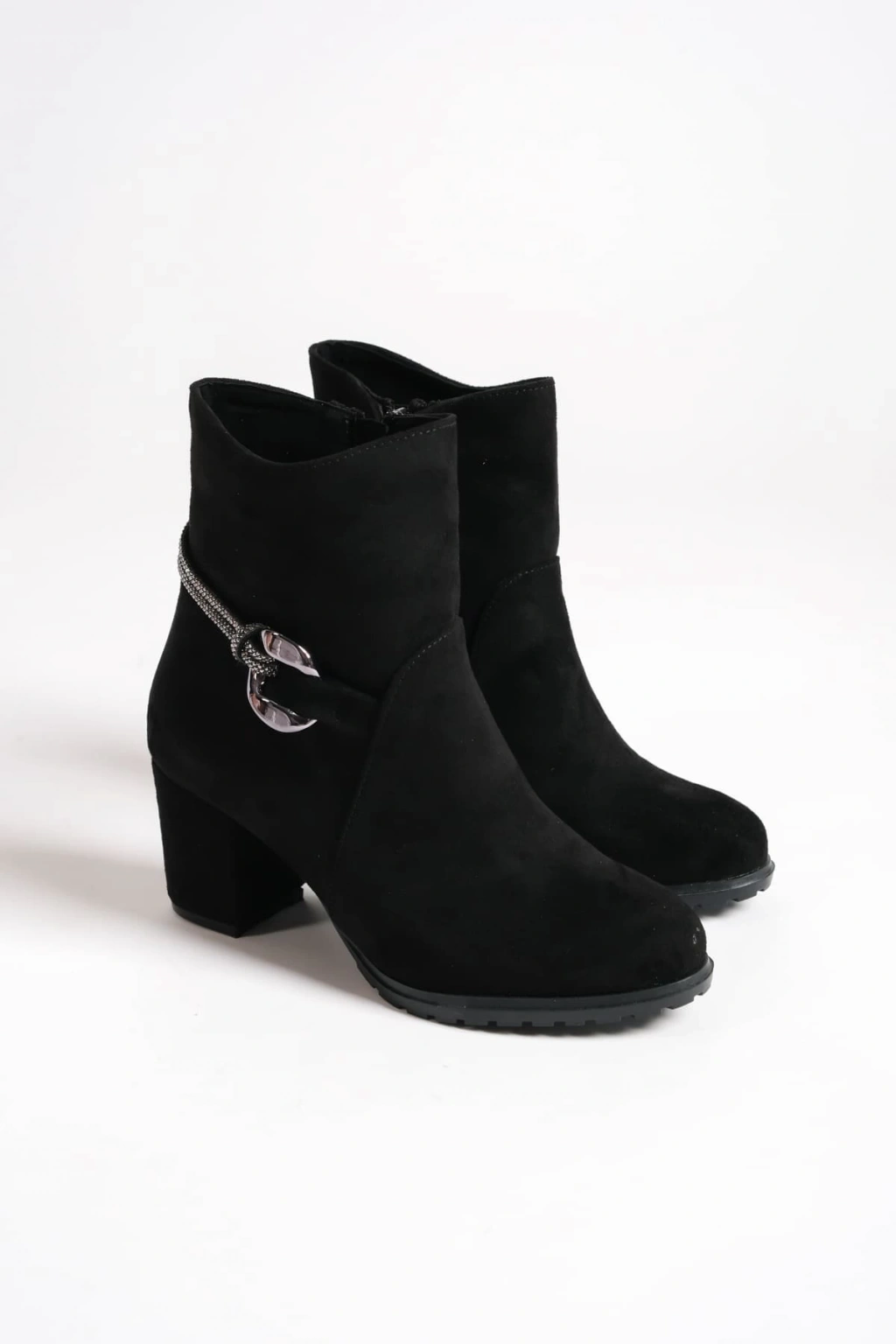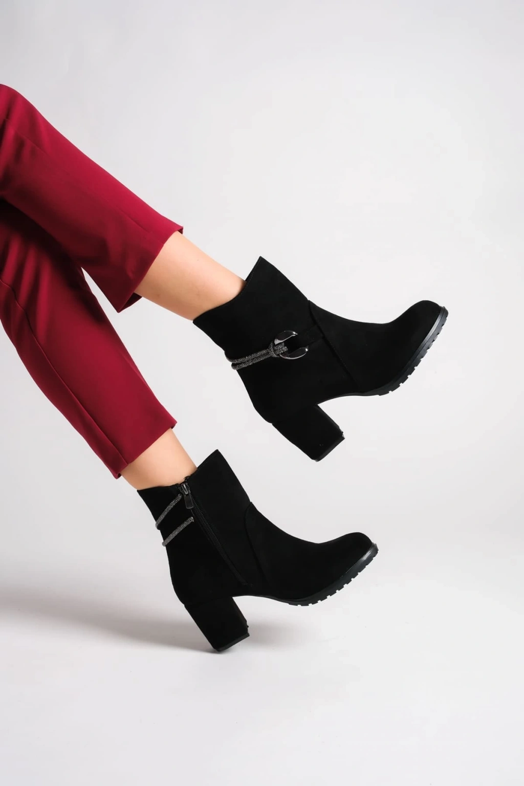 EDNA Fermuarlı Ortopedik Taban Taşlı Topuklu Süet Kadın Bot SST - Siyah