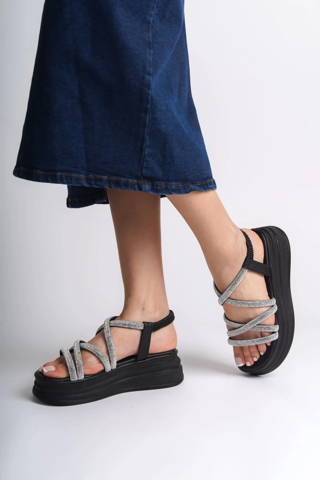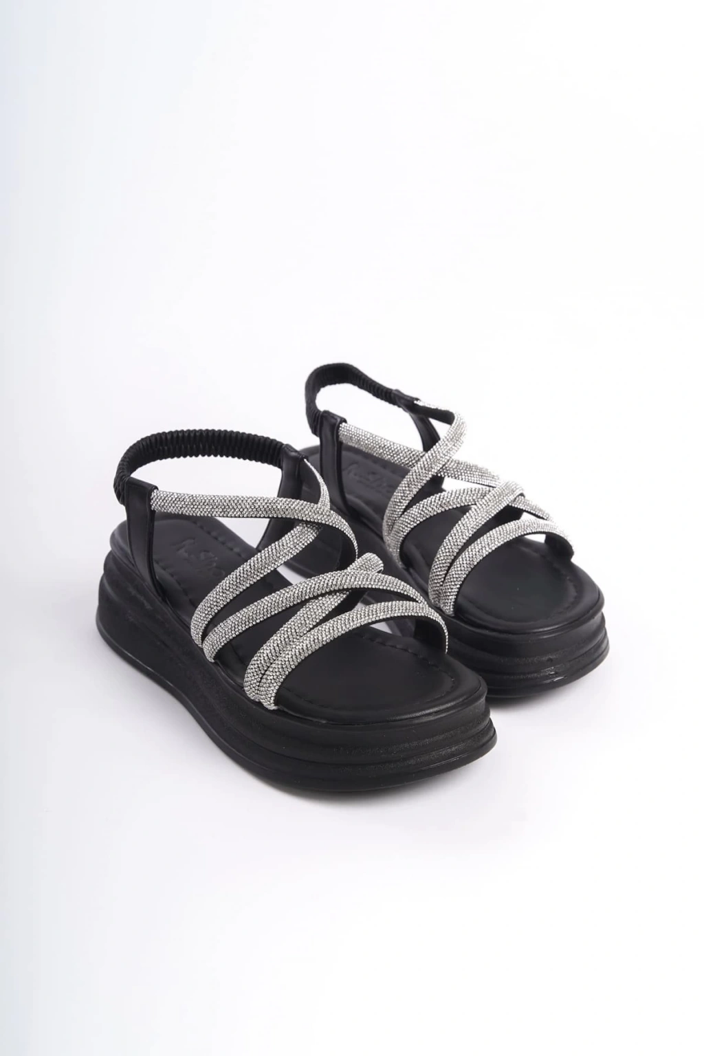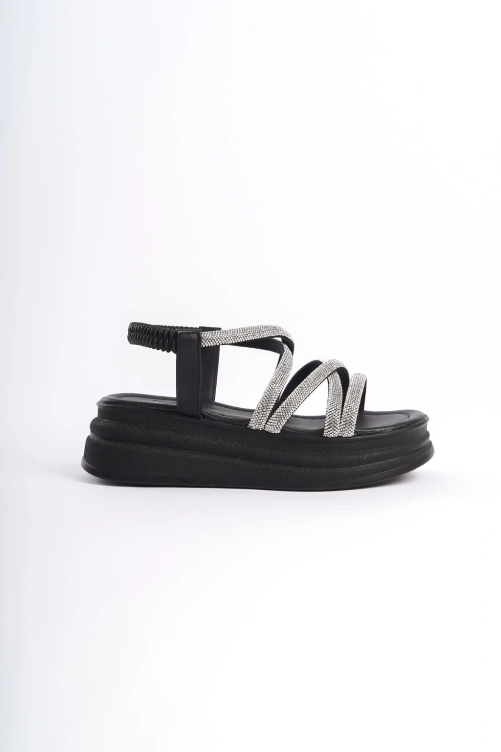 ELENA Lastikli Taşlı Şeritli Ortopedik Taban Kadın Sandalet CST - Siyah