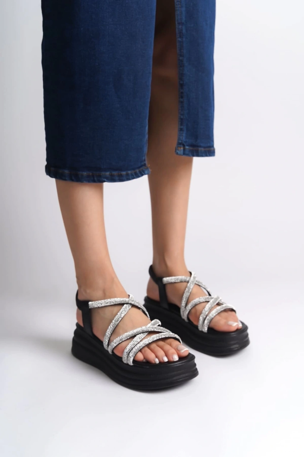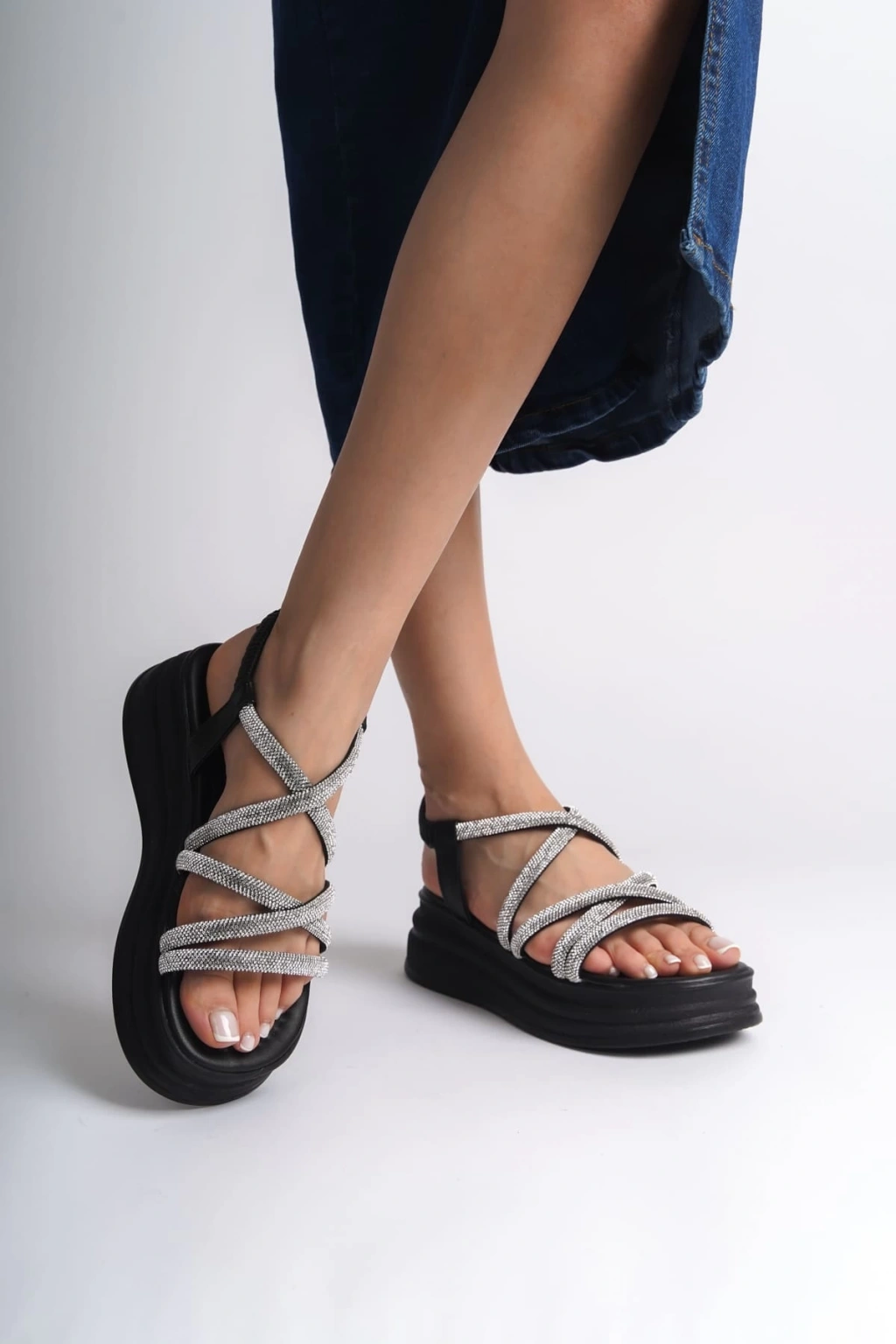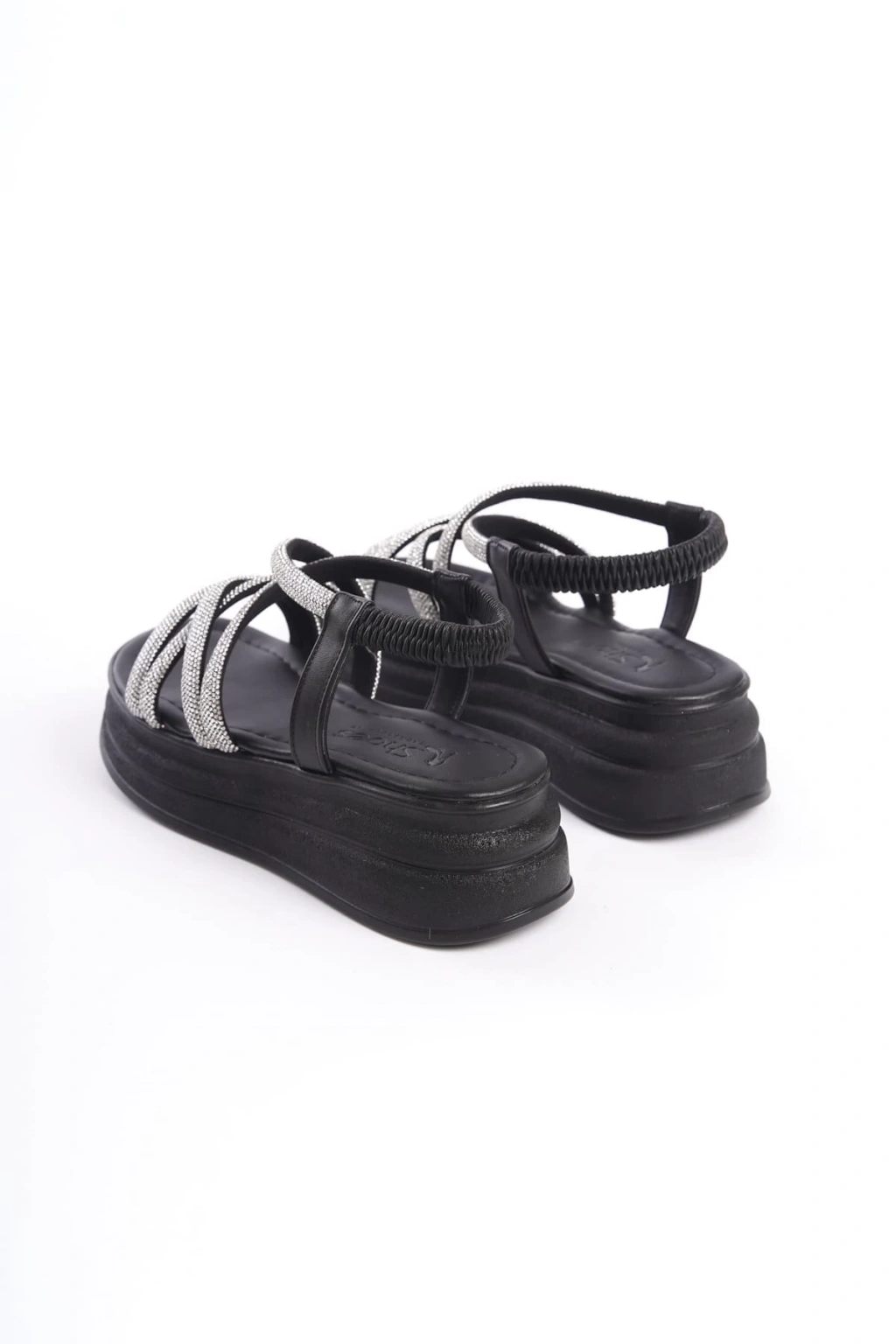 ELENA Lastikli Taşlı Şeritli Ortopedik Taban Kadın Sandalet CST - Siyah