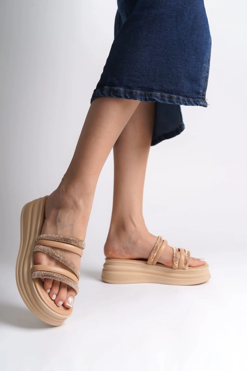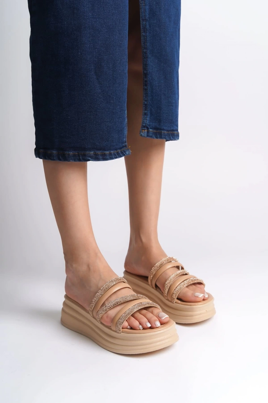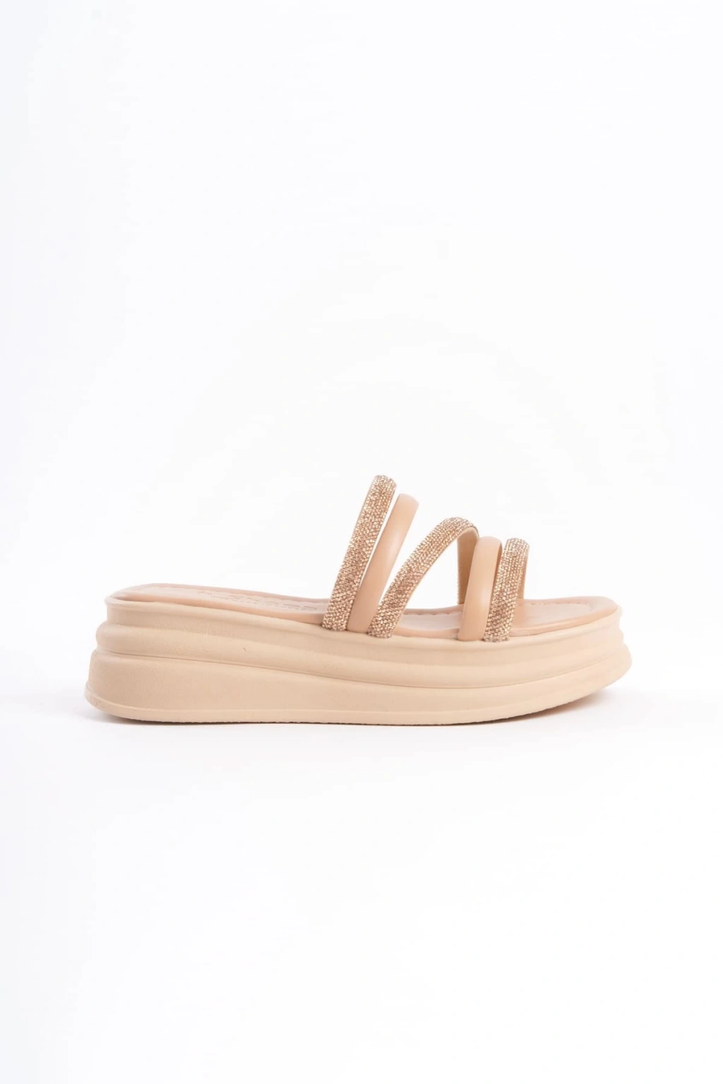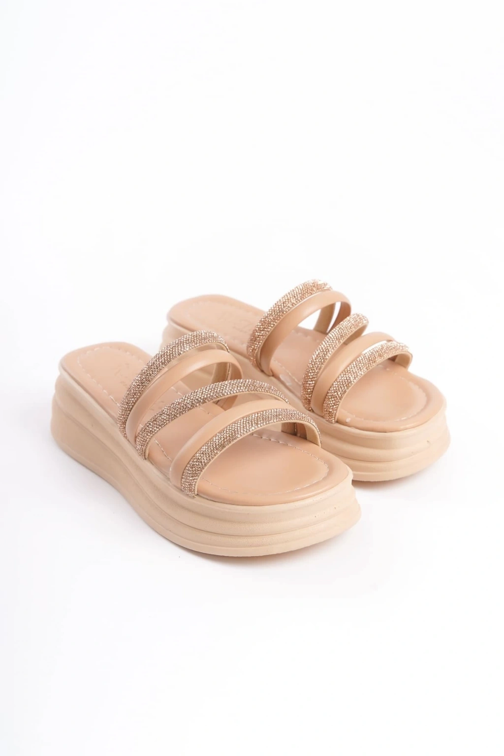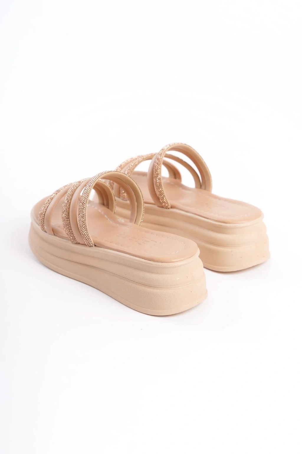 ELISE Düz Topuklu Şeritli Taşlı Kalın ve Ortopedik Taban Kadın Terlik CTT - Ten