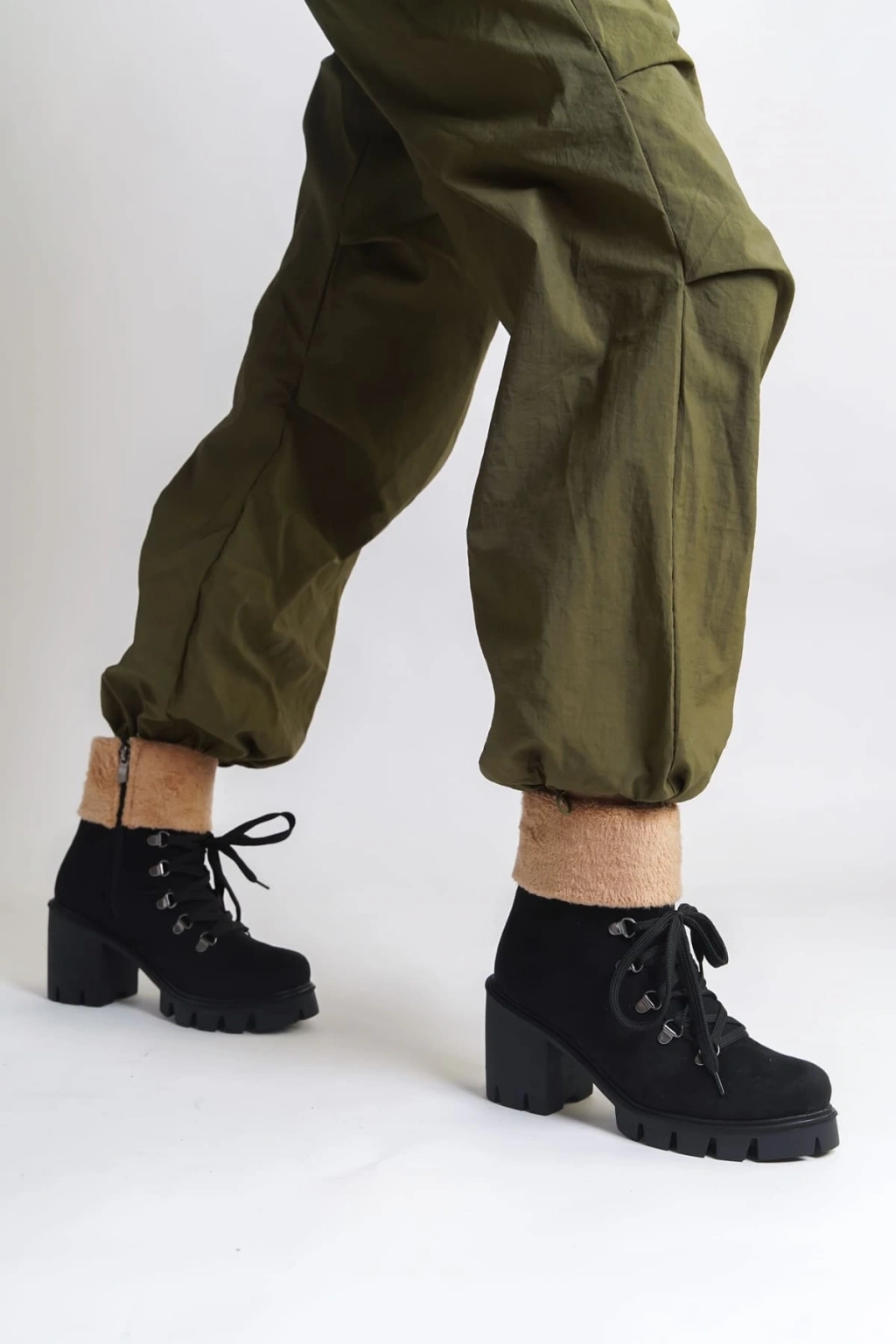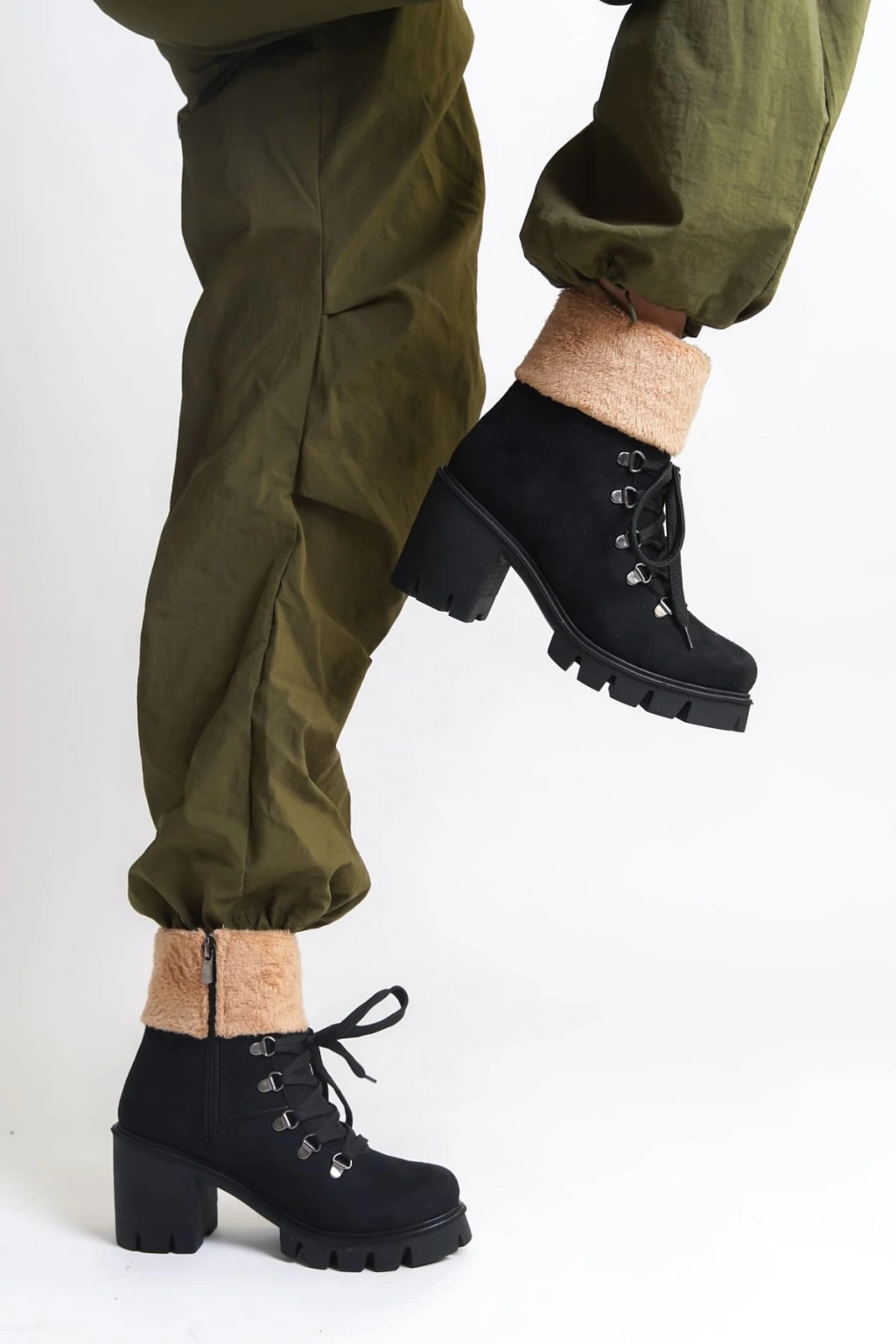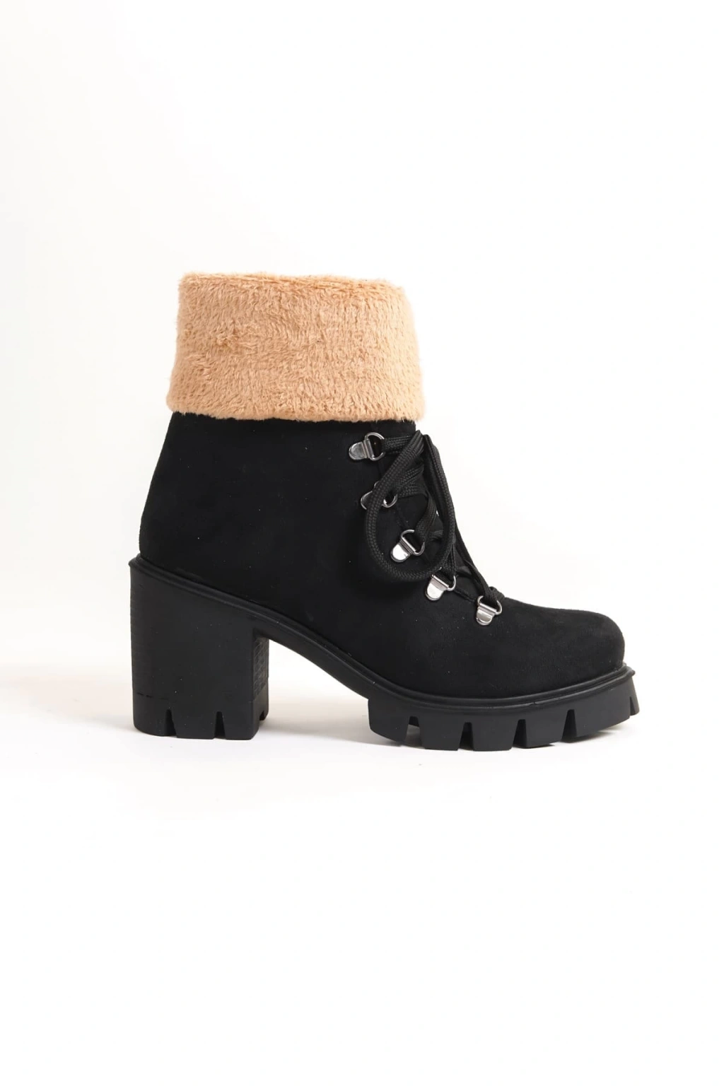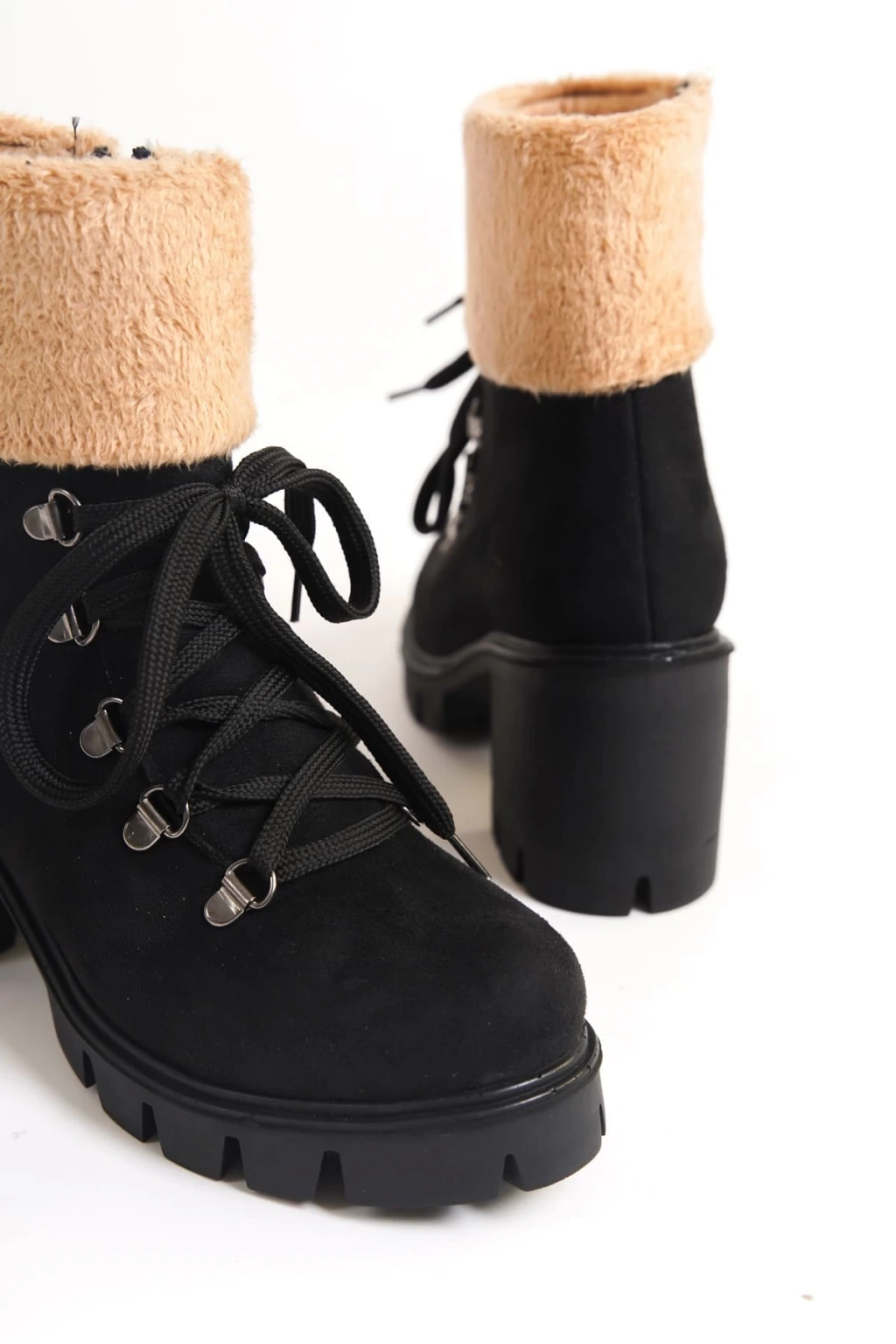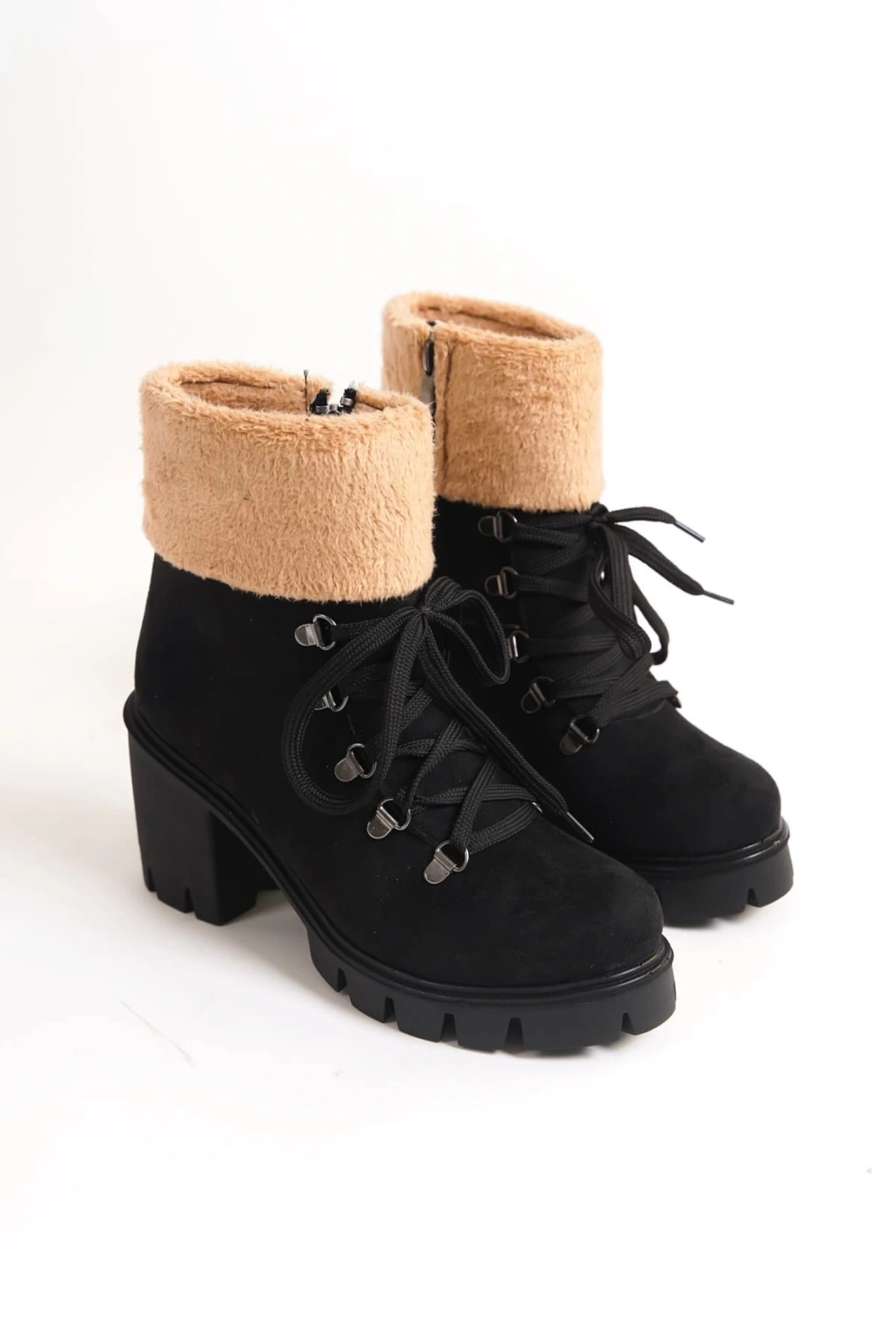 EMMA Bağcıklı Fermuarlı Ortopedik Taban Topuklu Kürk Detaylı Süet Kadın Bot SST - Siyah