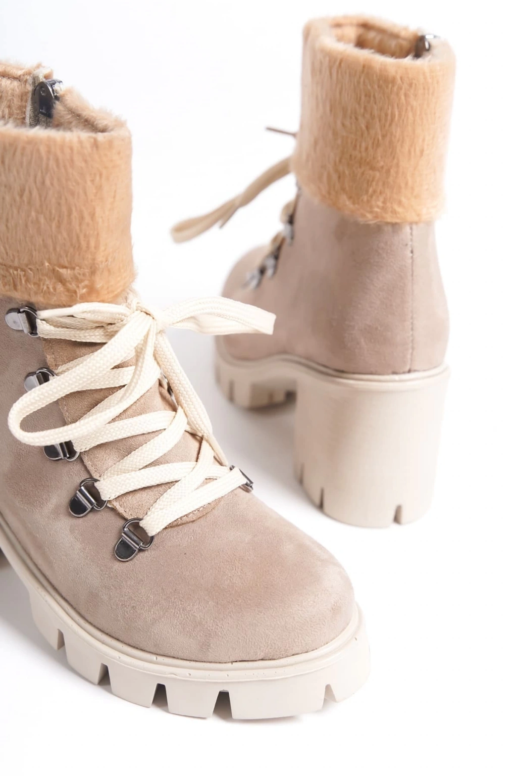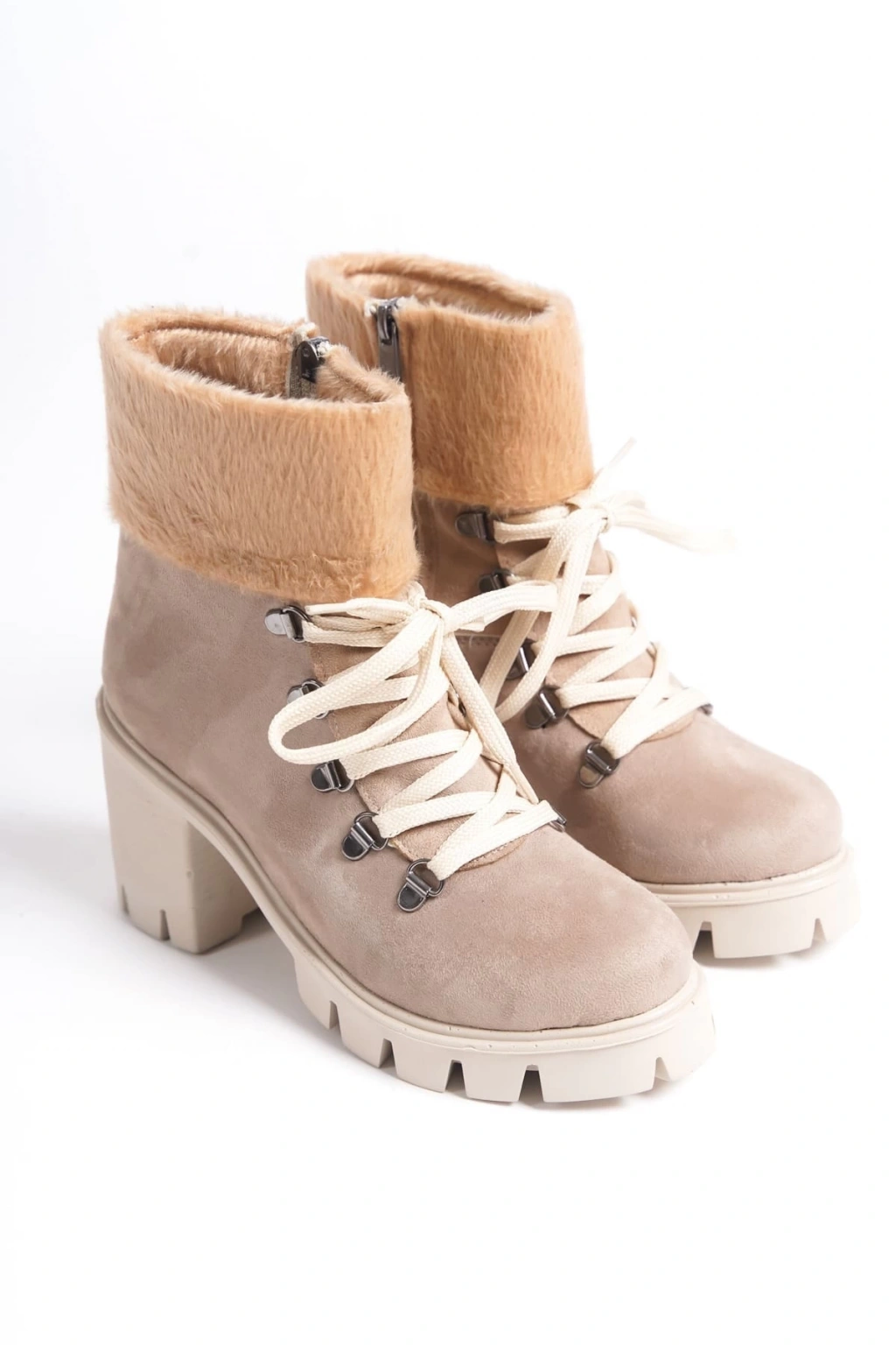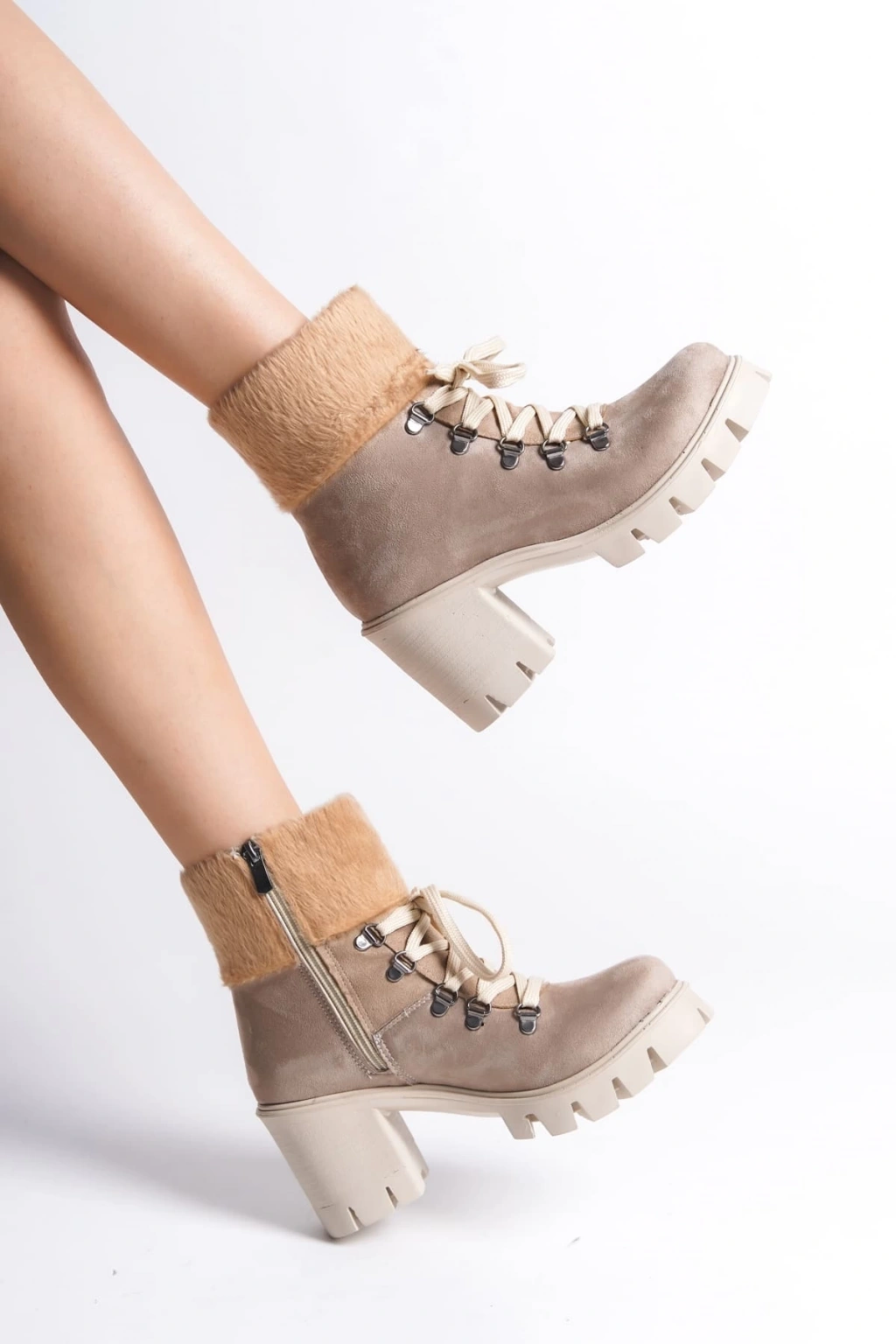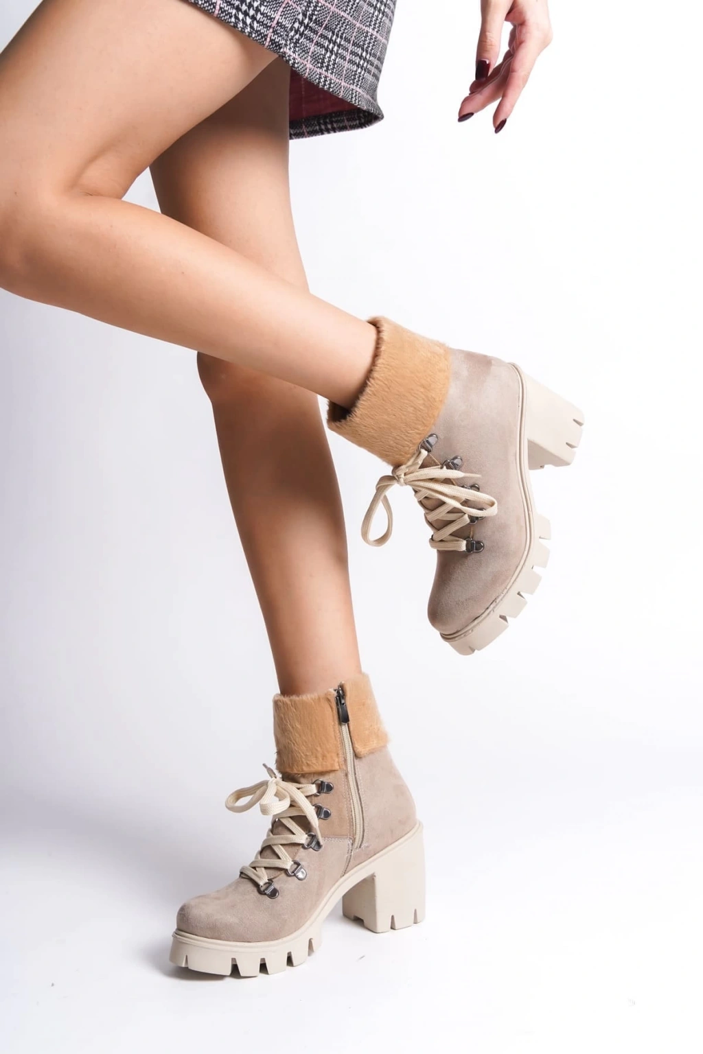 EMMA Bağcıklı Fermuarlı Ortopedik Taban Topuklu Kürk Detaylı Süet Kadın Bot STT - Ten