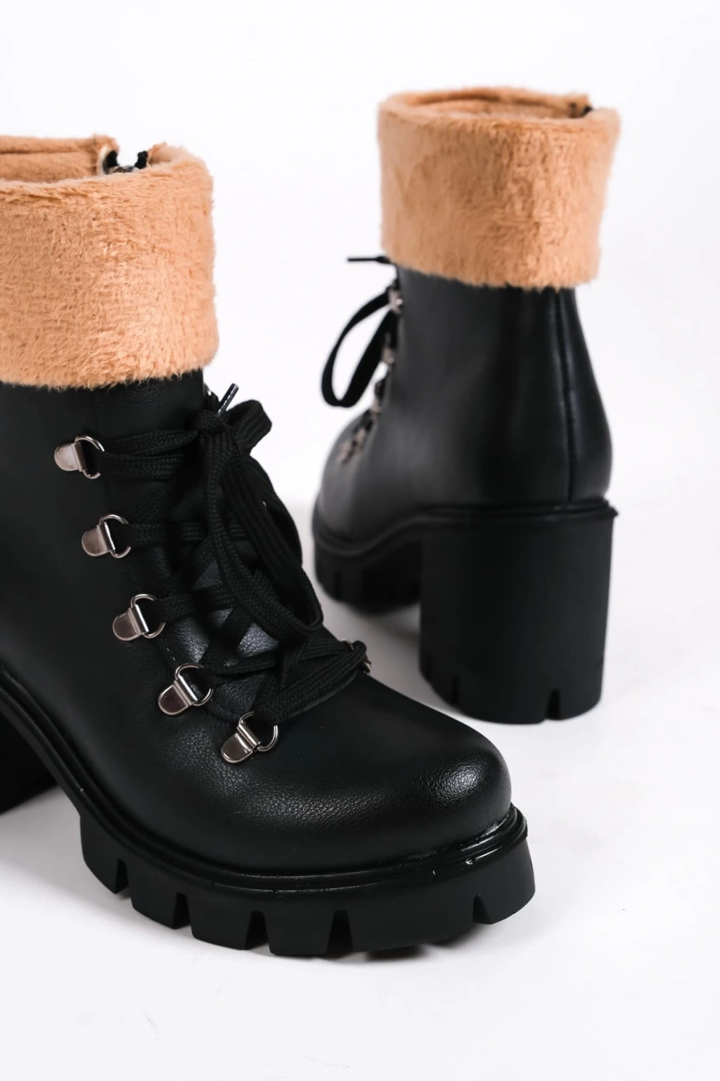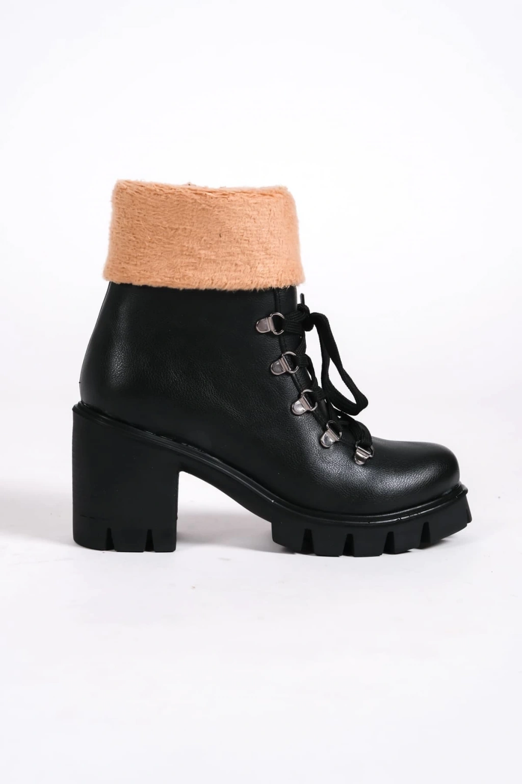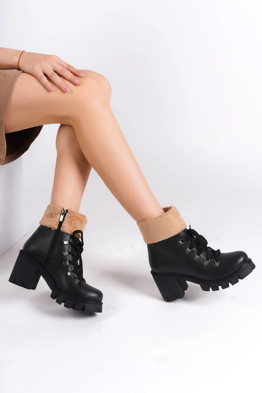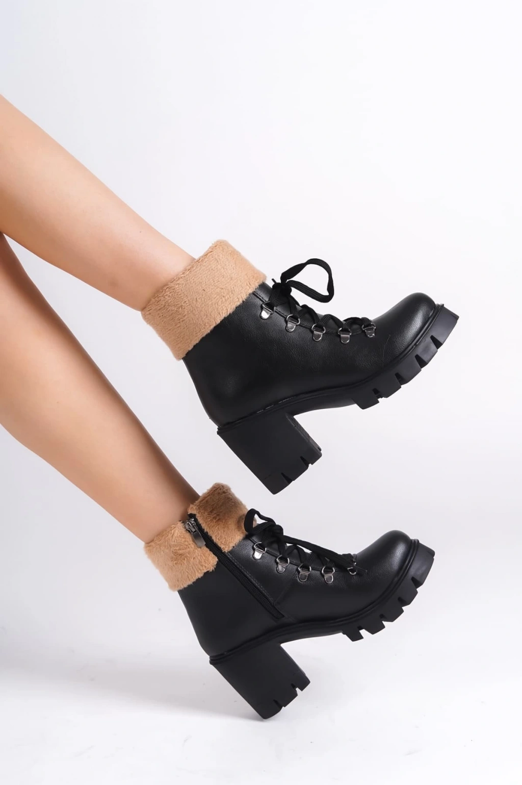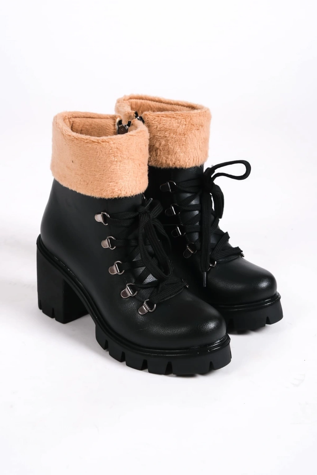 EMMA Bağcıklı Fermuarlı Ortopedik Taban Topuklu Kürk DetaylıKadın Bot CST - Siyah
