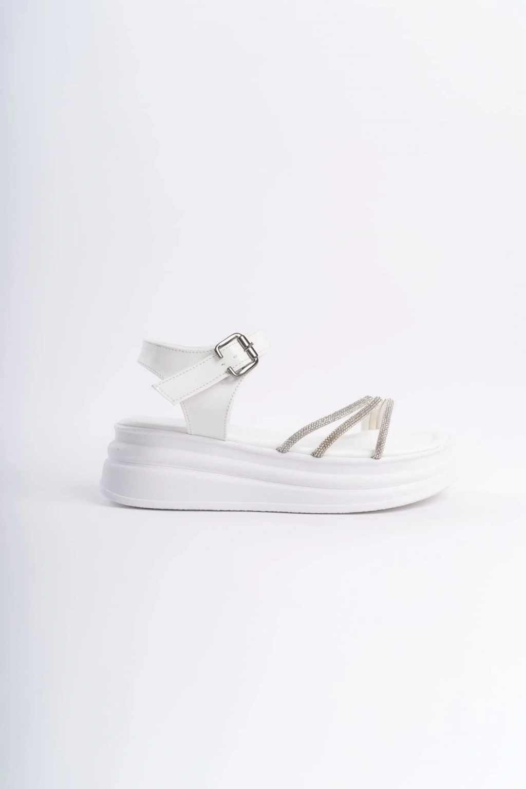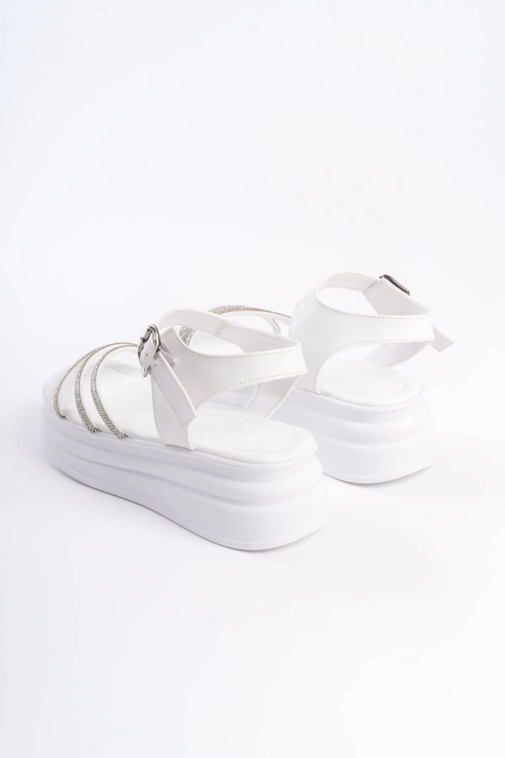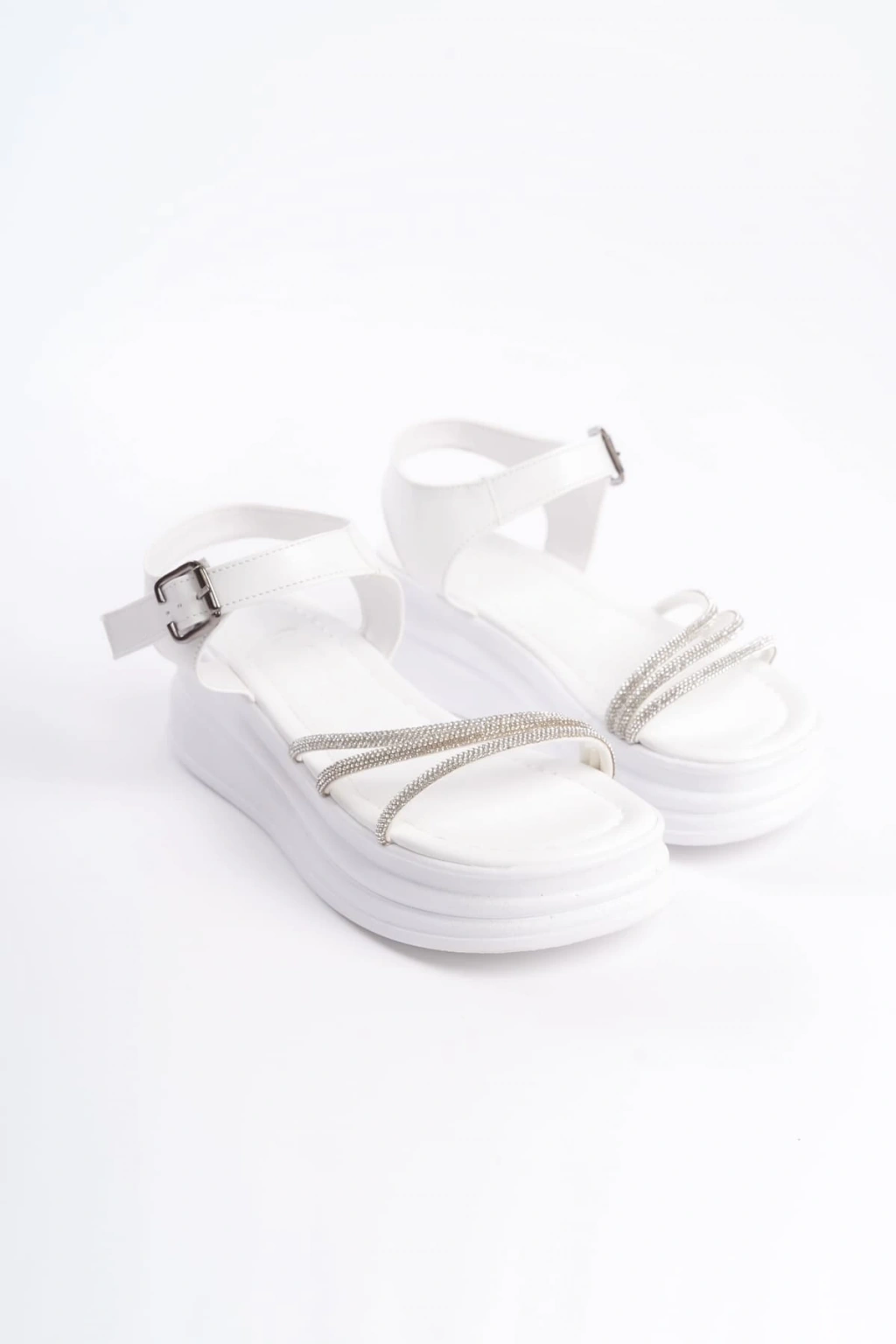 EVA Kalın Tokalı Taşlı Şeritli Ortopedik Taban Kadın Sandalet CBT - Beyaz