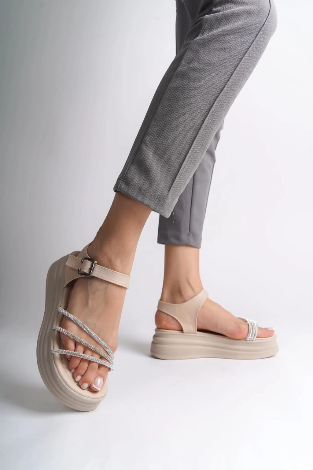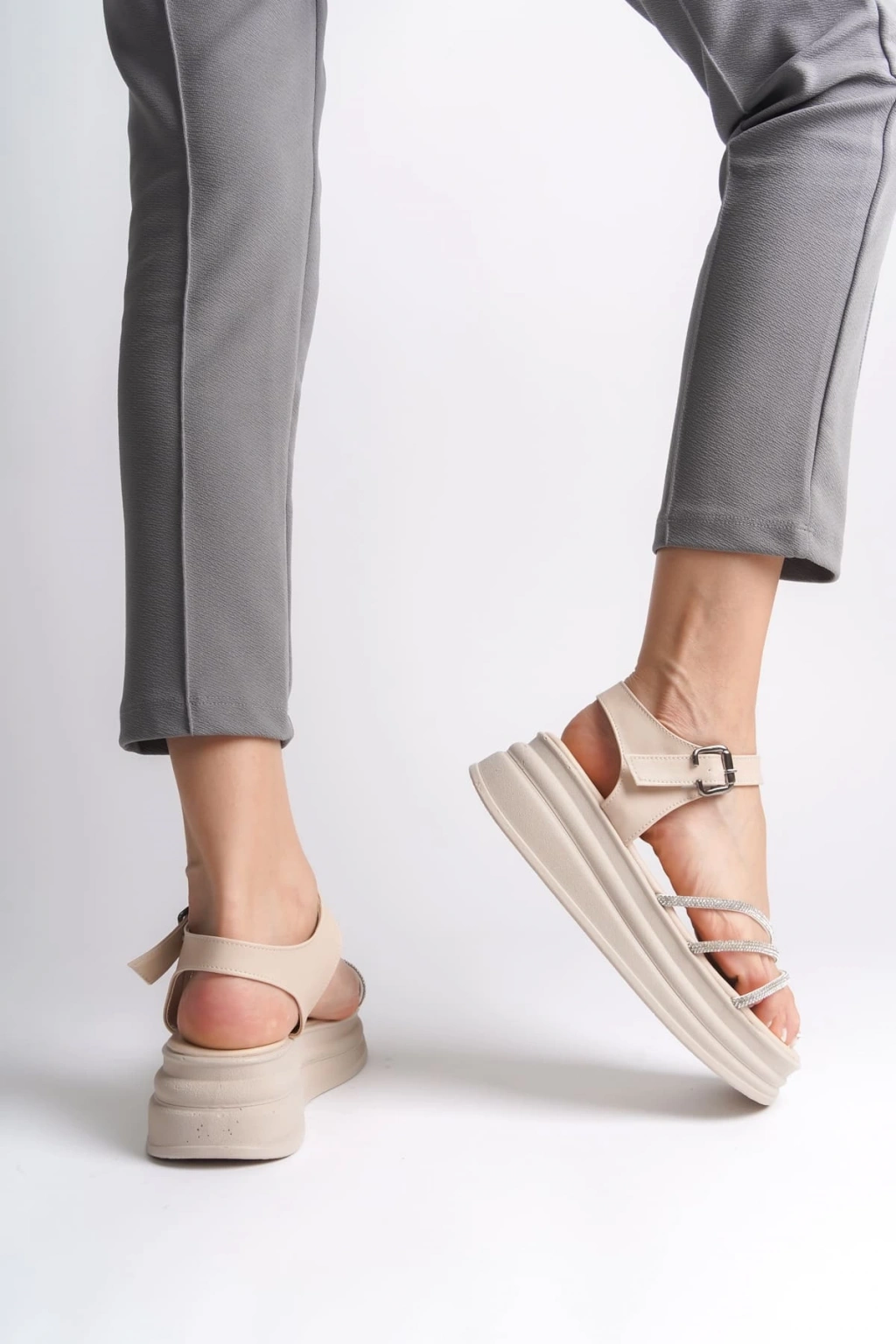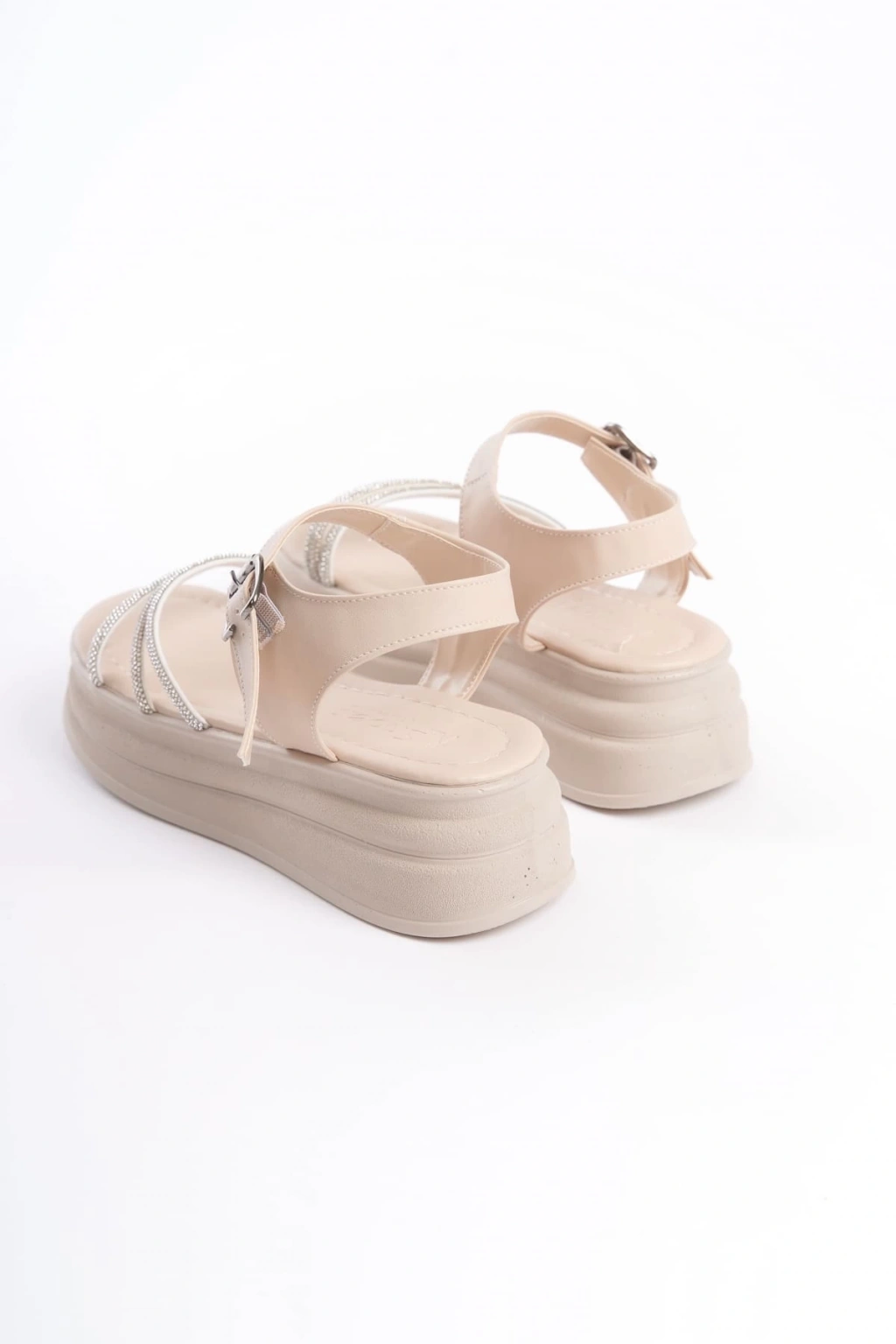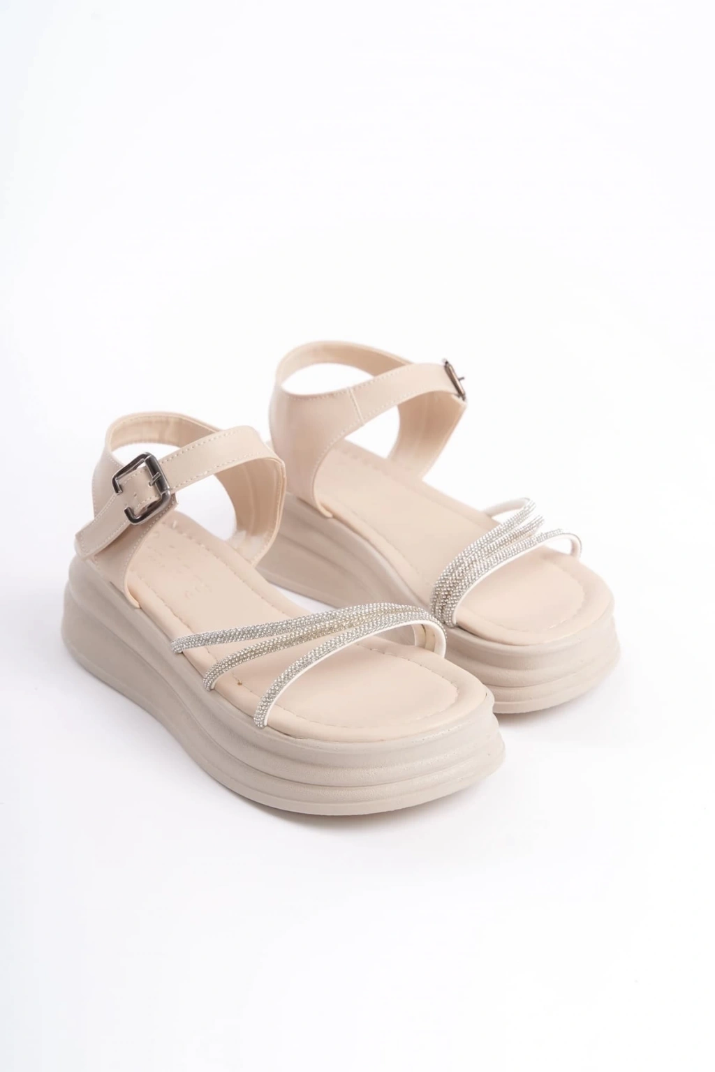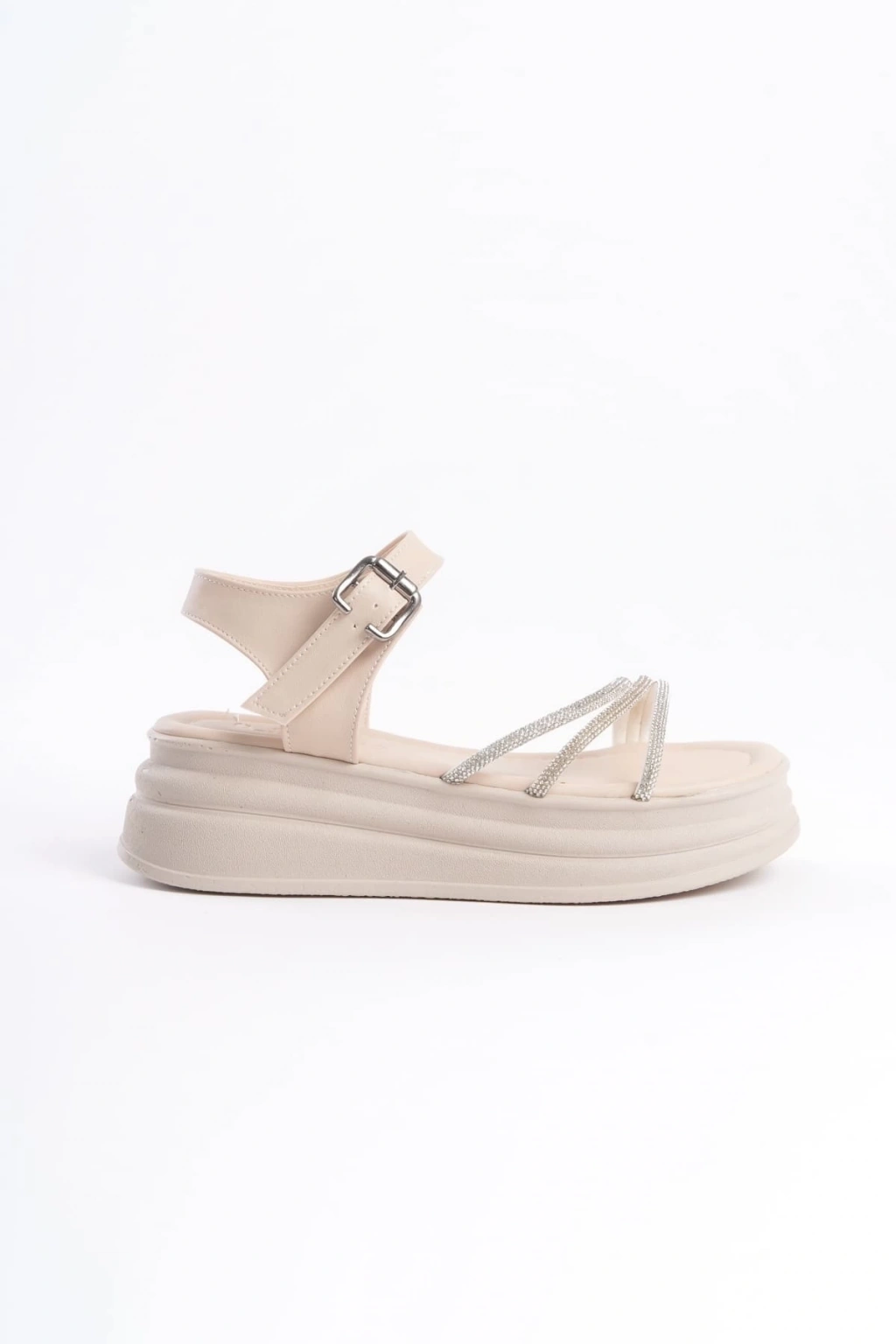 EVA Kalın Tokalı Taşlı Şeritli Ortopedik Taban Kadın Sandalet CKT - Krem