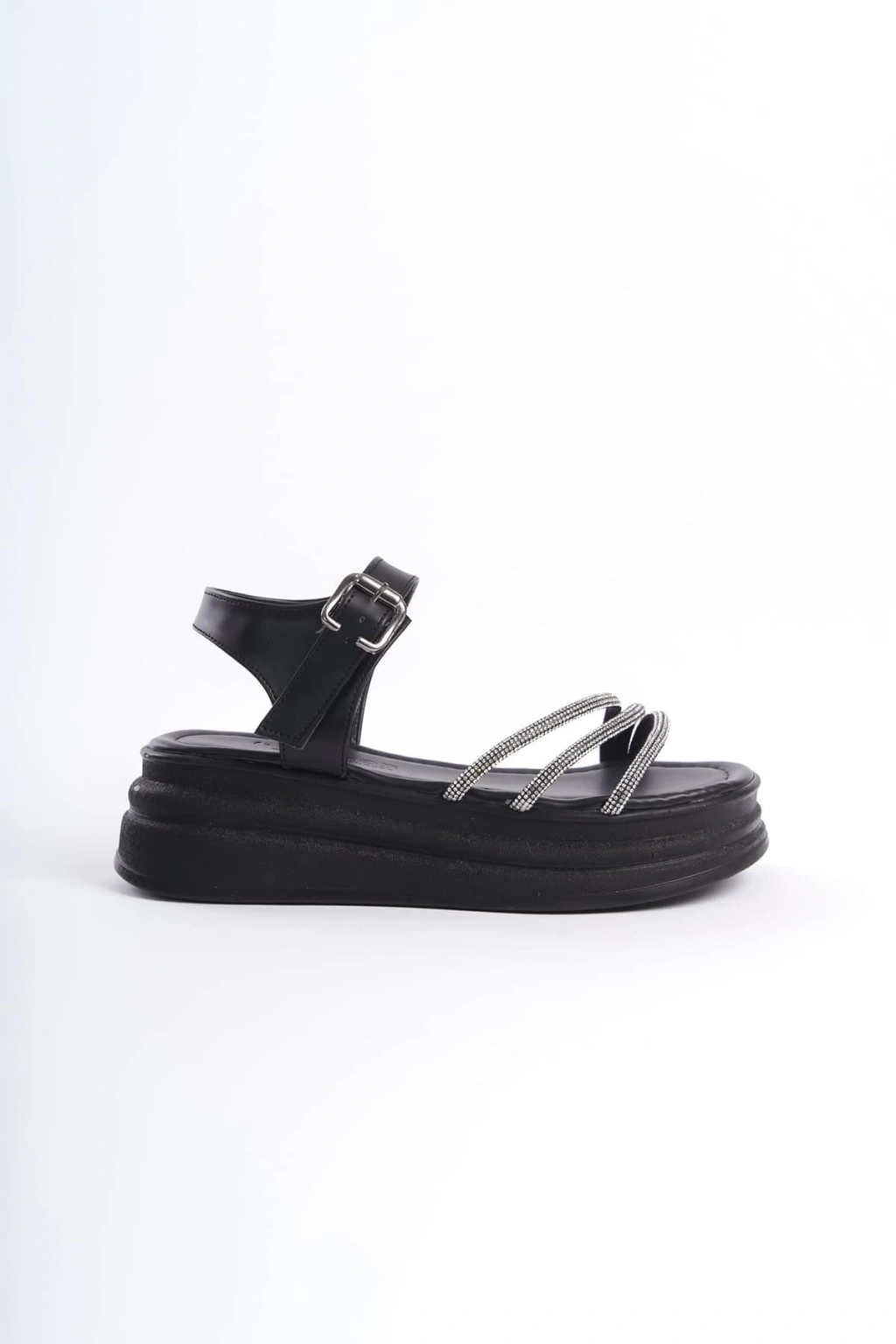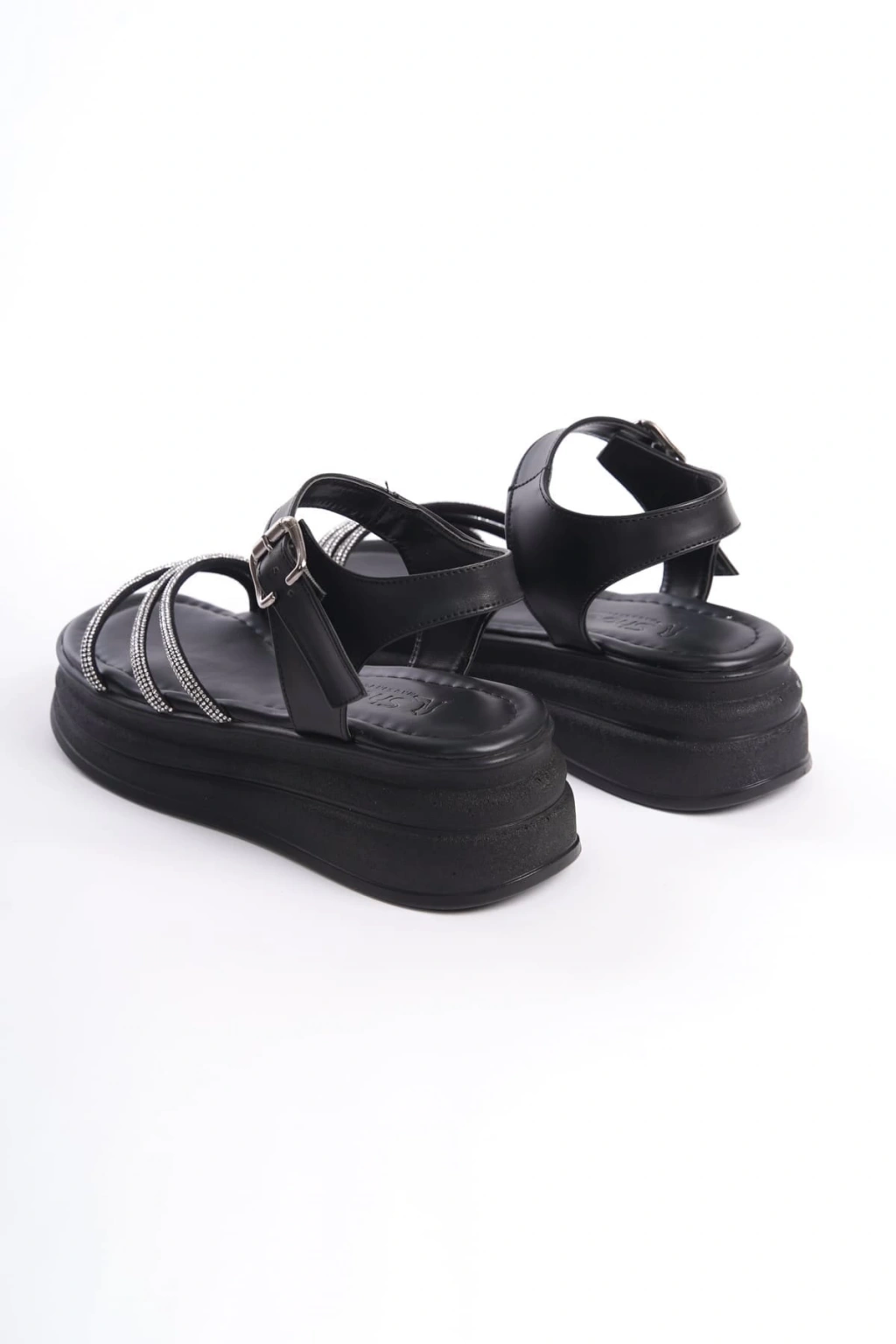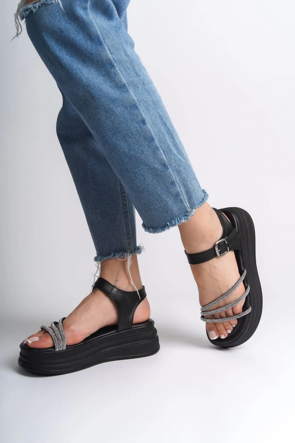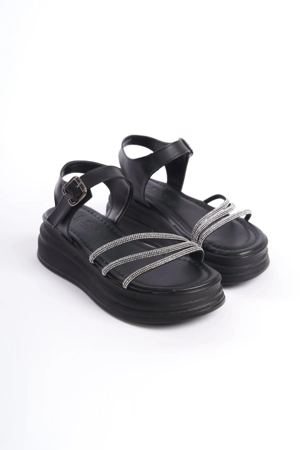 EVA Kalın Tokalı Taşlı Şeritli Ortopedik Taban Kadın Sandalet CST - Siyah