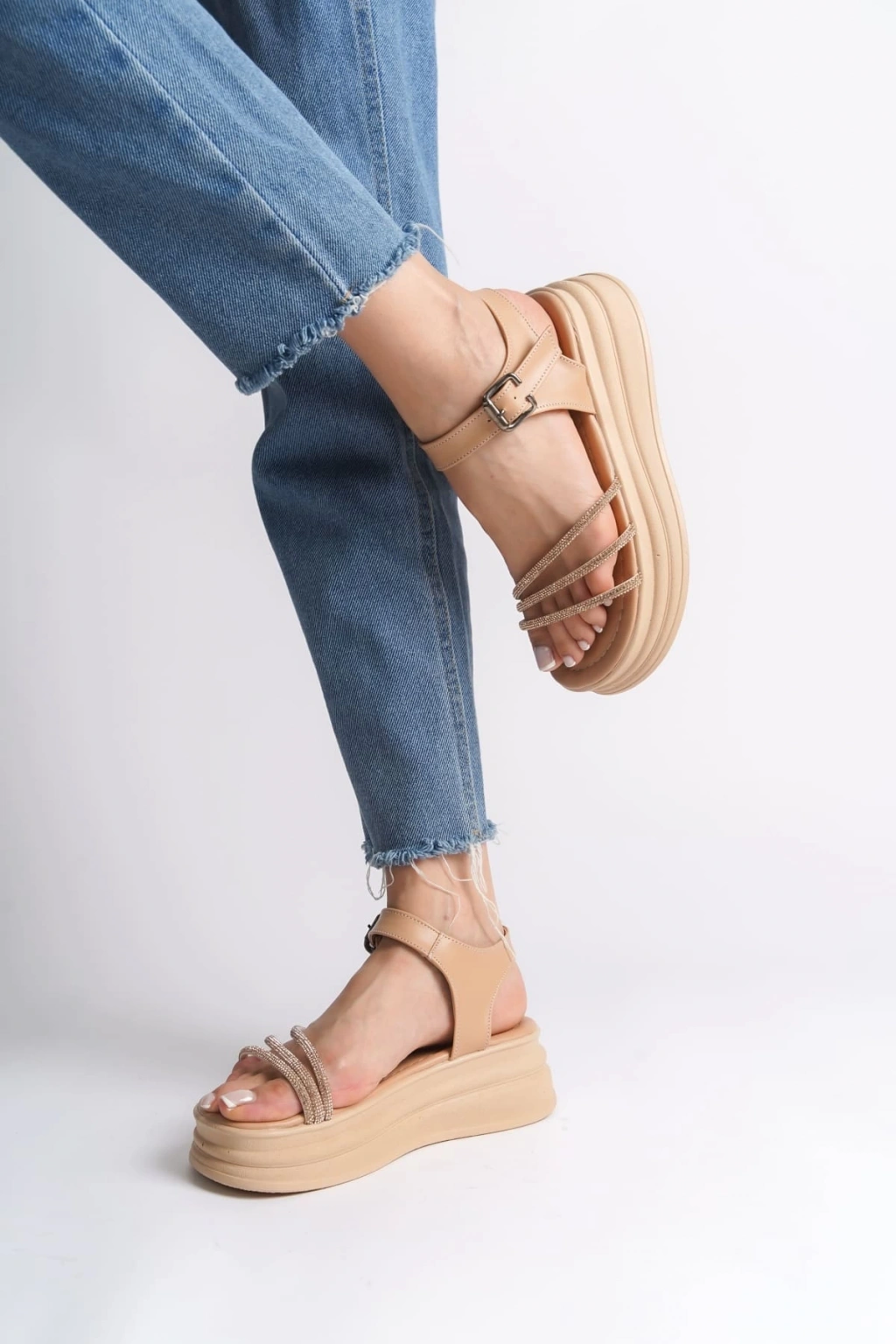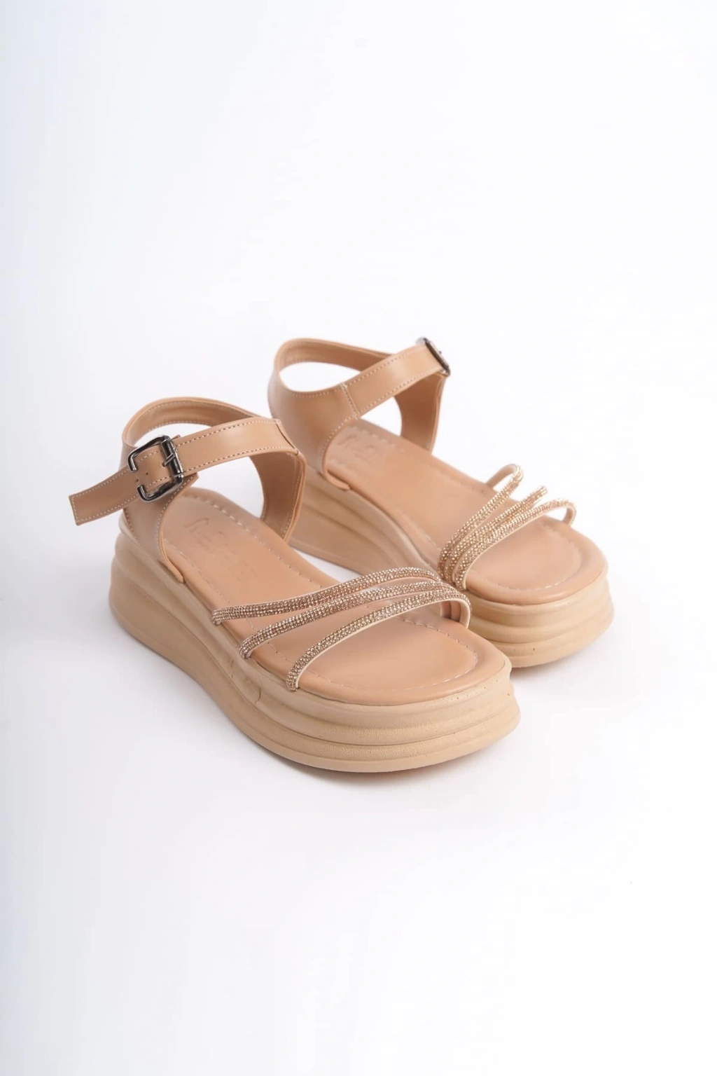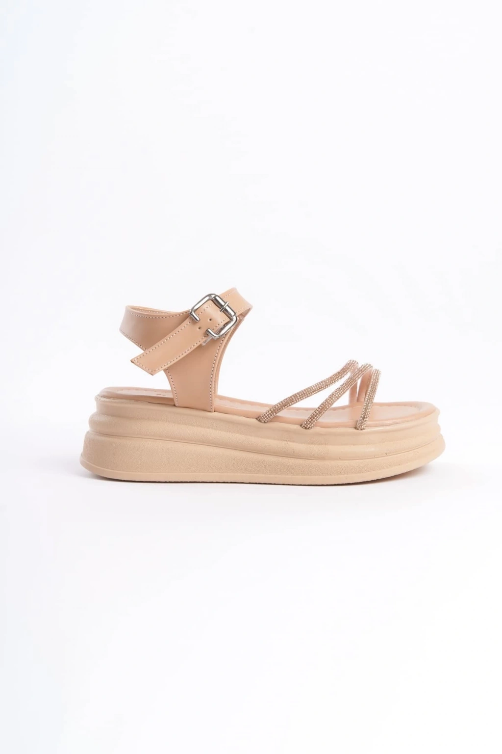 EVA Kalın Tokalı Taşlı Şeritli Ortopedik Taban Kadın Sandalet CTT - Ten