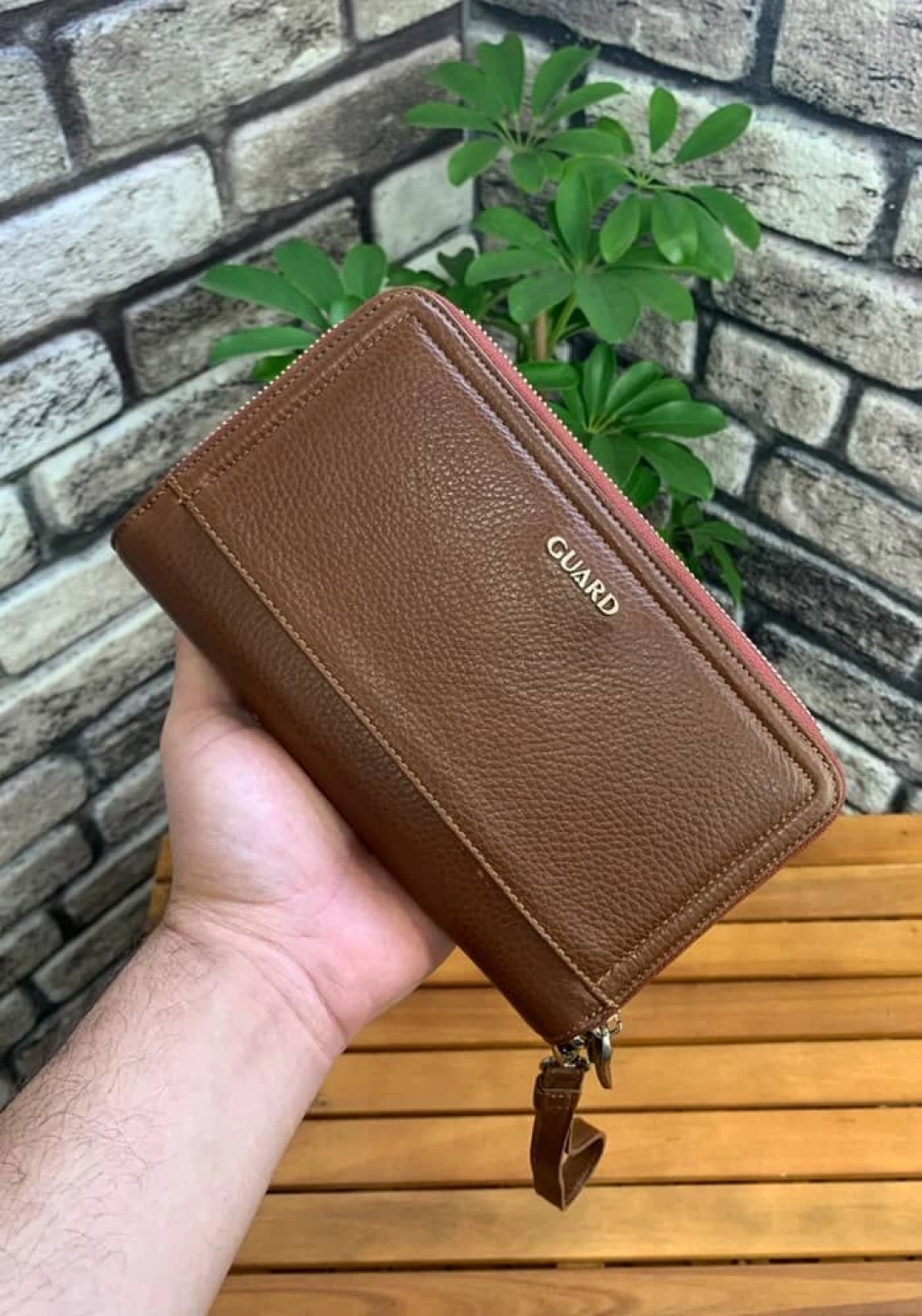 Guard Çift Fermuarlı Taba Deri El Çantası