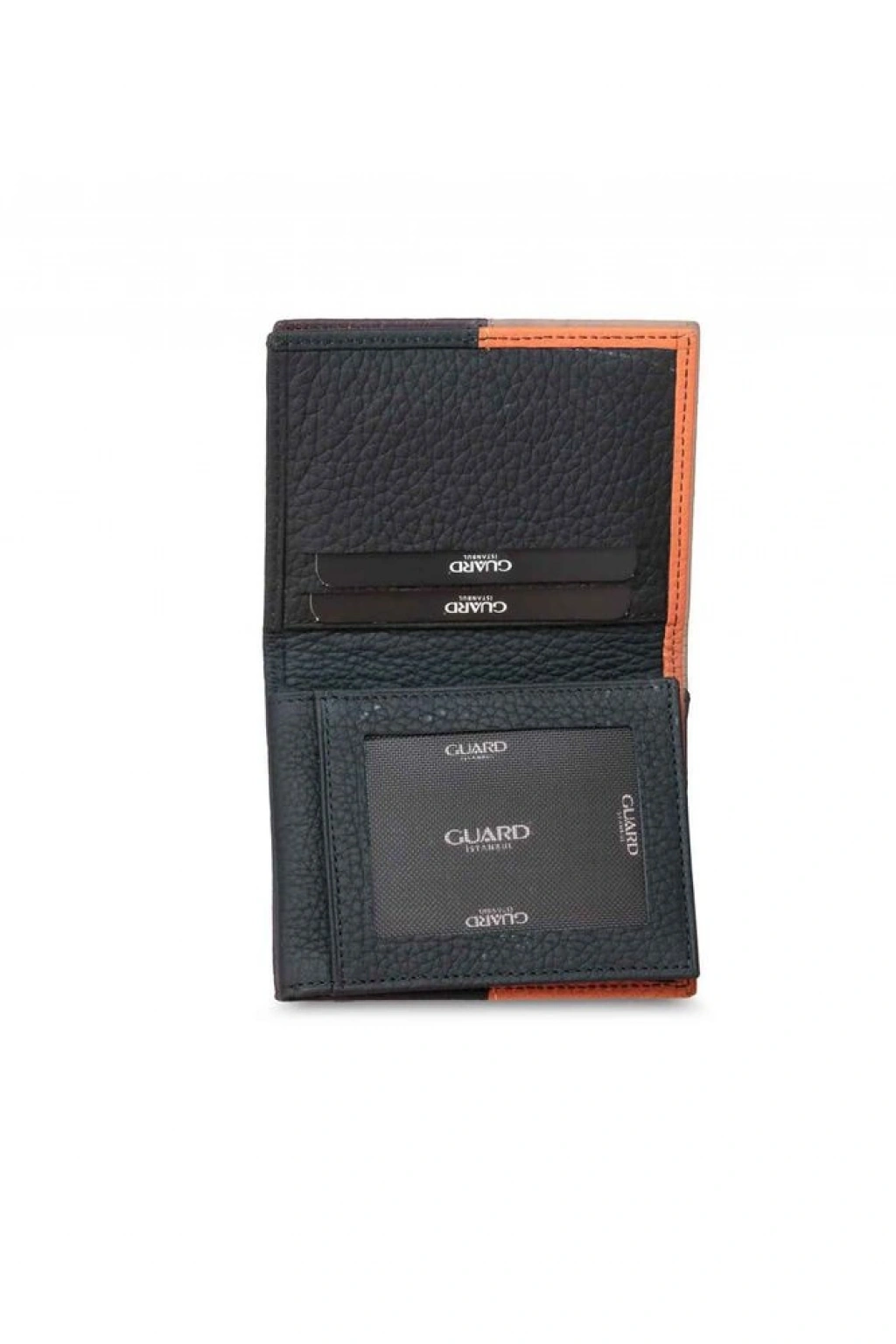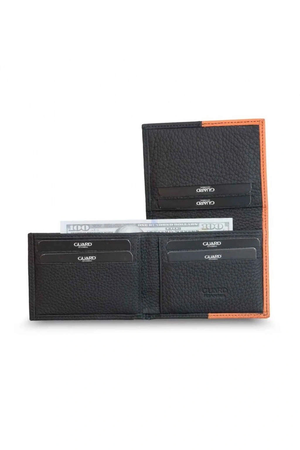 Mat siyah/turuncu deri erkek cüzdan minimal spor tasarıma sahiptir. Toplamda 6 adet kart, 1 adet şeffaf kimlik/ehliyet, 3 adet gizli cep bulunmaktadır, ayrıca 1 adet de kağıt para bölümü var.
