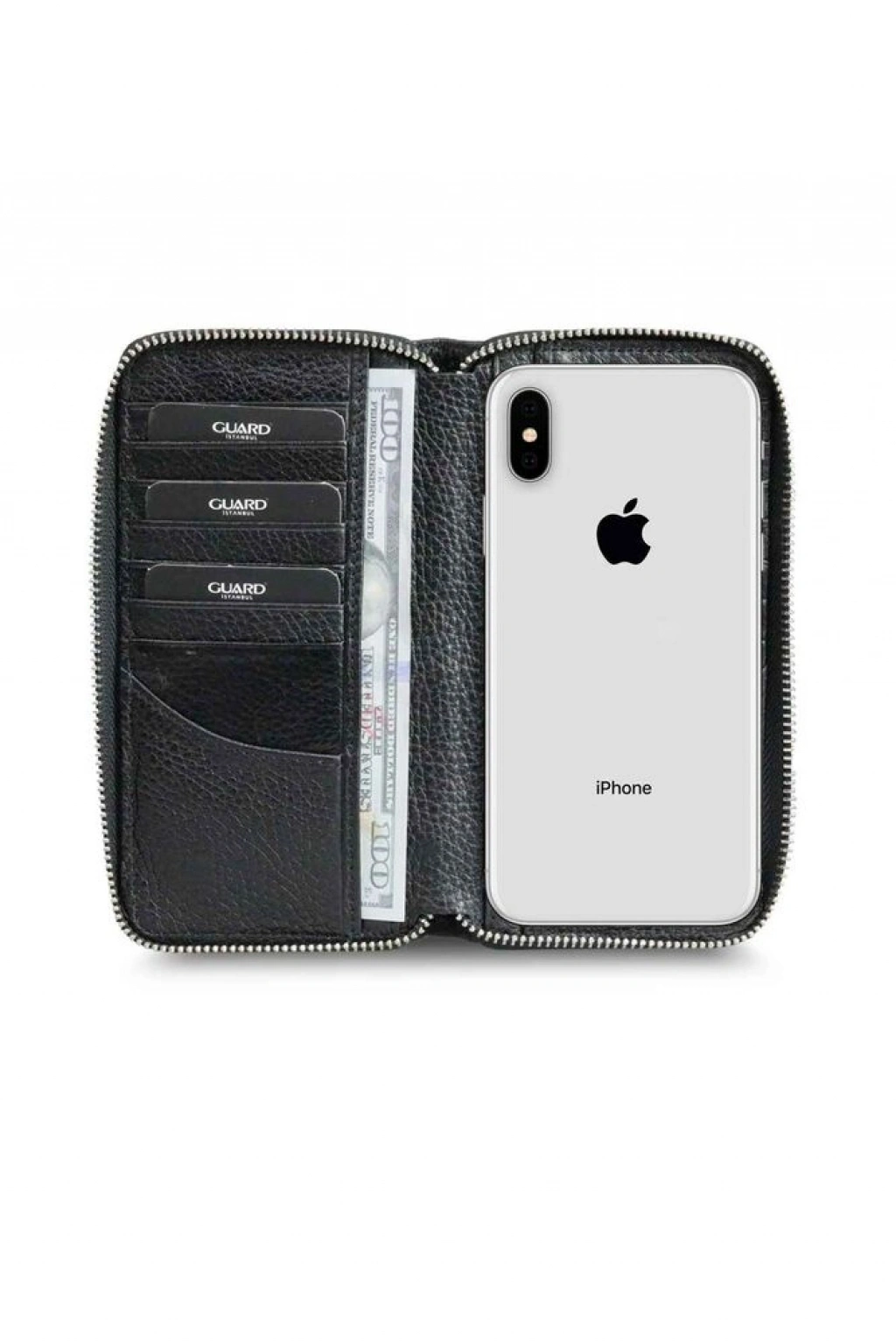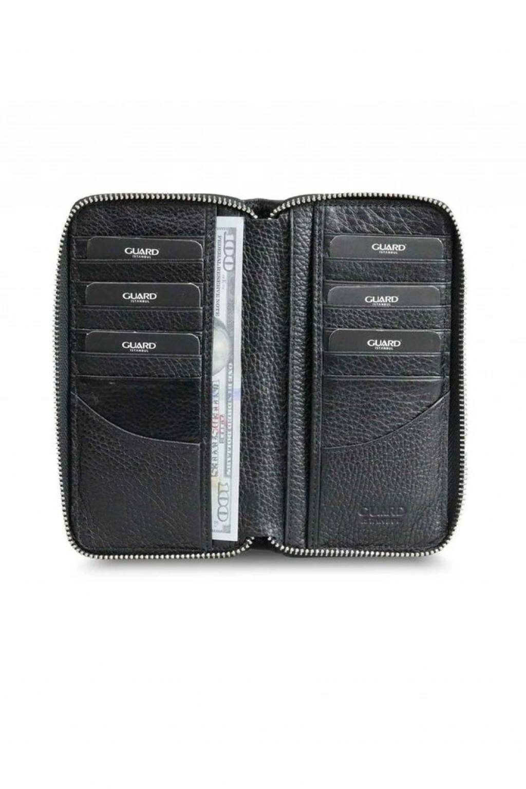 Fermuarlı ana bölüm içerisinde 14 adet kartlık, 2 adet cep ve 4 adet kağıt para bölmesi mevcuttur.
