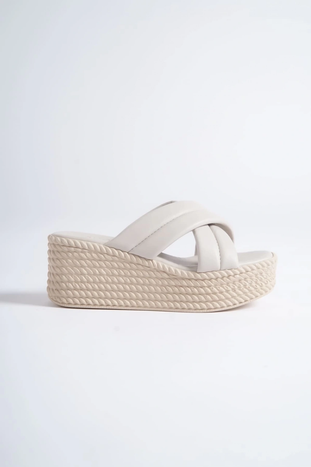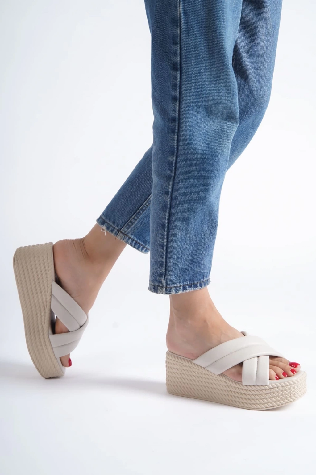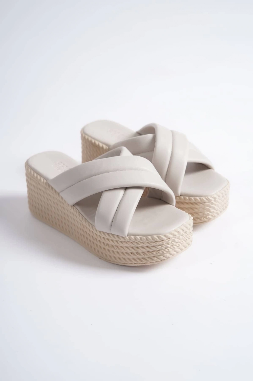 JOYMIX Dolgu Topuklu Ortopedik Taban Hasır Görünümlü Kadın Terlik CKT - Krem