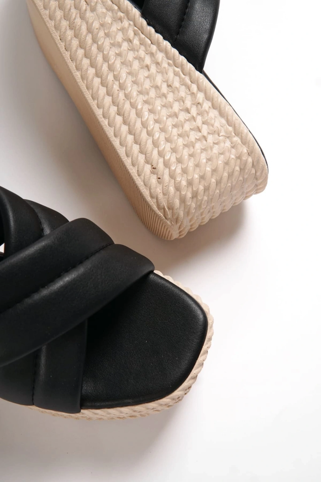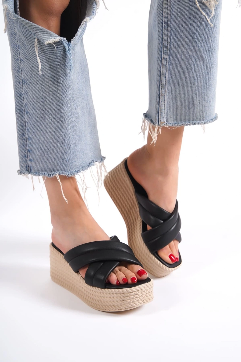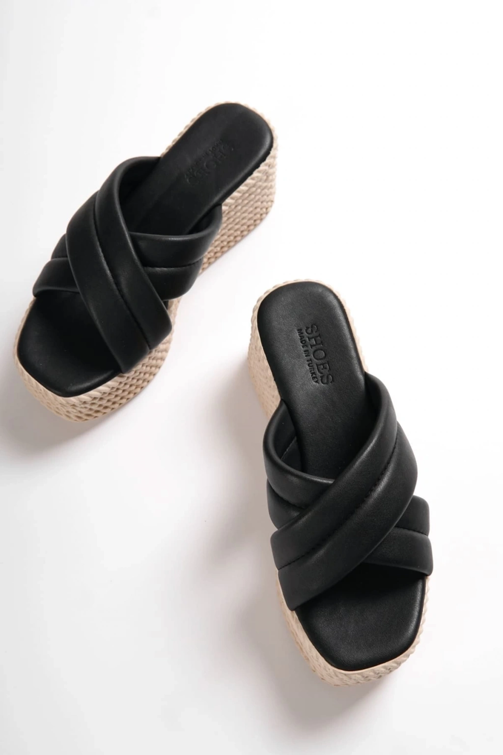 JOYMIX Dolgu Topuklu Ortopedik Taban Hasır Görünümlü Kadın Terlik CKT - Siyah