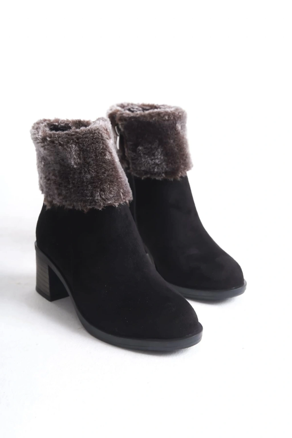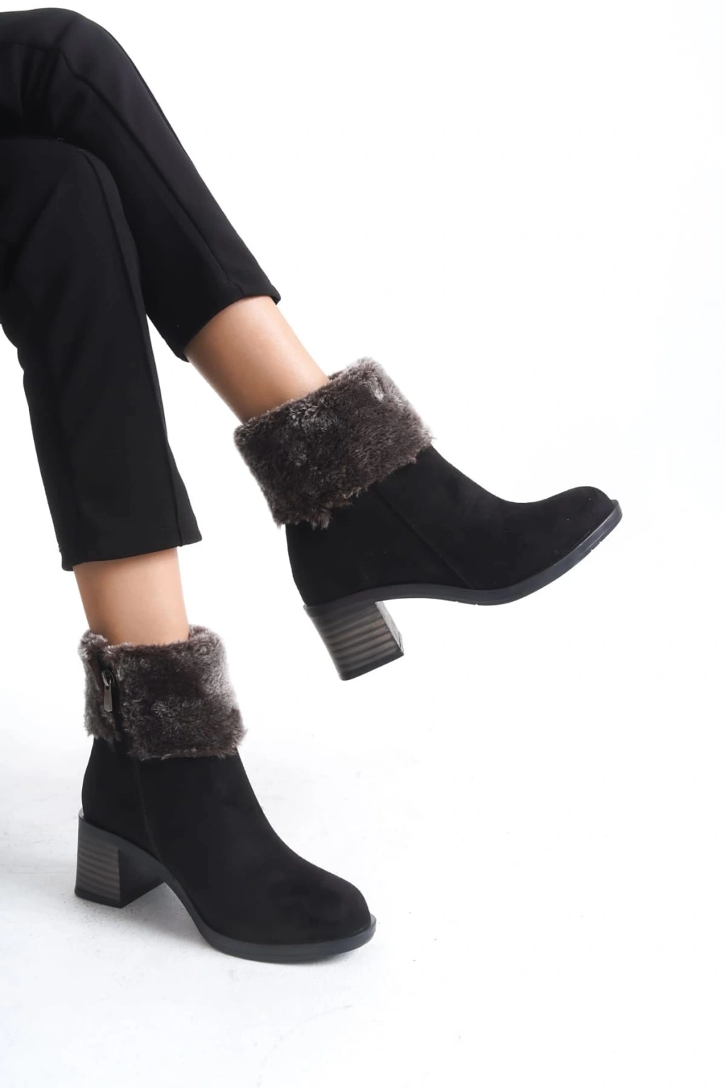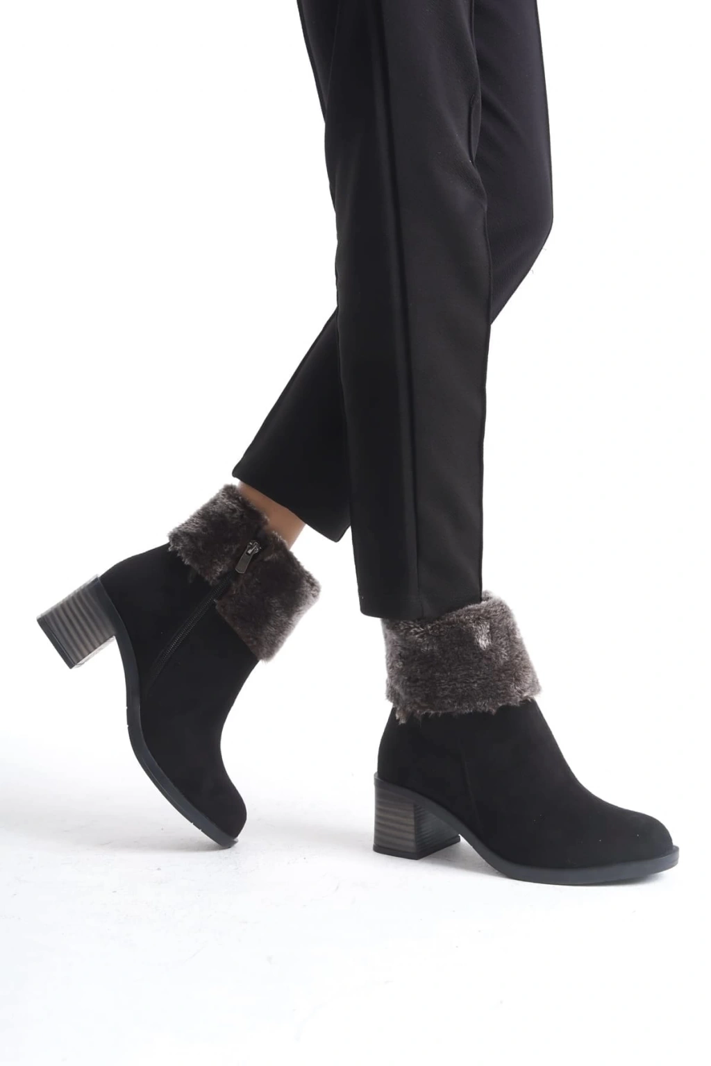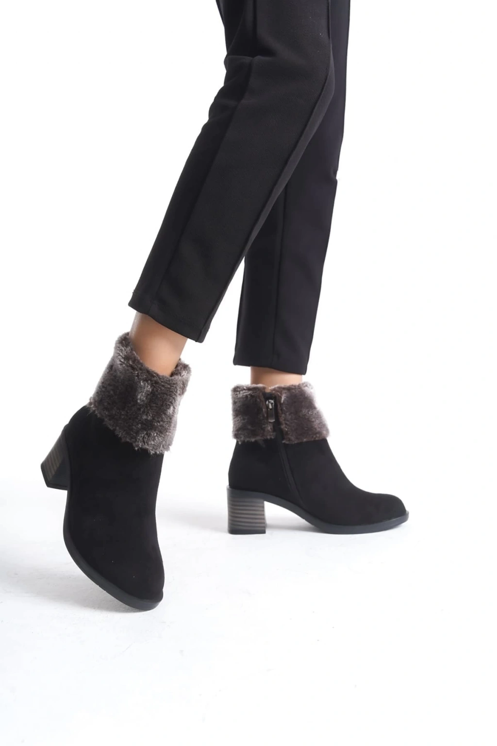 KATYA Fermuarlı Ortopedik Taban Topuklu Kürk Detaylı Süet Kadın Bot SST - Siyah