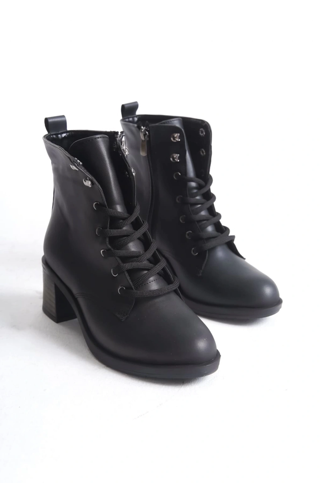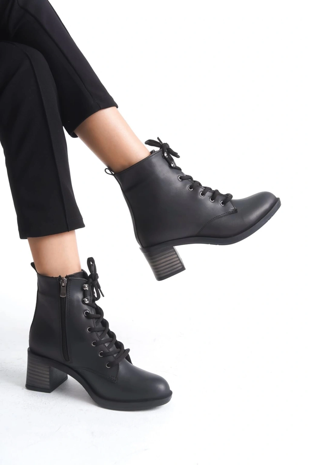 LENA Bağcıklı Fermuarlı Ortopedik Taban Topuklu Kadın Bot CST - Siyah