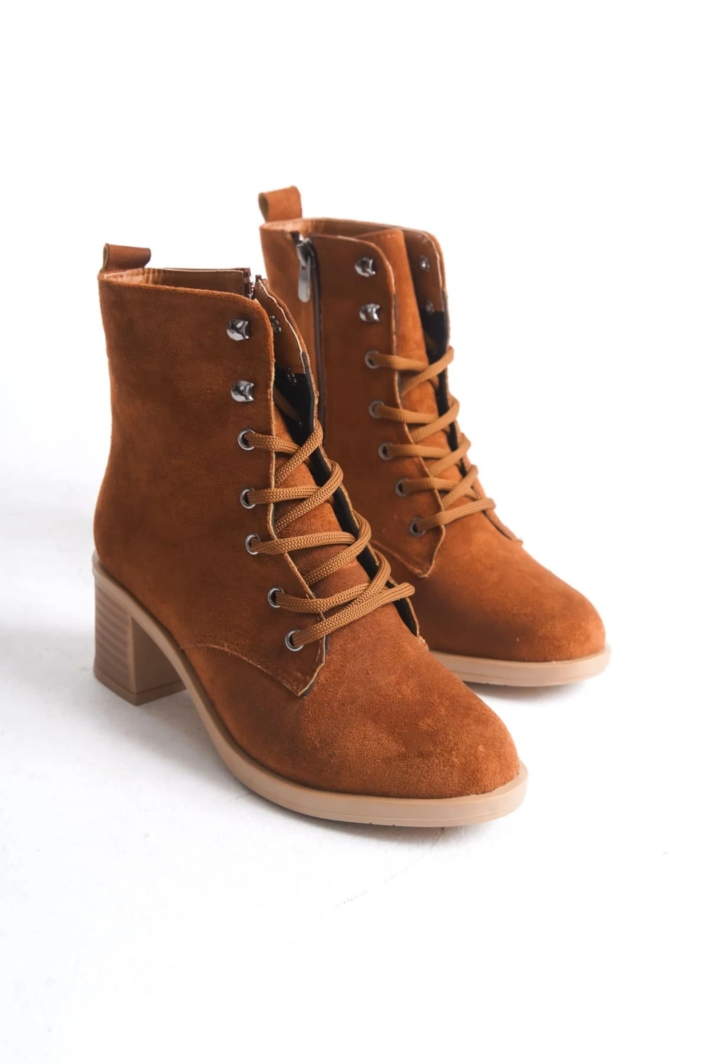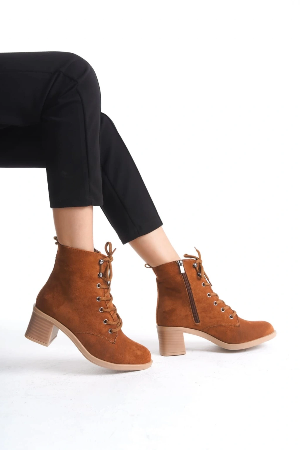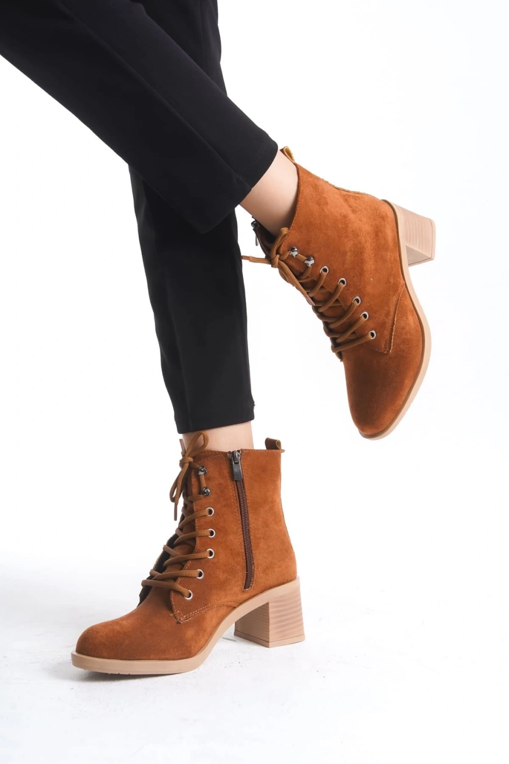 LENA Bağcıklı Fermuarlı Ortopedik Taban Topuklu Süet Kadın Bot STT - Taba