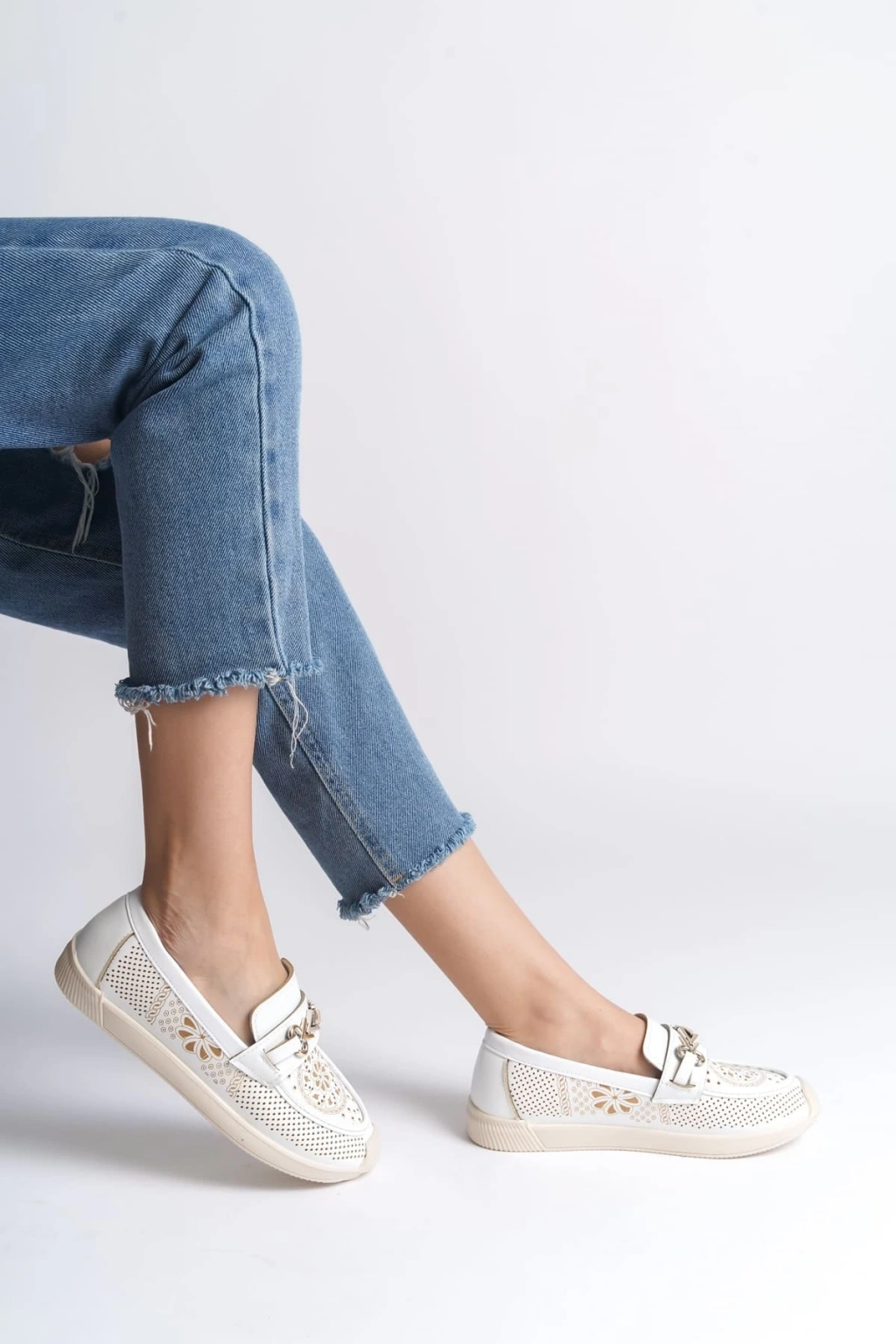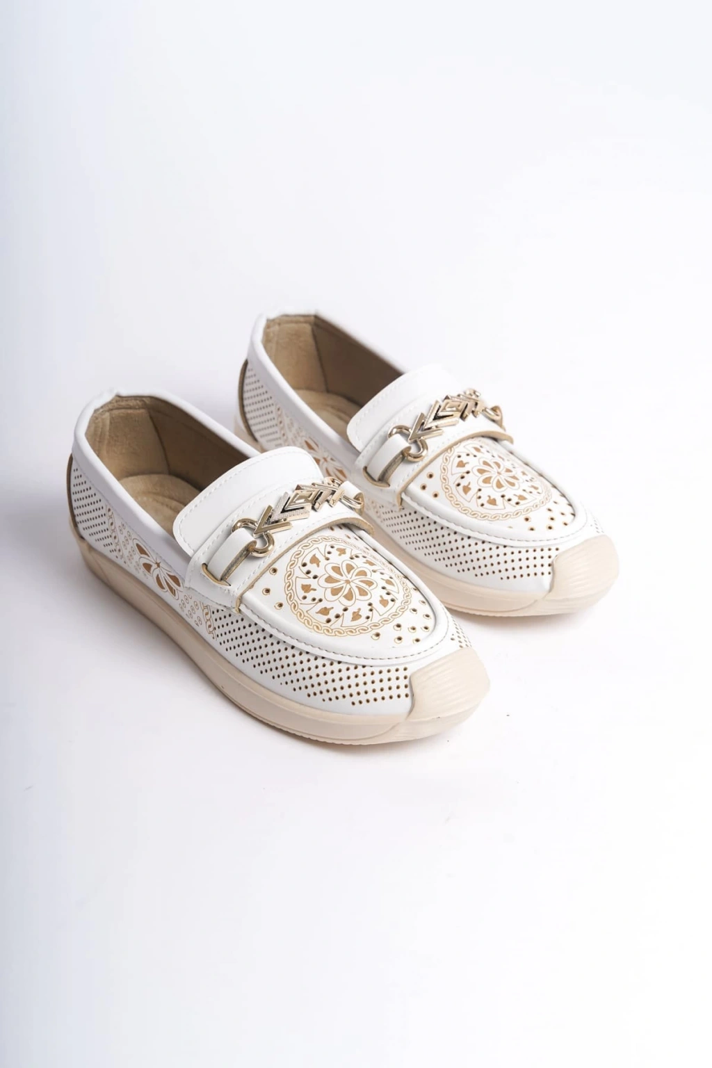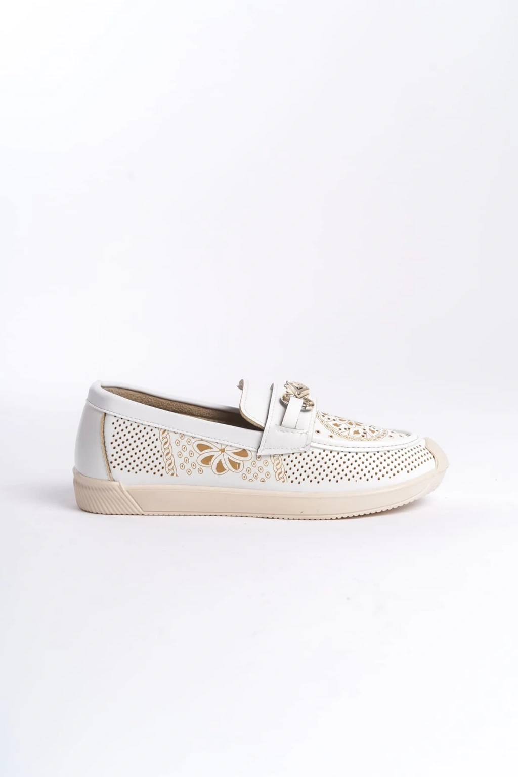 LILY Bağcıksız Ortopedik Rahat Taban Çiçek Desenli Kadın Babet Ayakkabı CKT - Beyaz