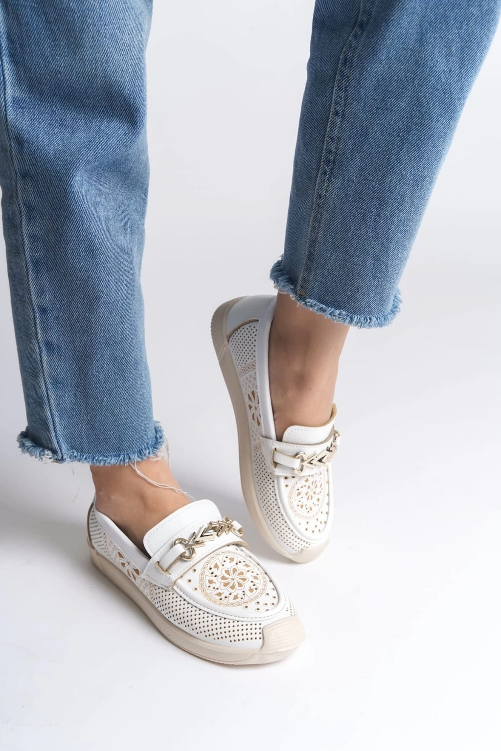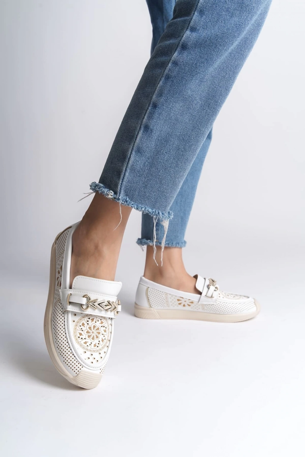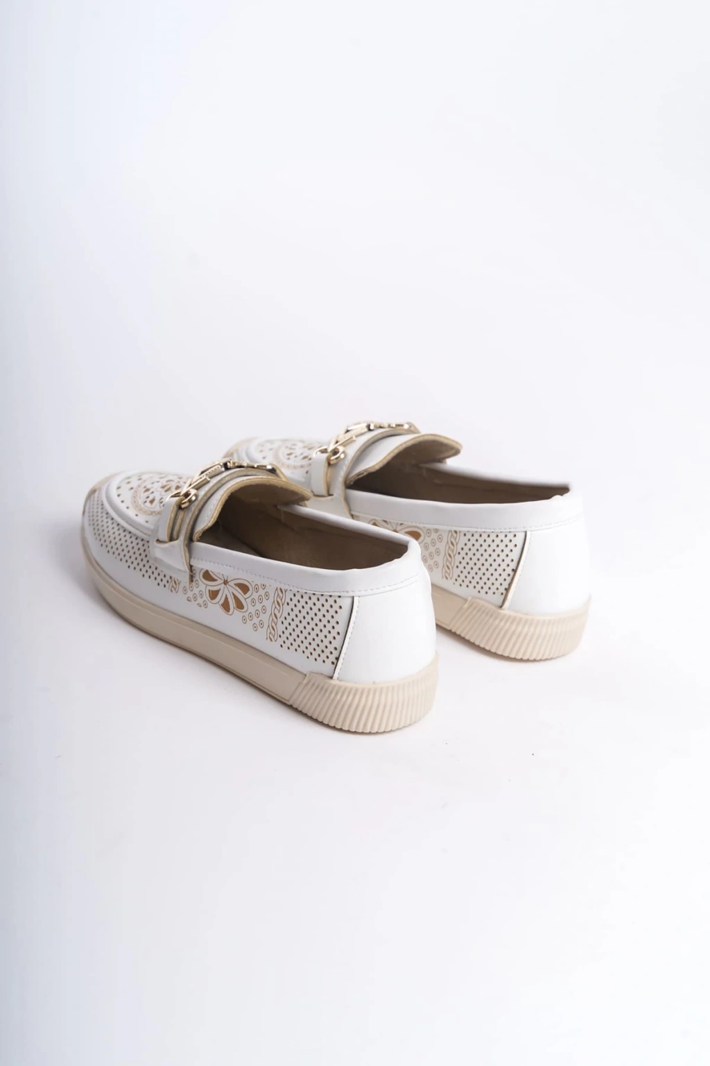 LILY Bağcıksız Ortopedik Rahat Taban Çiçek Desenli Kadın Babet Ayakkabı CKT - Beyaz