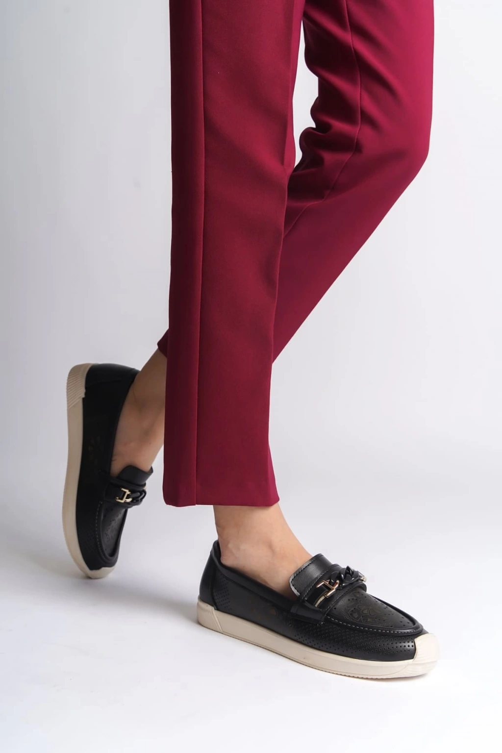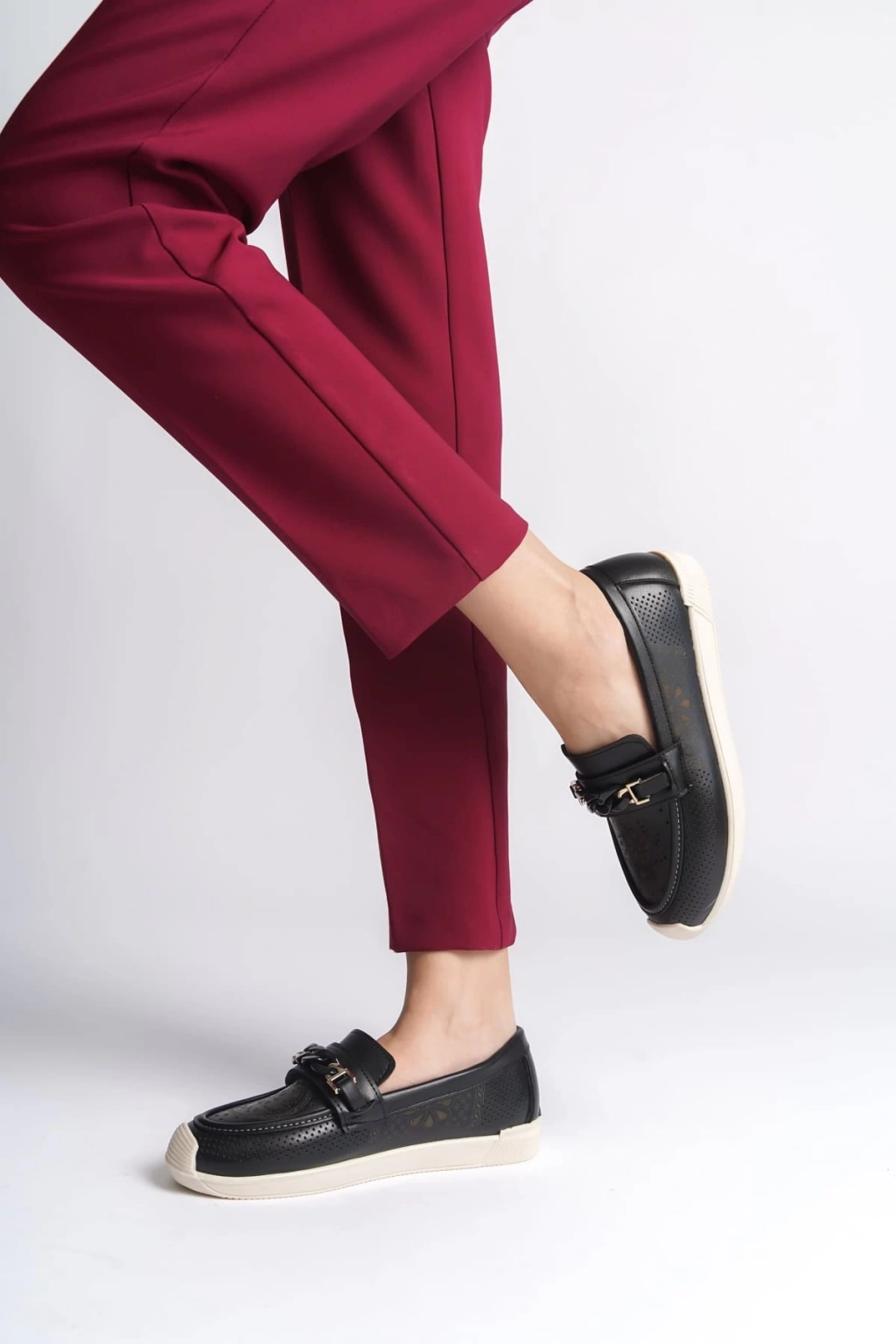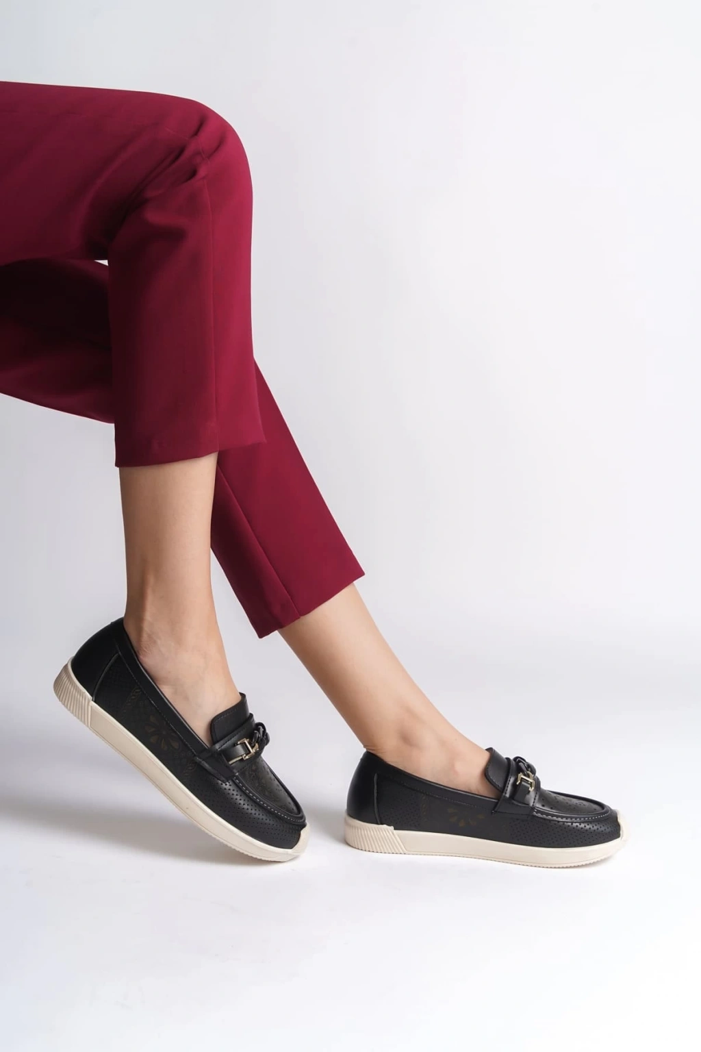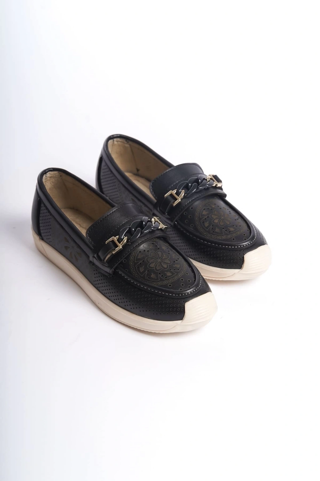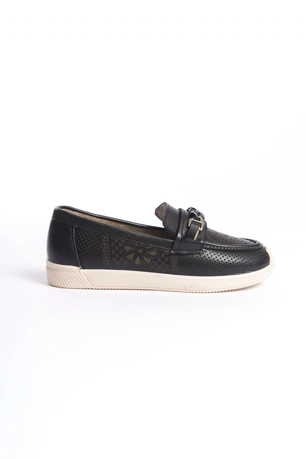 LIZY Bağcıksız Ortopedik Rahat Taban Çiçek Desenli Kadın Babet Ayakkabı CKT - Siyah