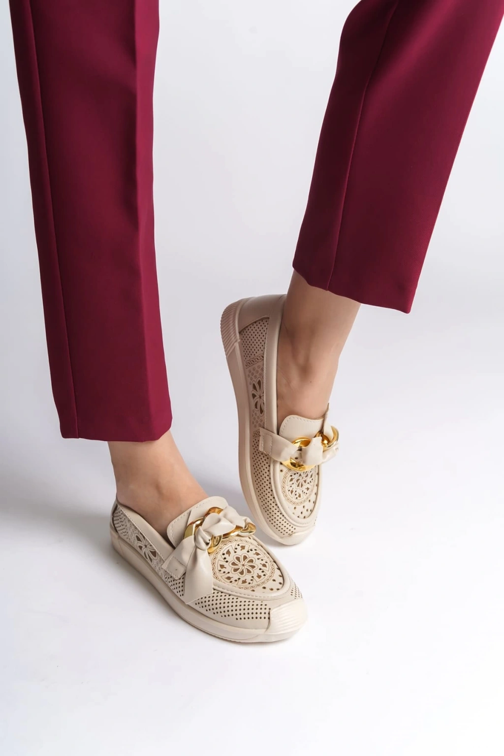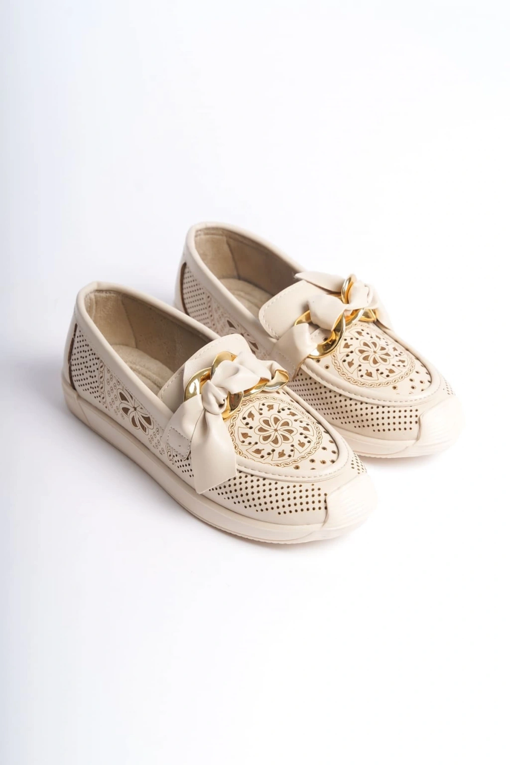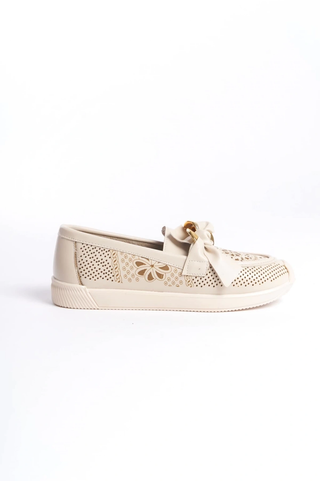 LYDIA Bağcıksız Ortopedik Rahat Taban Çiçek Desenli Kadın Babet Ayakkabı CKT - Krem