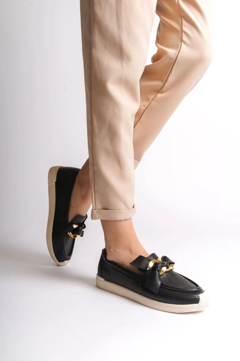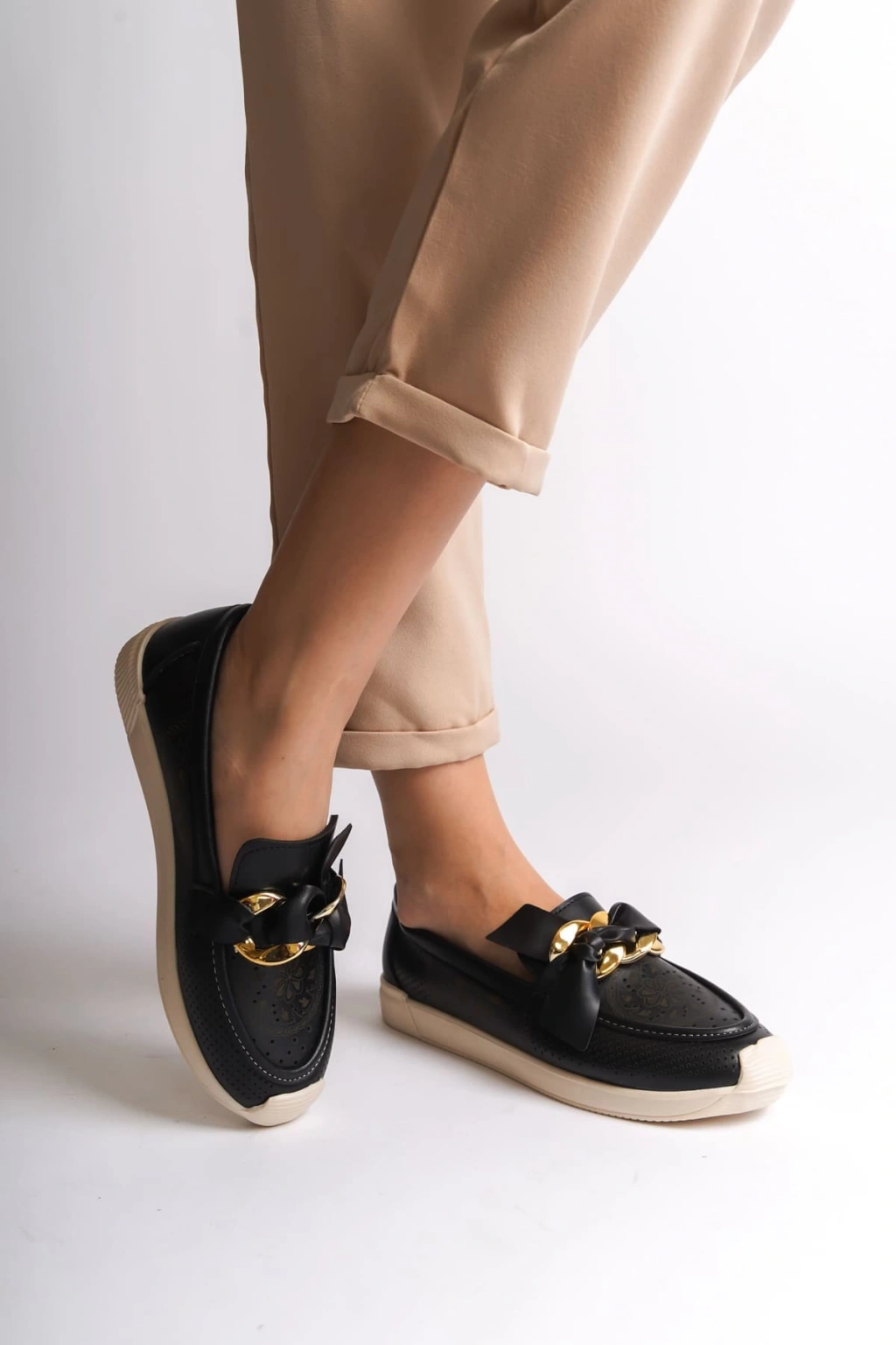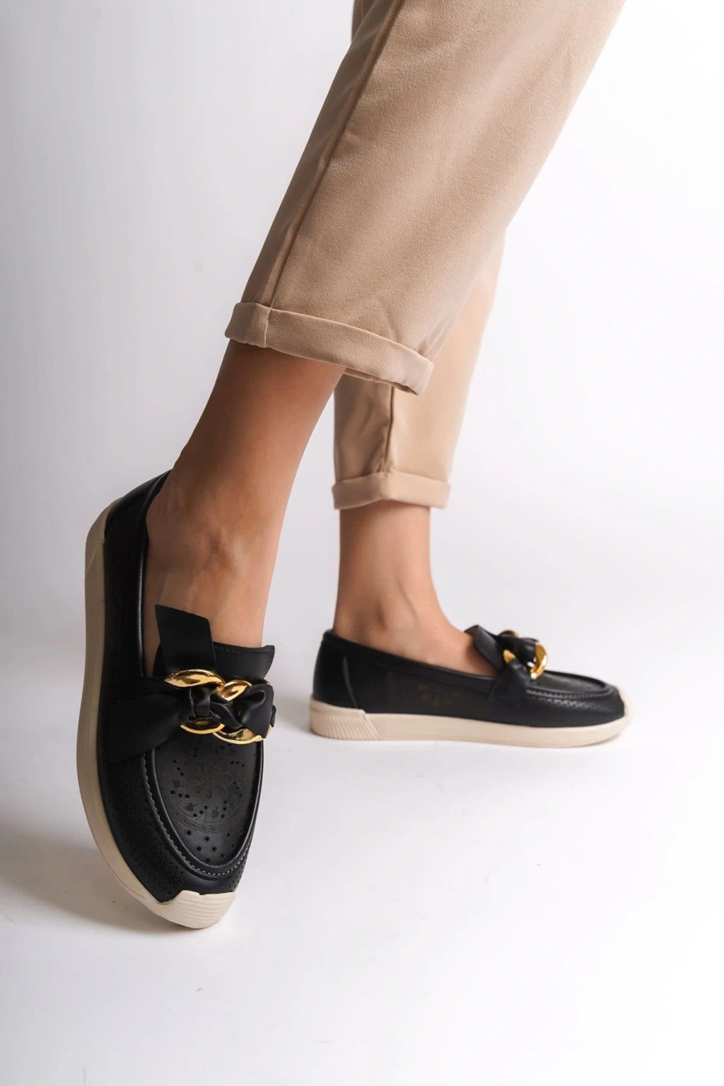 LYDIA Bağcıksız Ortopedik Rahat Taban Çiçek Desenli Kadın Babet Ayakkabı CKT - Siyah