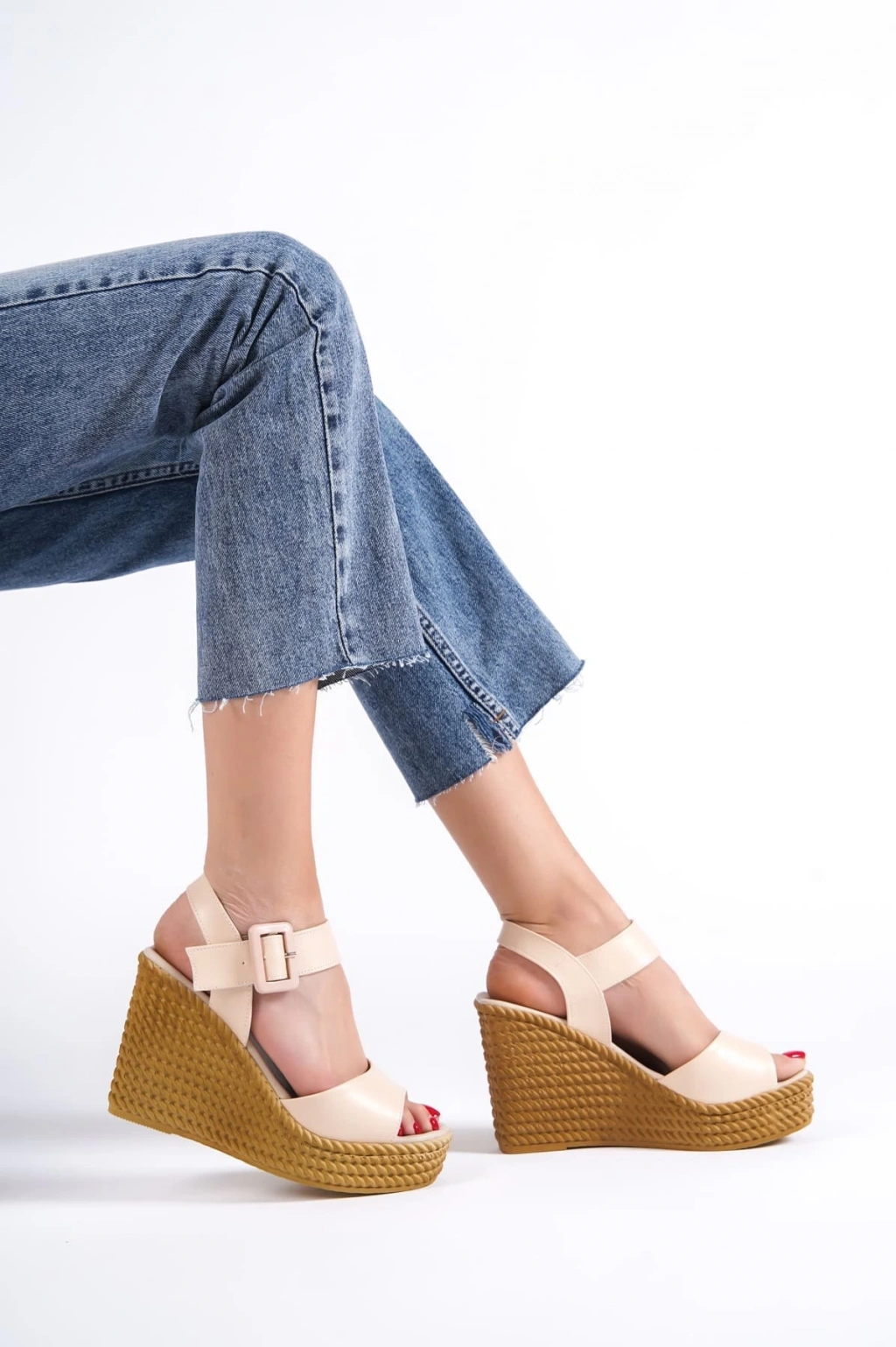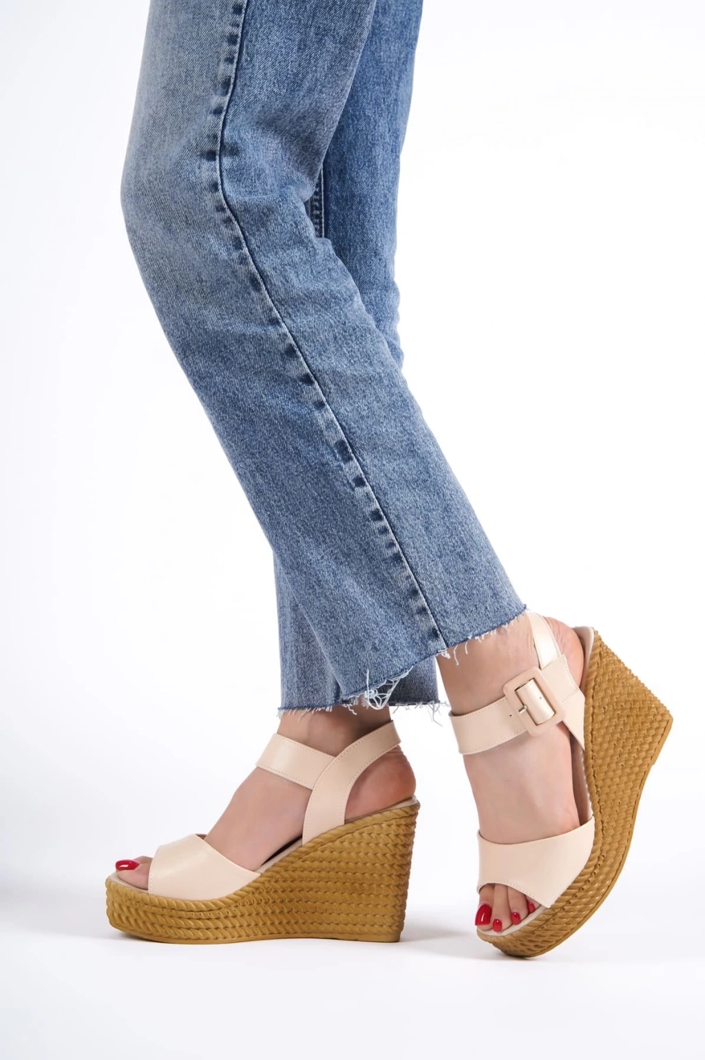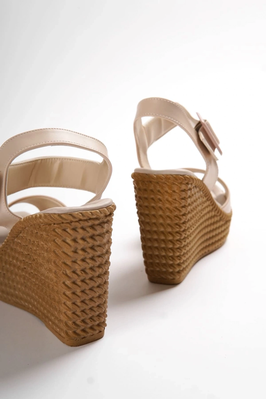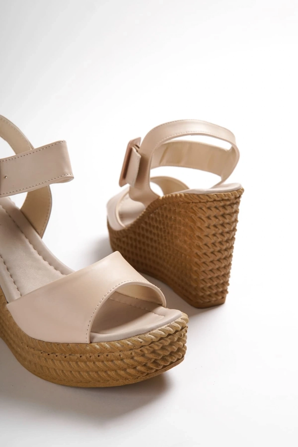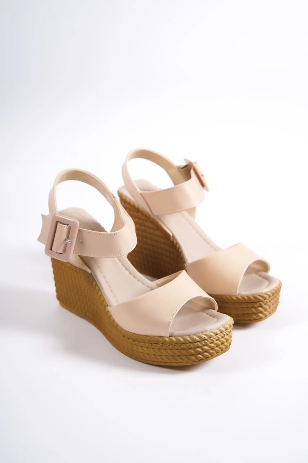 PERLA Tokalı Lastikli Dolgu Topuklu Ortopedik Taban Hasır Görünümlü Kadın Sandalet CKT - Ten