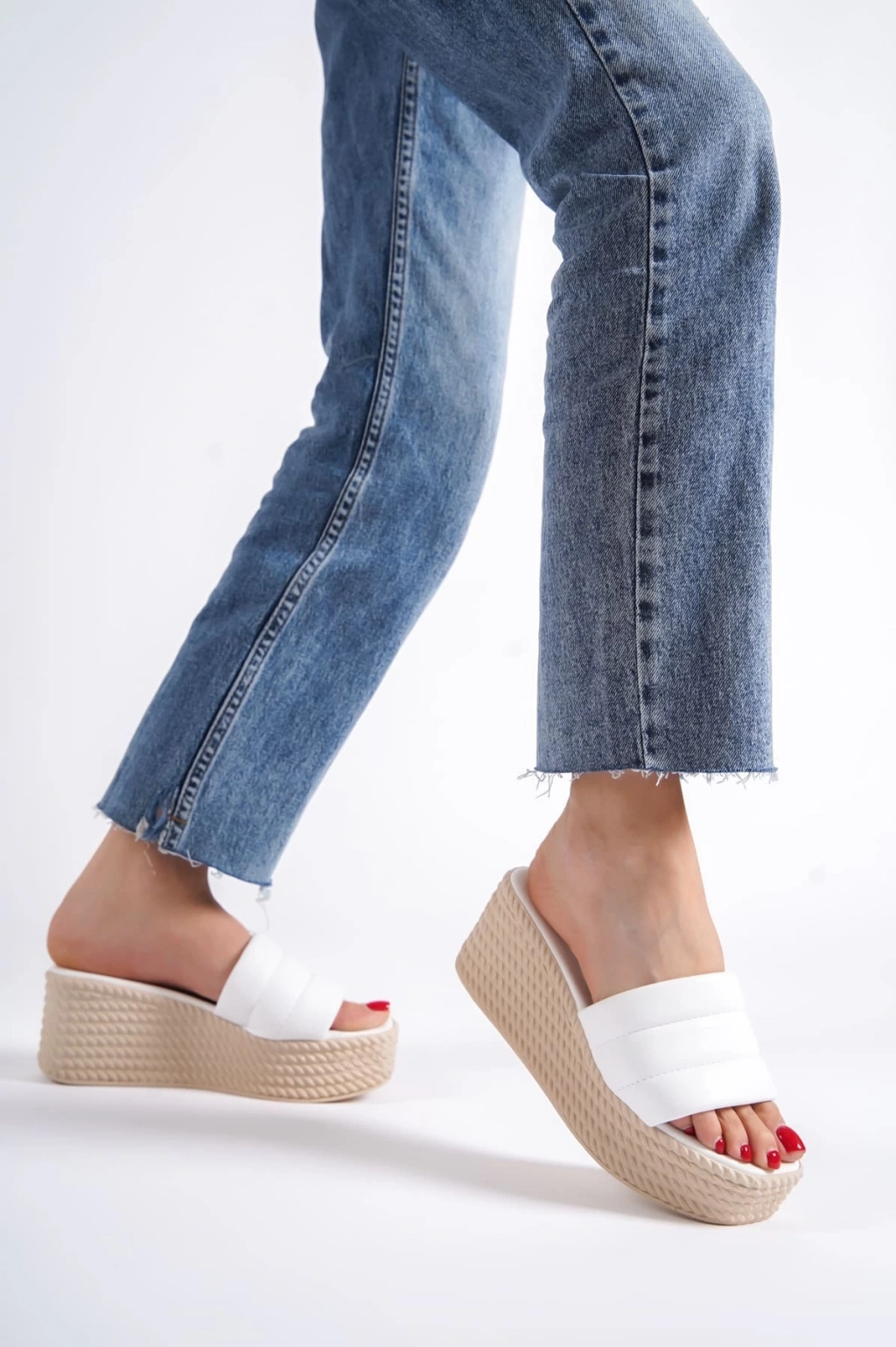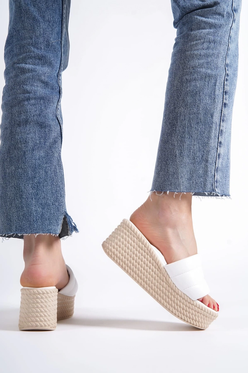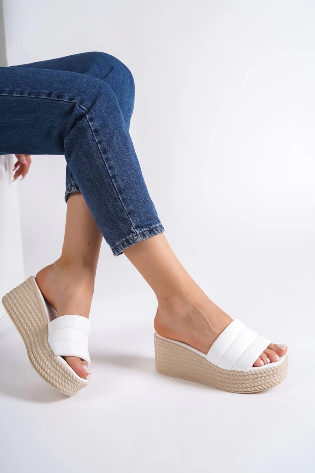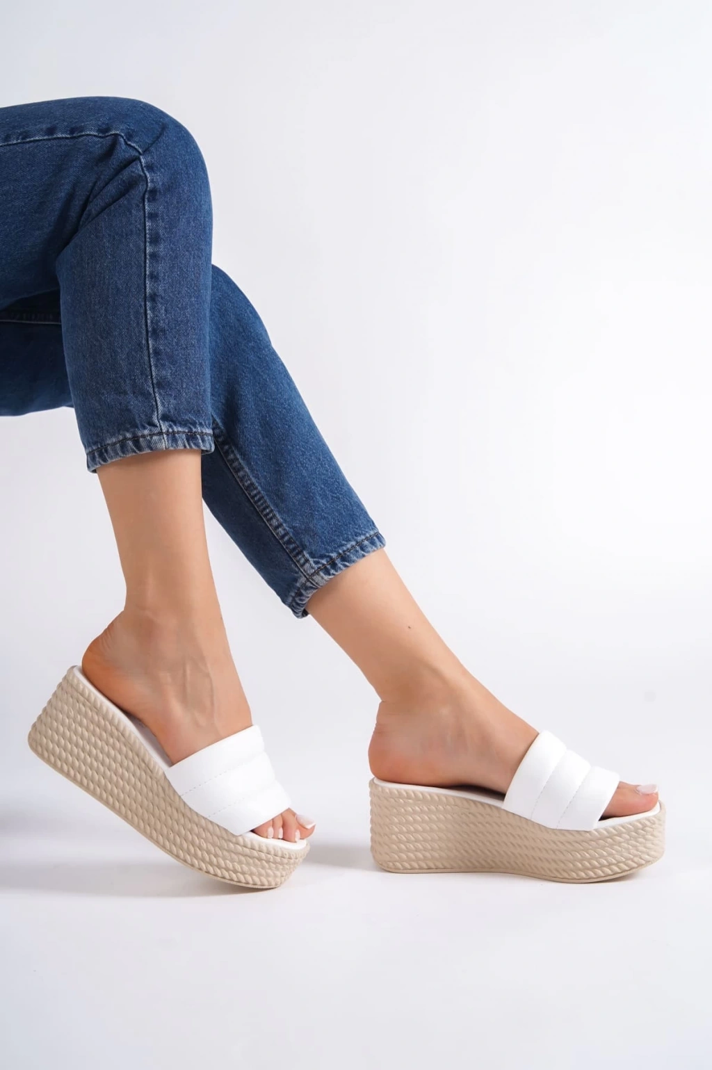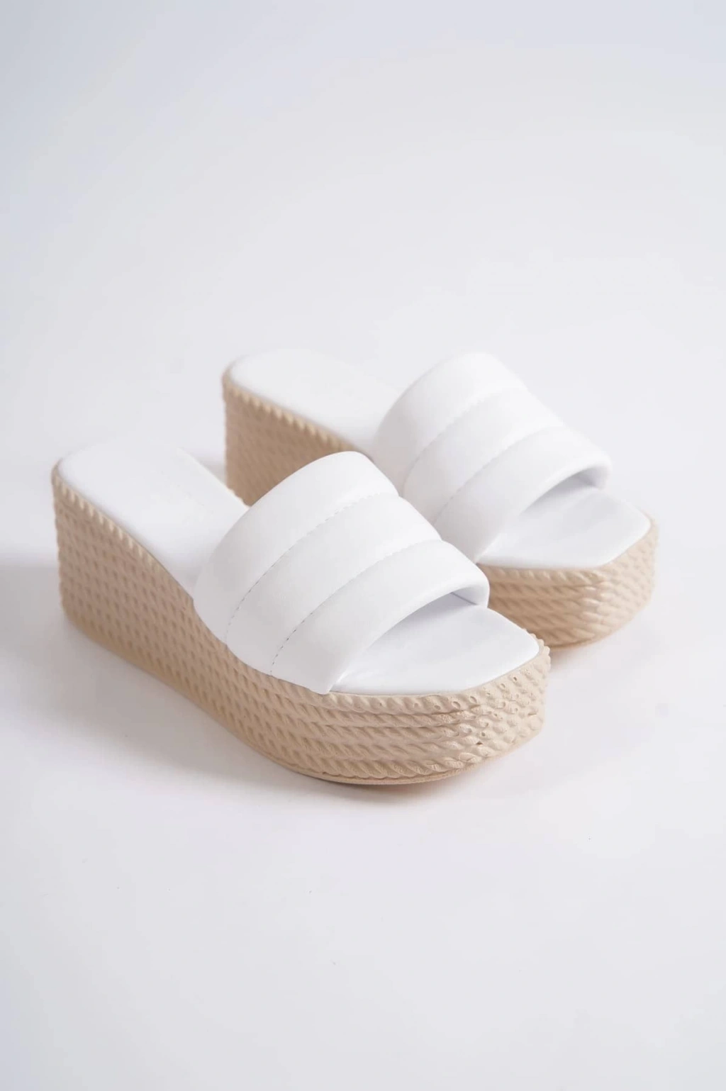 REINA Dolgu Topuklu Ortopedik Taban Hasır Görünümlü Kadın Terlik CKT - Beyaz