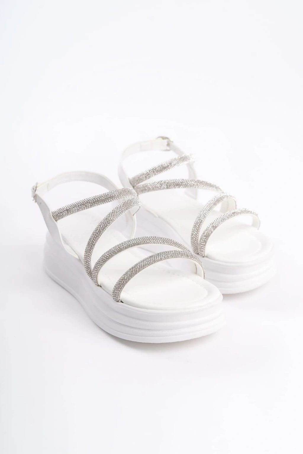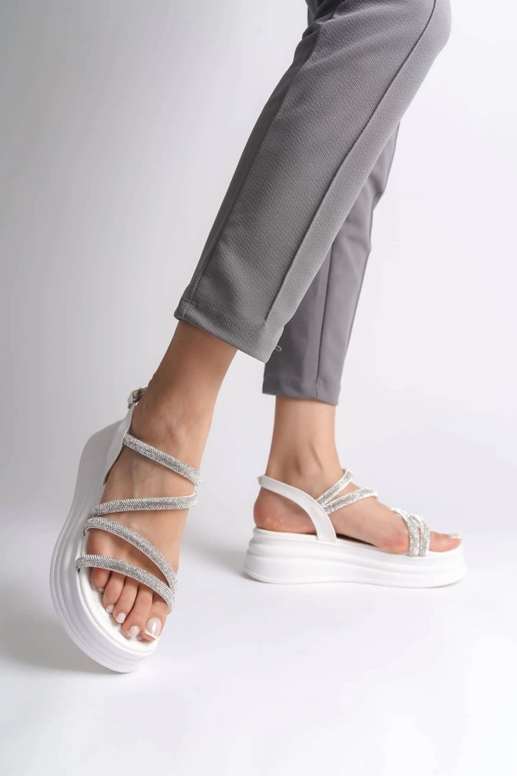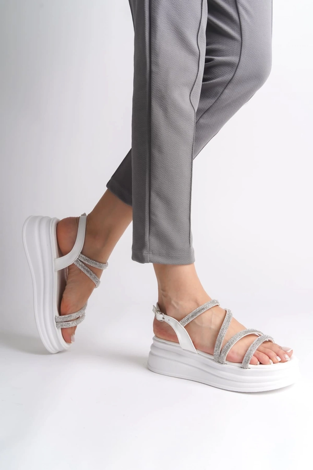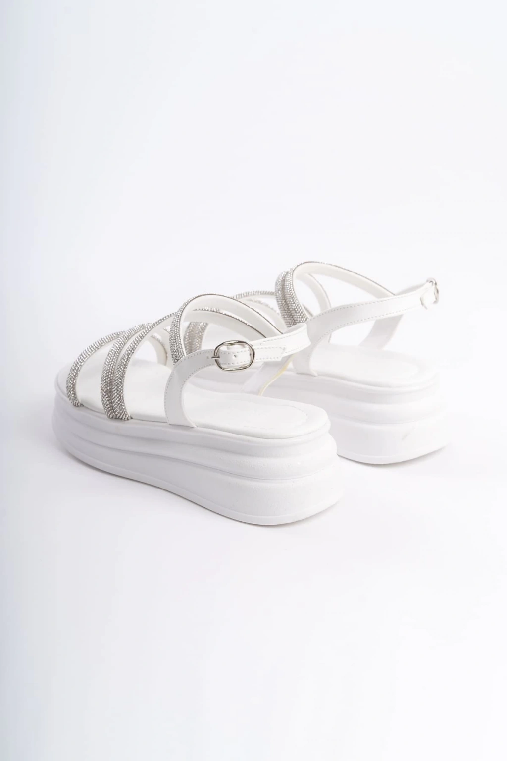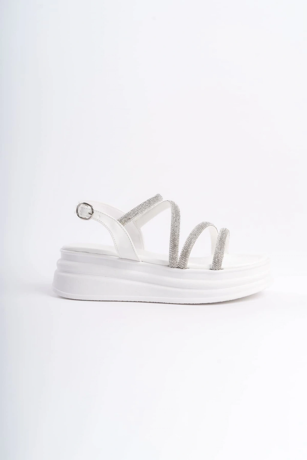 RILEY İnce Tokalı Taşlı Şeritli Ortopedik Taban Kadın Sandalet CBT - Beyaz