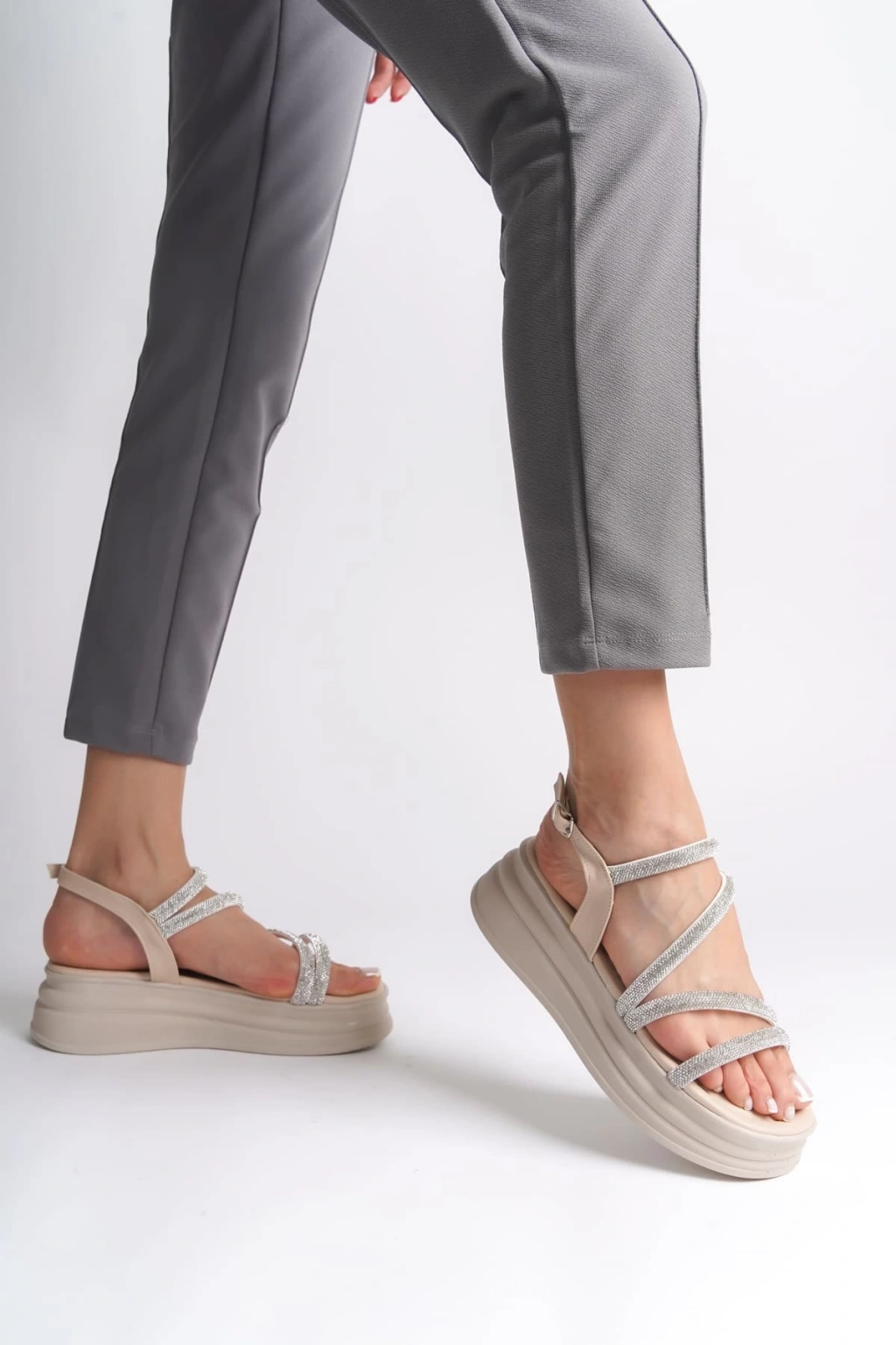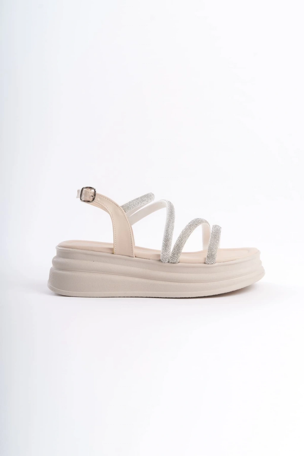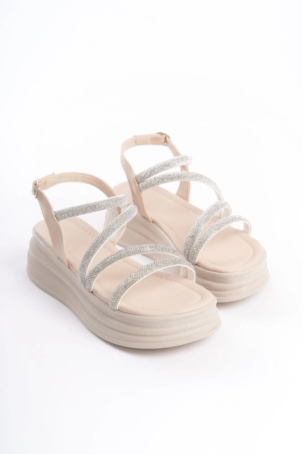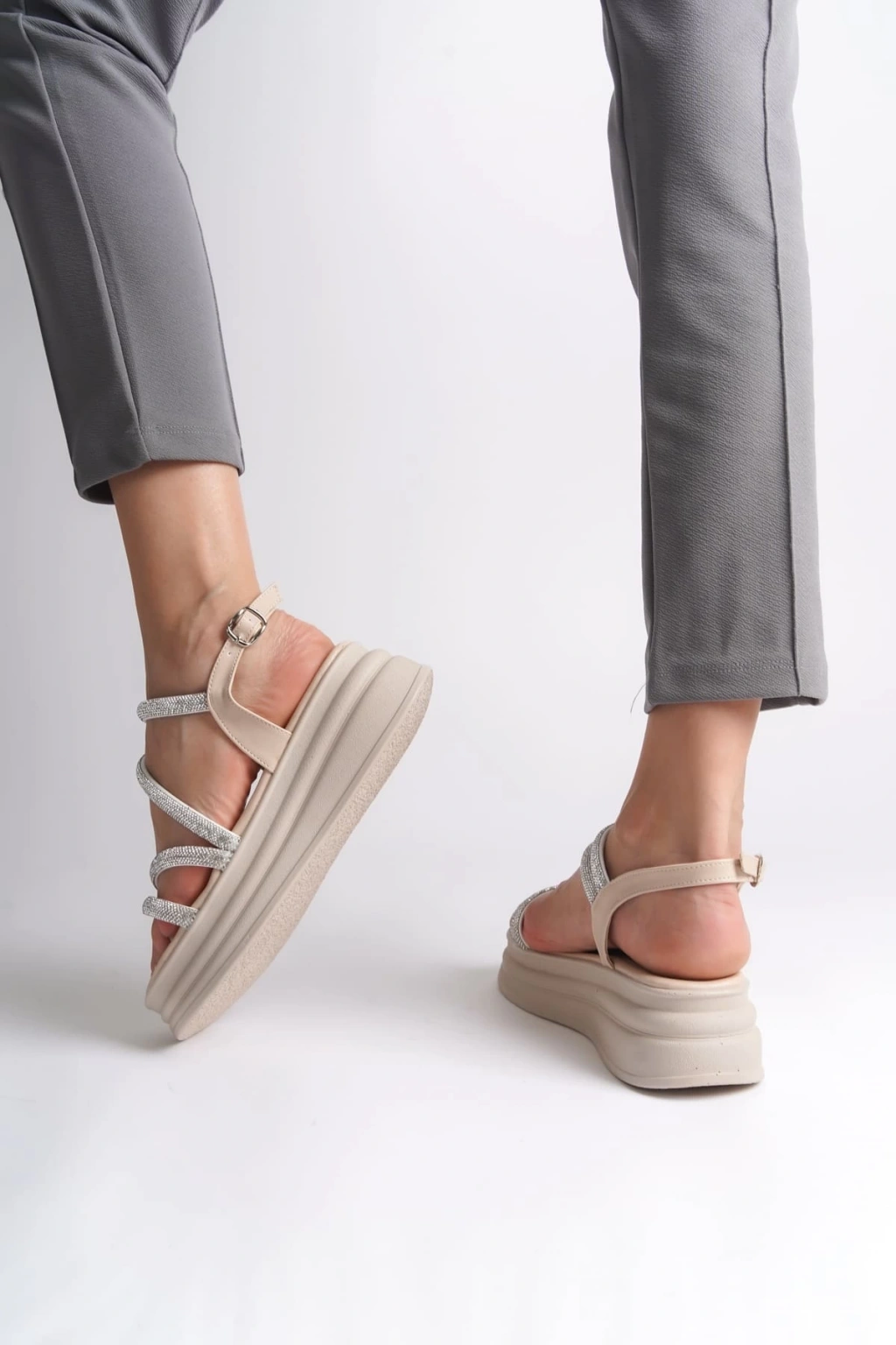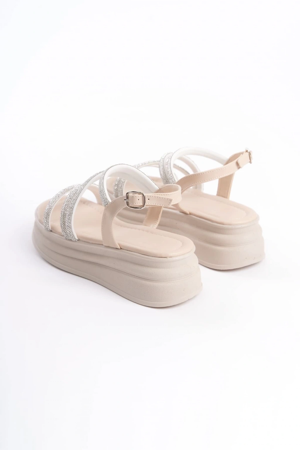 RILEY İnce Tokalı Taşlı Şeritli Ortopedik Taban Kadın Sandalet CKT - Krem