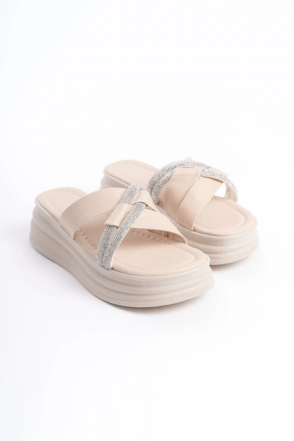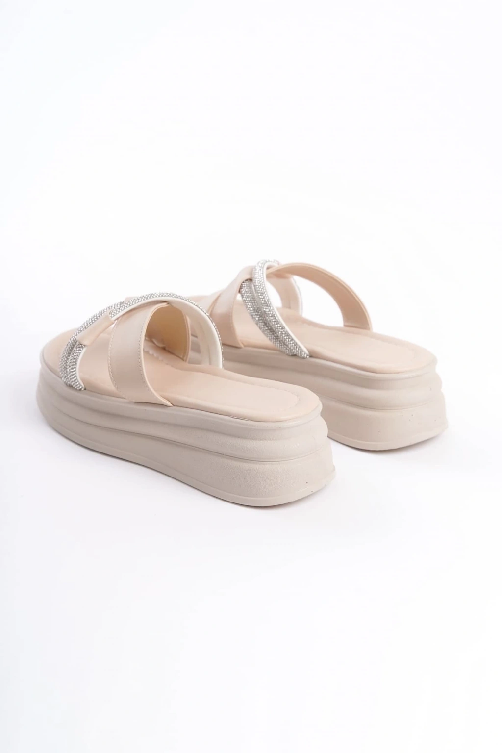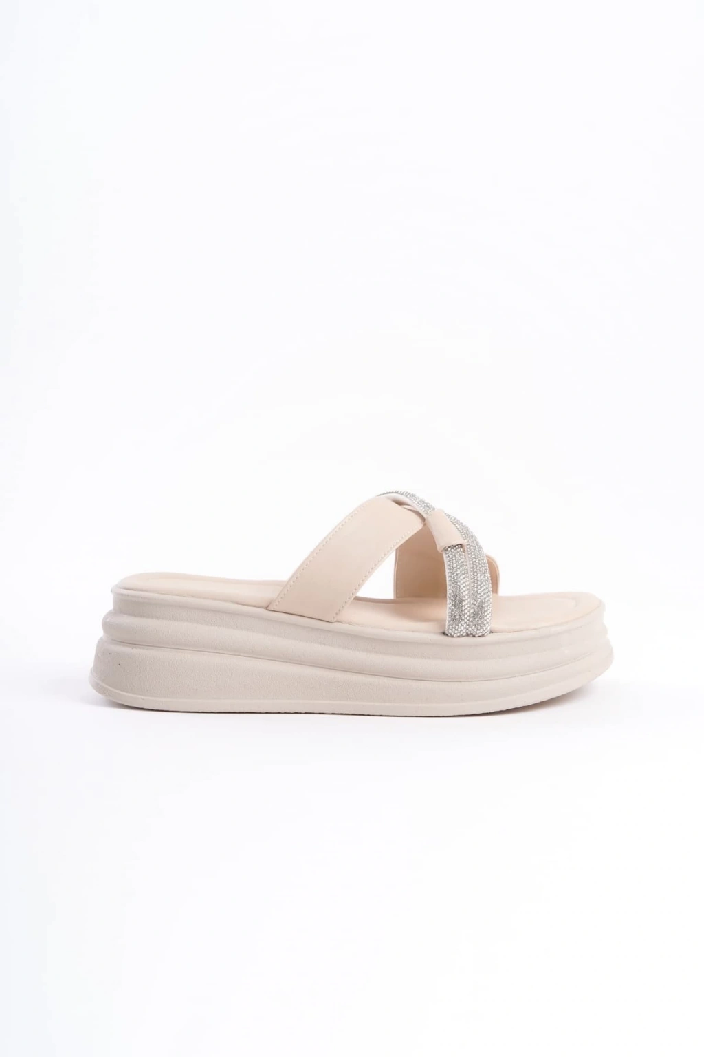 RUBY Düz Topuklu Taşlı Çapraz Şeritli Kalın ve Ortopedik Taban Kadın Terlik CKT - Krem