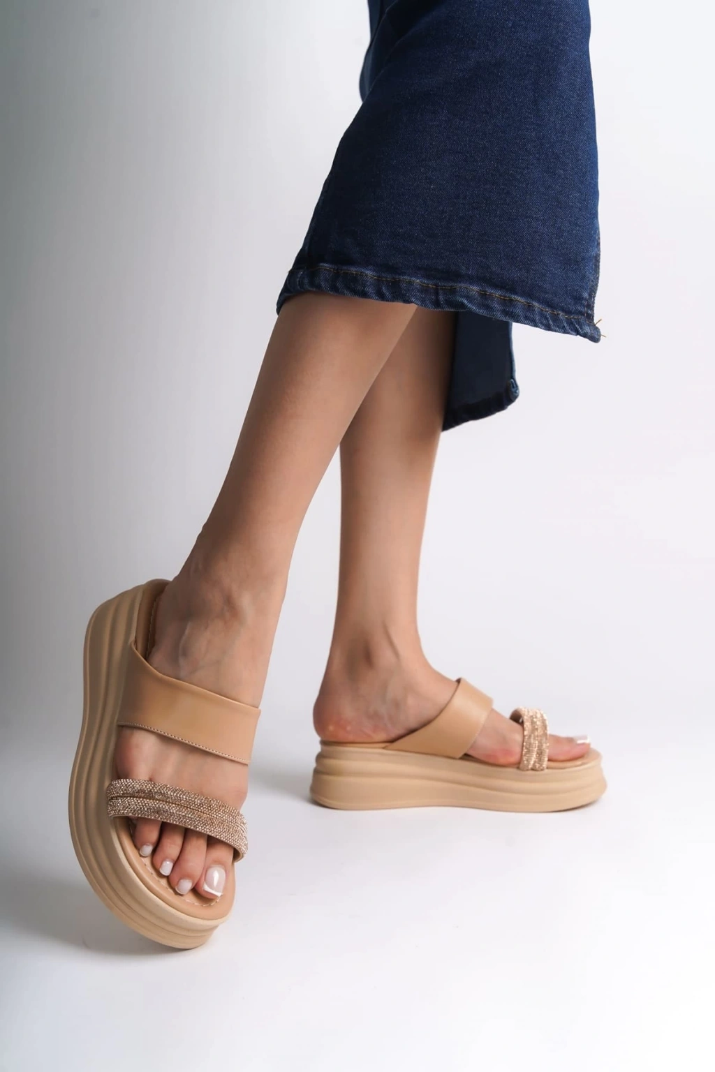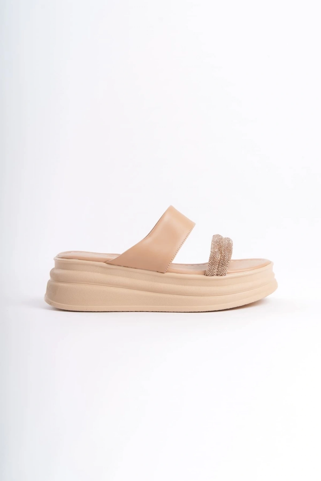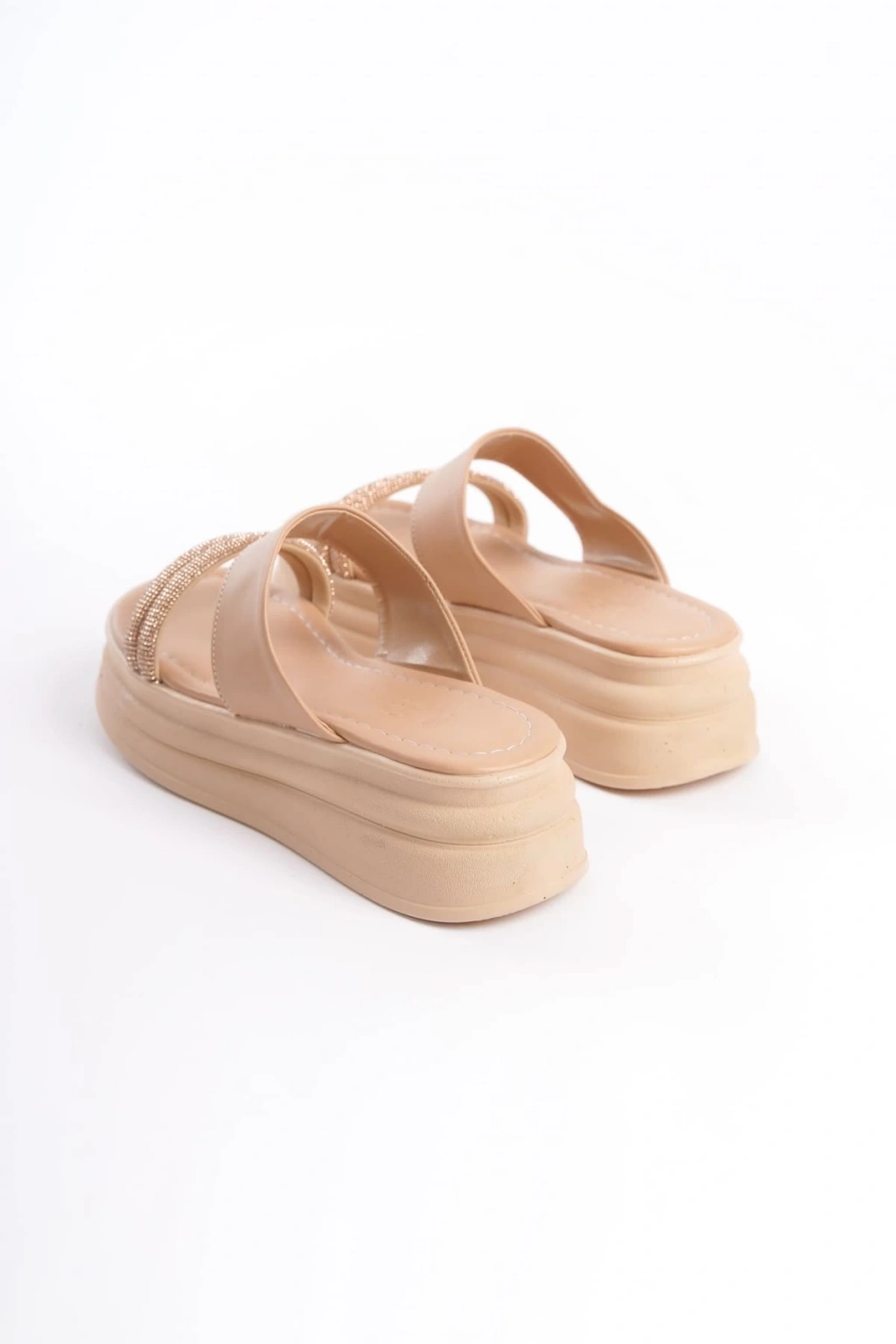 SARAH Düz Topuklu Taşlı Şeritli Kalın ve Ortopedik Taban Kadın Terlik CTT - Ten