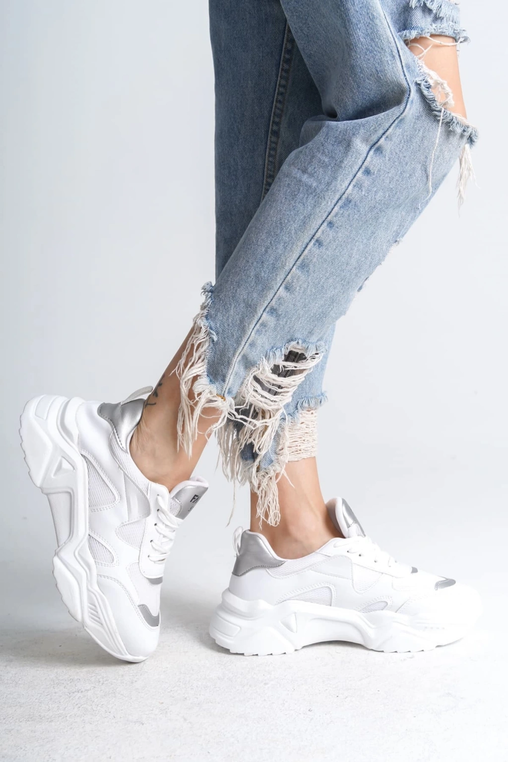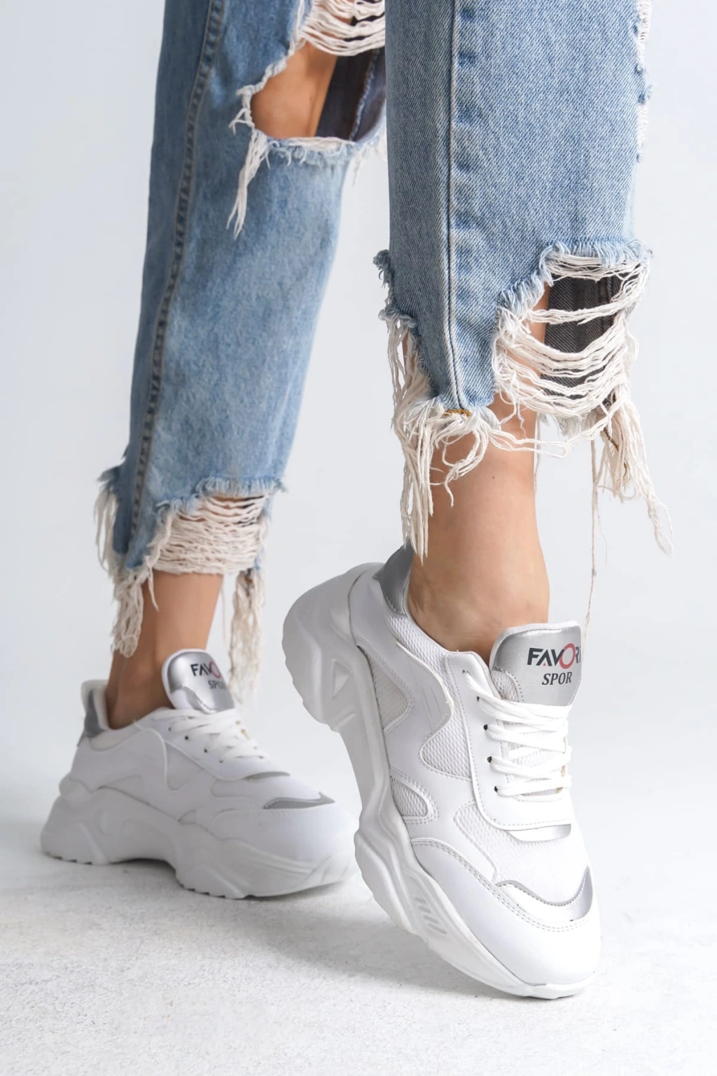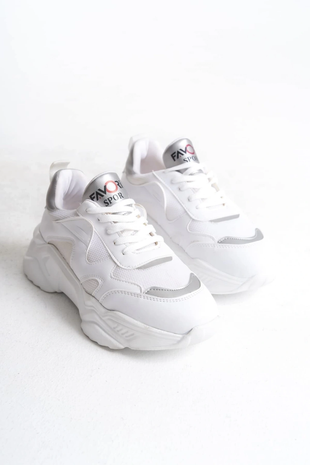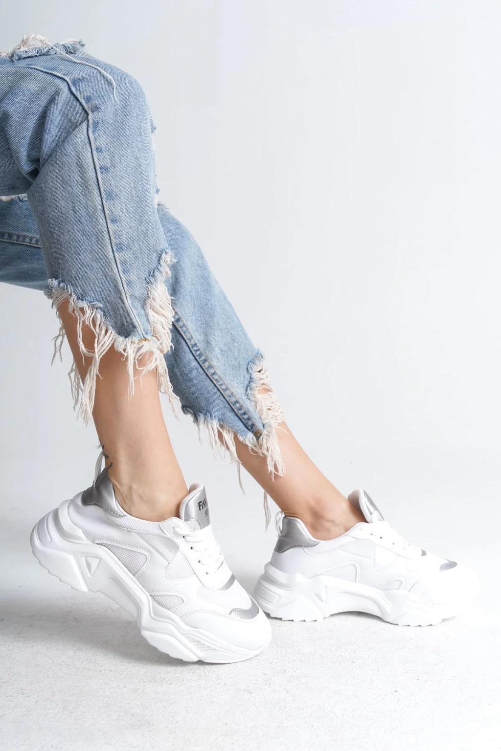 TOKYO Bağcıklı Ortopedik Taban Triko Detaylı Kadın Spor Ayakkabı TBT - Beyaz/Gri