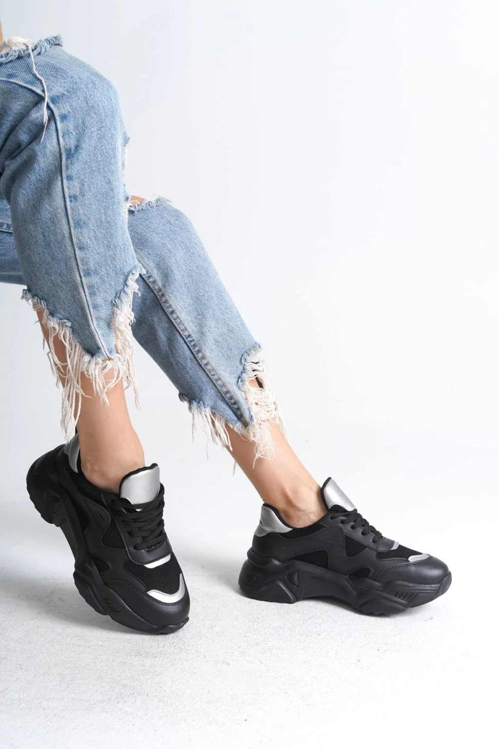 TOKYO Bağcıklı Ortopedik Taban Triko Detaylı Kadın Spor Ayakkabı TST - Siyah/Gri