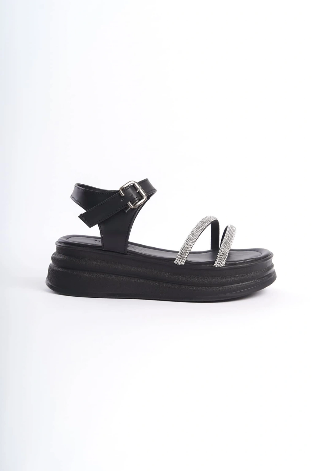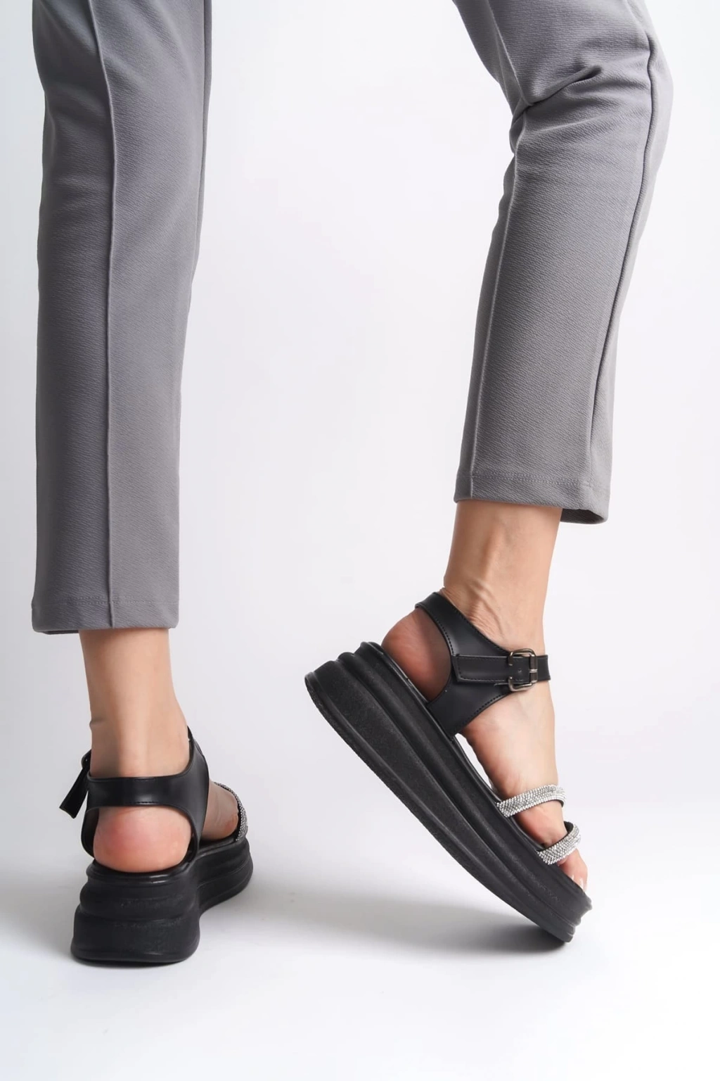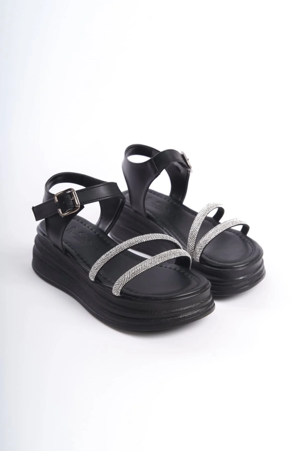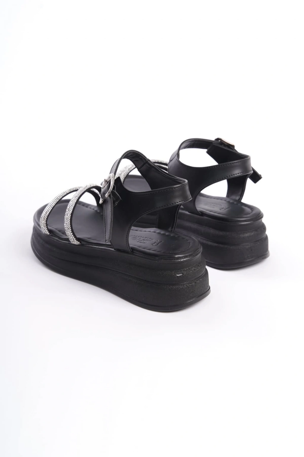 ZLOHE Kalın Tokalı Taşlı Şeritli Ortopedik Taban Kadın Sandalet CST - Siyah