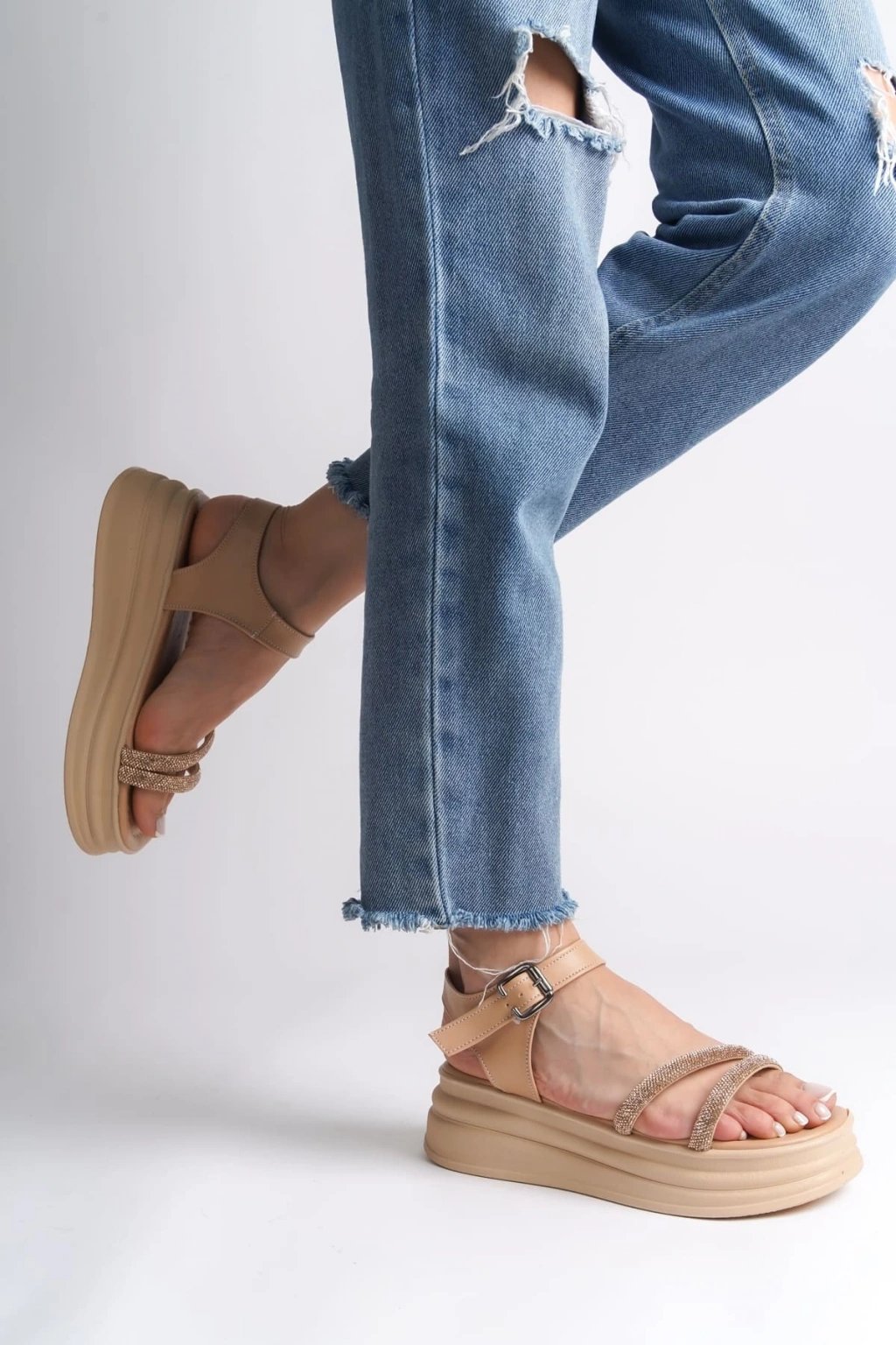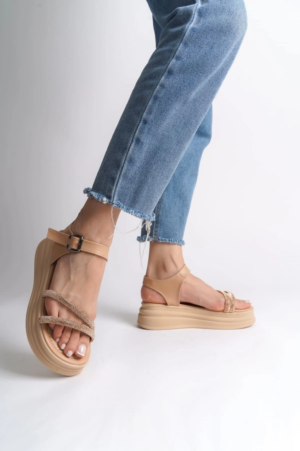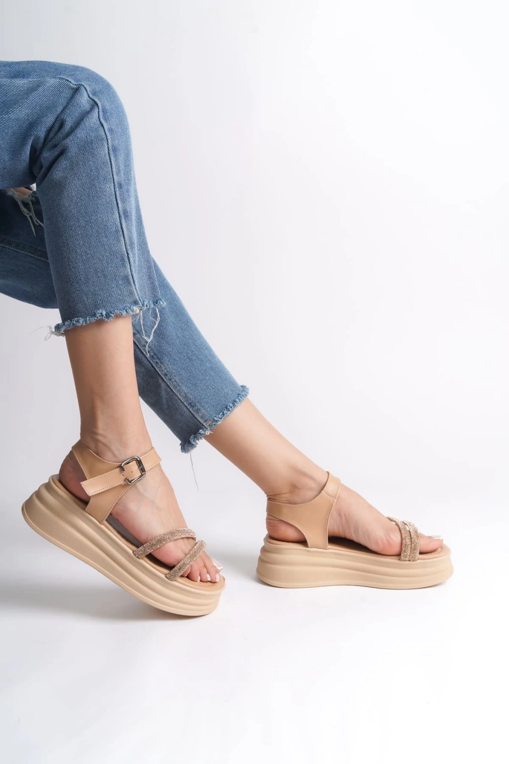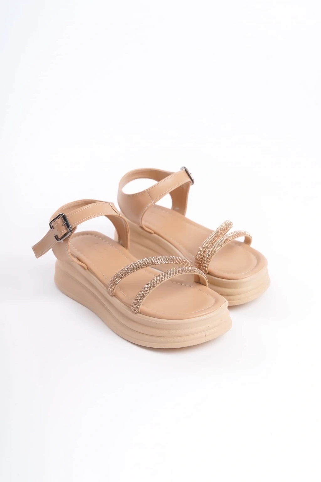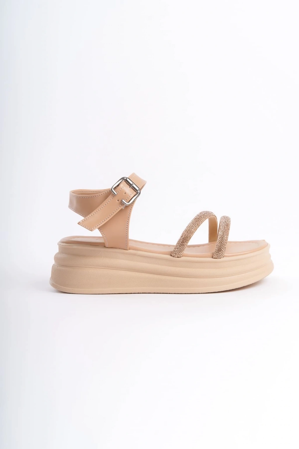 ZLOHE Kalın Tokalı Taşlı Şeritli Ortopedik Taban Kadın Sandalet CTT - Ten